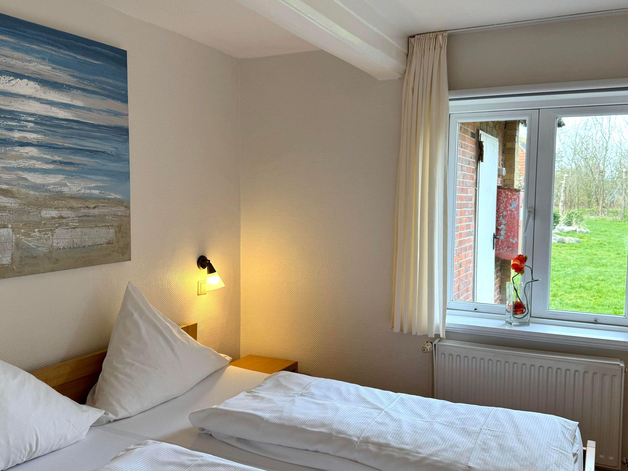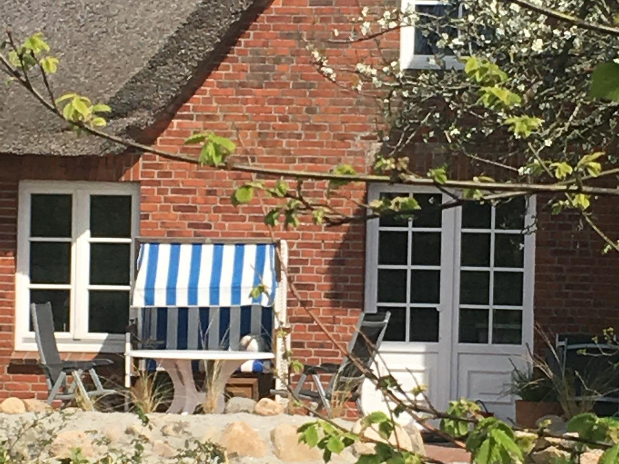 Modernisierte und renovierte Ferienwohnung unter Reet, in den Schlafräumen sind noch die alten Holzfußböden erhalten, der restliche Bereich wurde gefliest, sichtbare Deckenbalken und Füllungstüren geben der Wohnung den besonderen Charme. Vom Wohn-Essraum mit integrierter Wohnküche haben Sie direkten Zugang zur Südterrasse mit Strandkorb und Gartenmöbeln und natürlich zur großen Spiel-und Liegewiese. 2 Schlafzimmer mit Doppelbett (2 Matratzen 90x200cm), Wannenbad mit WC. Diele mit Garderobe. Parkplatz.