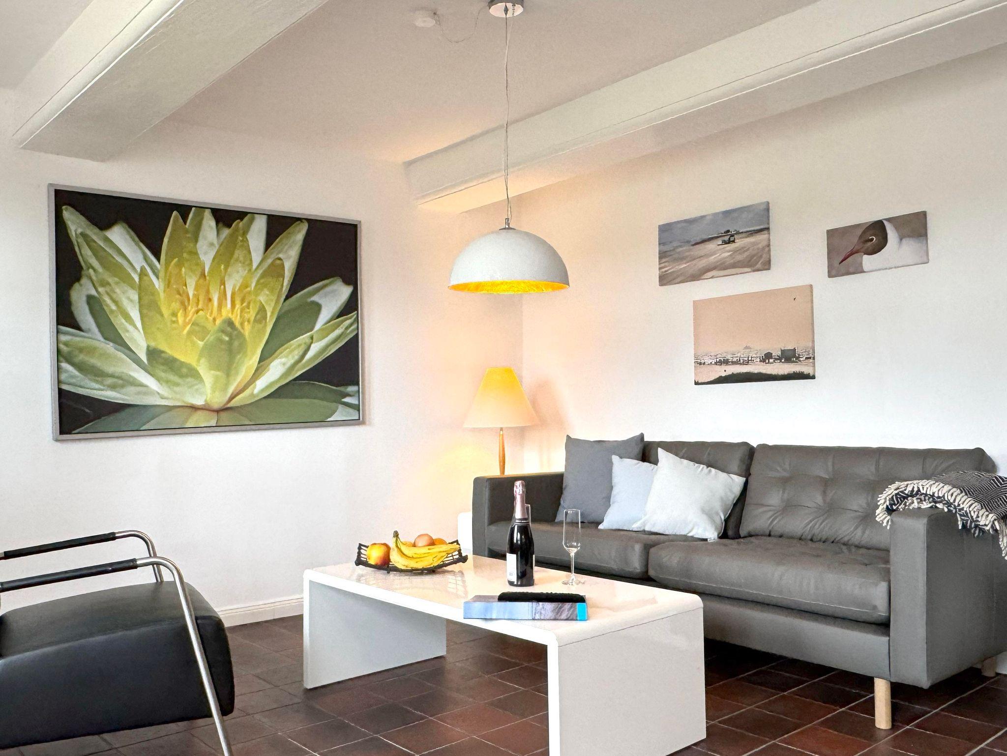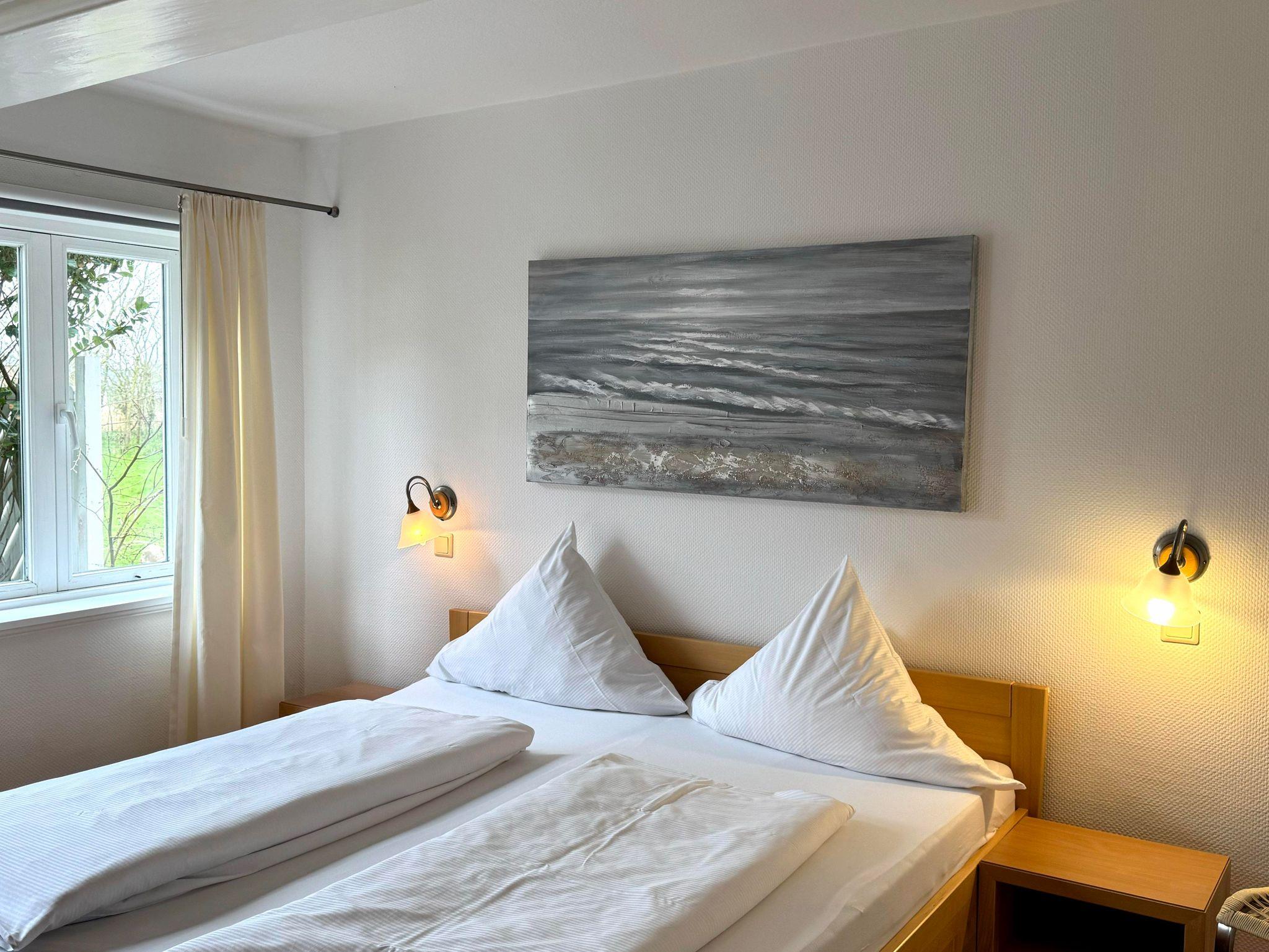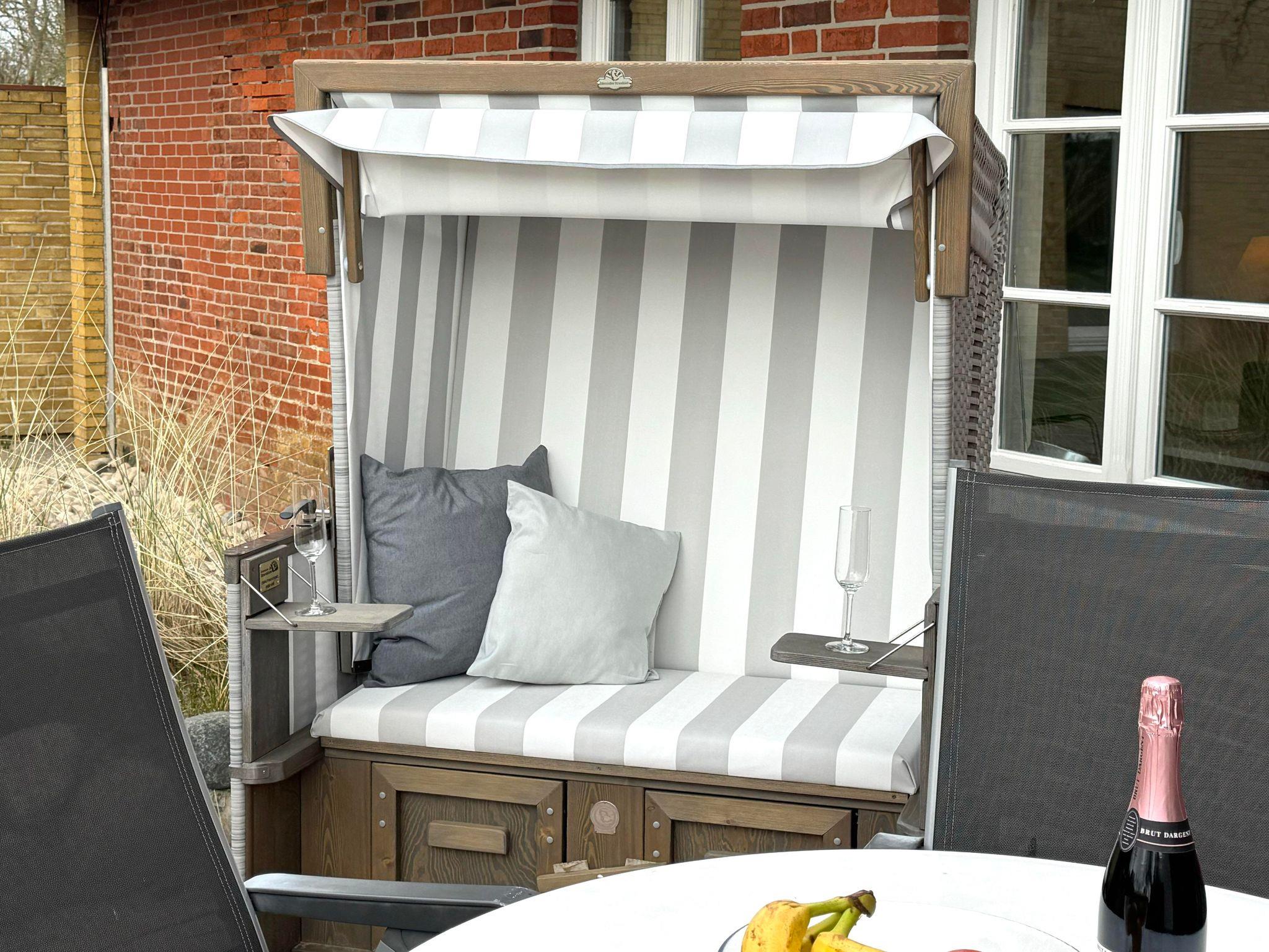 In den Schlafräumen sind noch die alten Holzfußböden erhalten, der restliche Bereich wurde gefliest, sichtbare Deckenbalken und Füllungstüren geben der Wohnung den besonderen Charme. Beide Wohnungen sind für 4 Personen ausgelegt und haben jeweilig Terrassen mit Strandkorb und Gartenmöbeln.