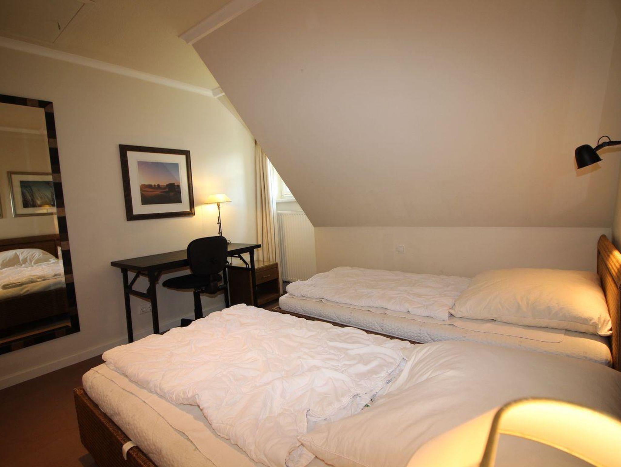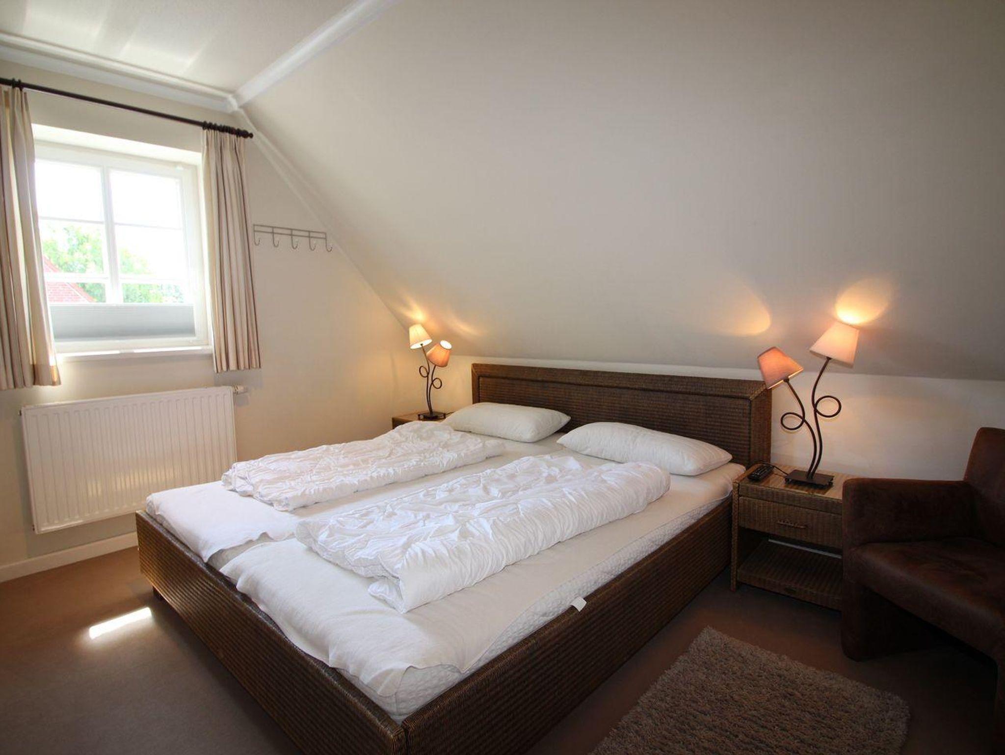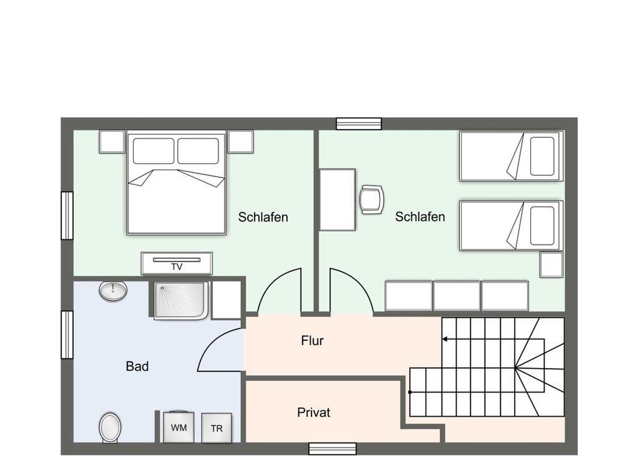 Über eine Holztreppe im Flur gelangt man in das Obergeschoss mit zwei Schlafzimmern. Eines verfügt über ein 180er Bett mit TV und das andere über 2 x 90er Einzelbetten. Außerdem ist im Obergeschoss ein Duschbad.