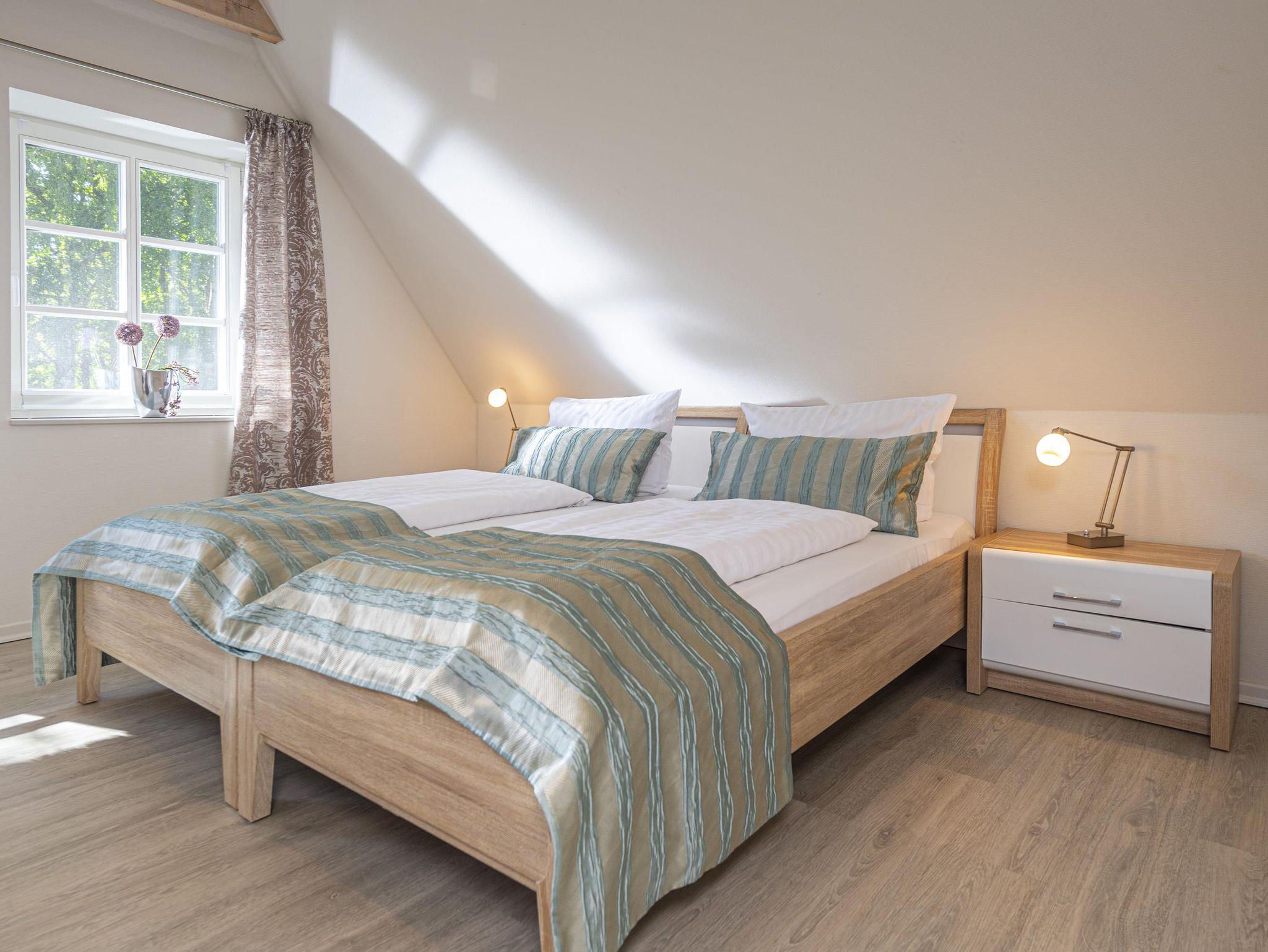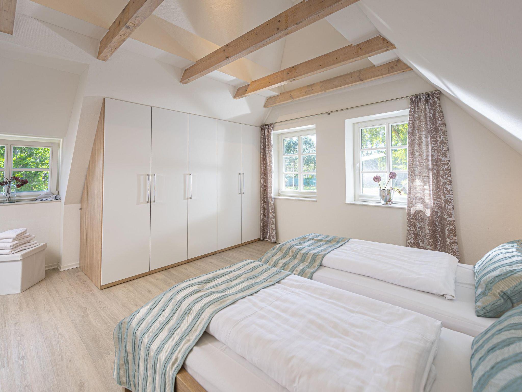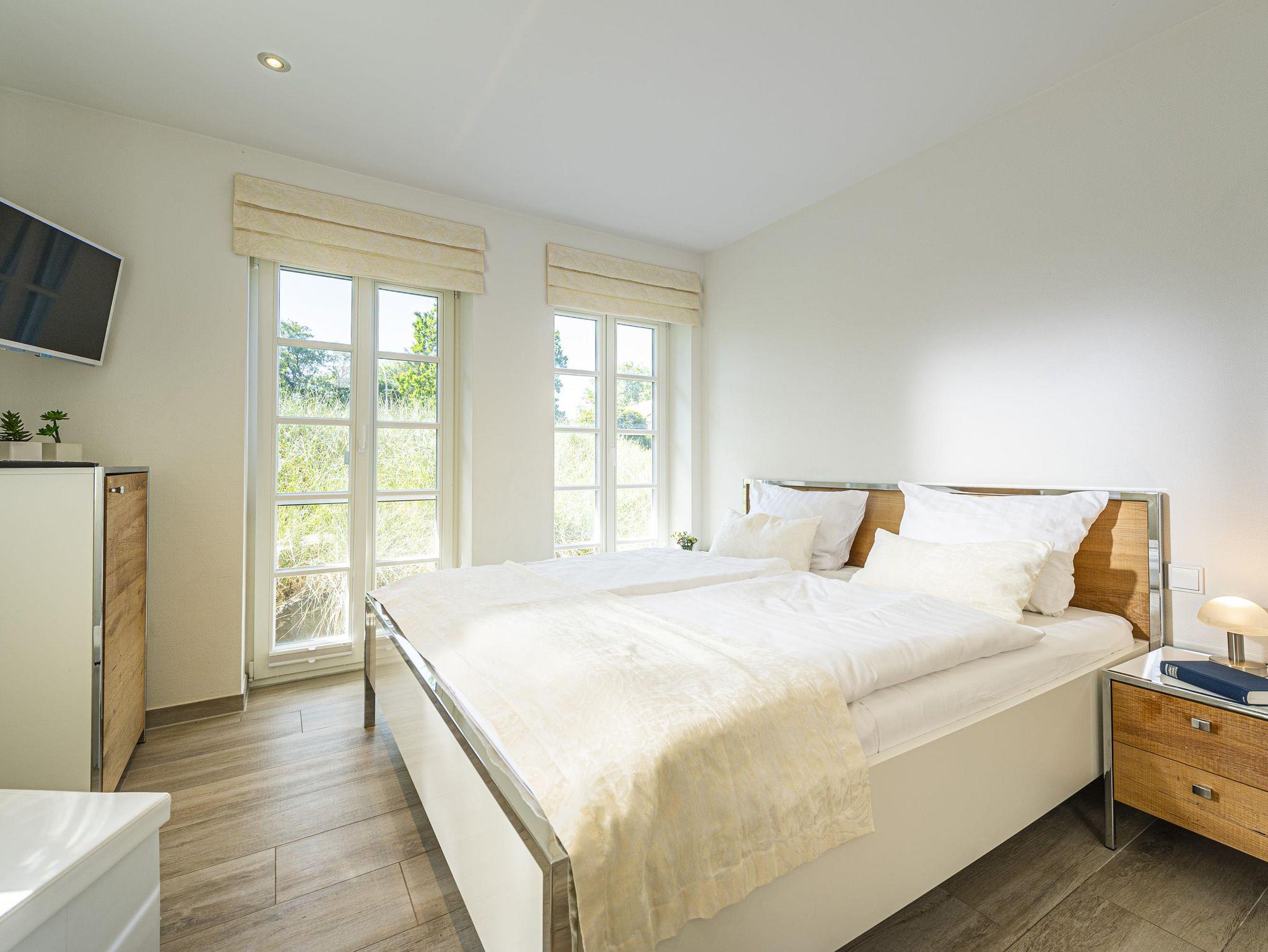 Im Obergeschoss befindet sich eine kleine Schreibecke, 2 Schlafzimmer. Eines hat ein Doppelbett, das andere zwei Einzelbetten, welche sich aber problemlos zusammenschieben lassen. Ausreichend Stauraum bieten die Einbauschränke. Jedes Schlafzimmer verfügt über einen Fernseher. Zudem finden Sie hier ein Wannenbad / WC mit separater Dusche. Entspannen können Sie in der großen Eckbadewanne, durch den Farblichtwechselmodus (Lichttherapie) erwartet Sie ein besonderer Komfort.