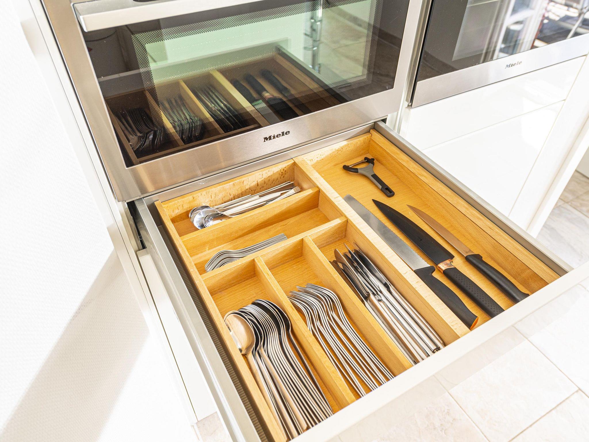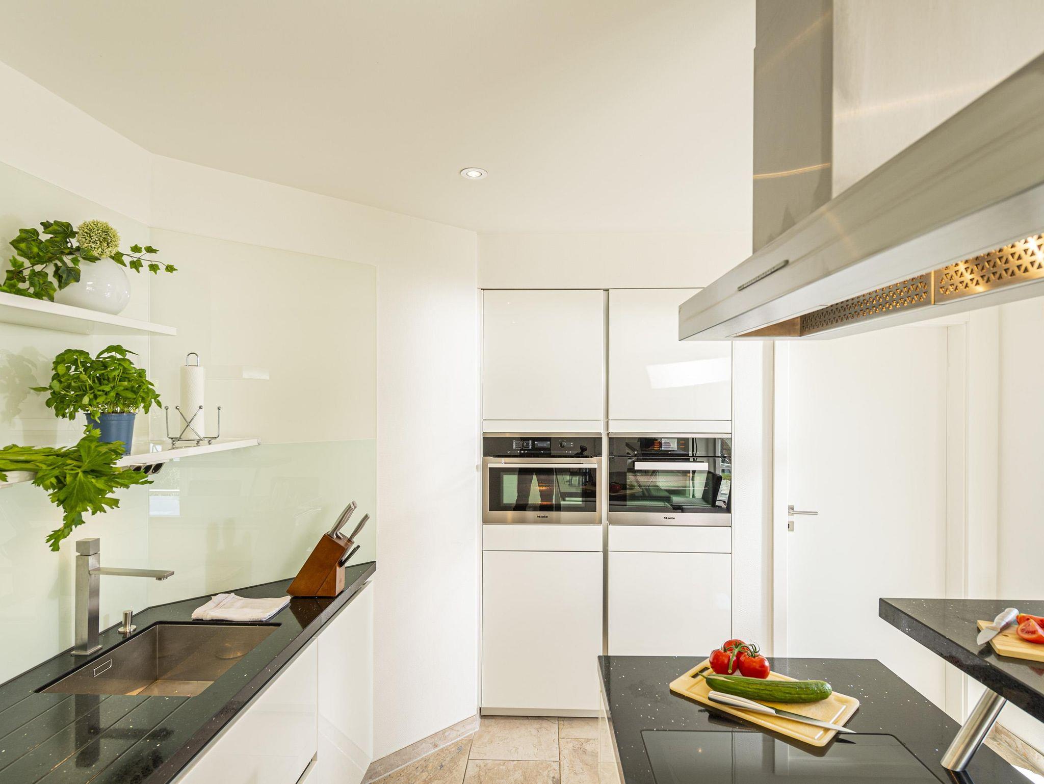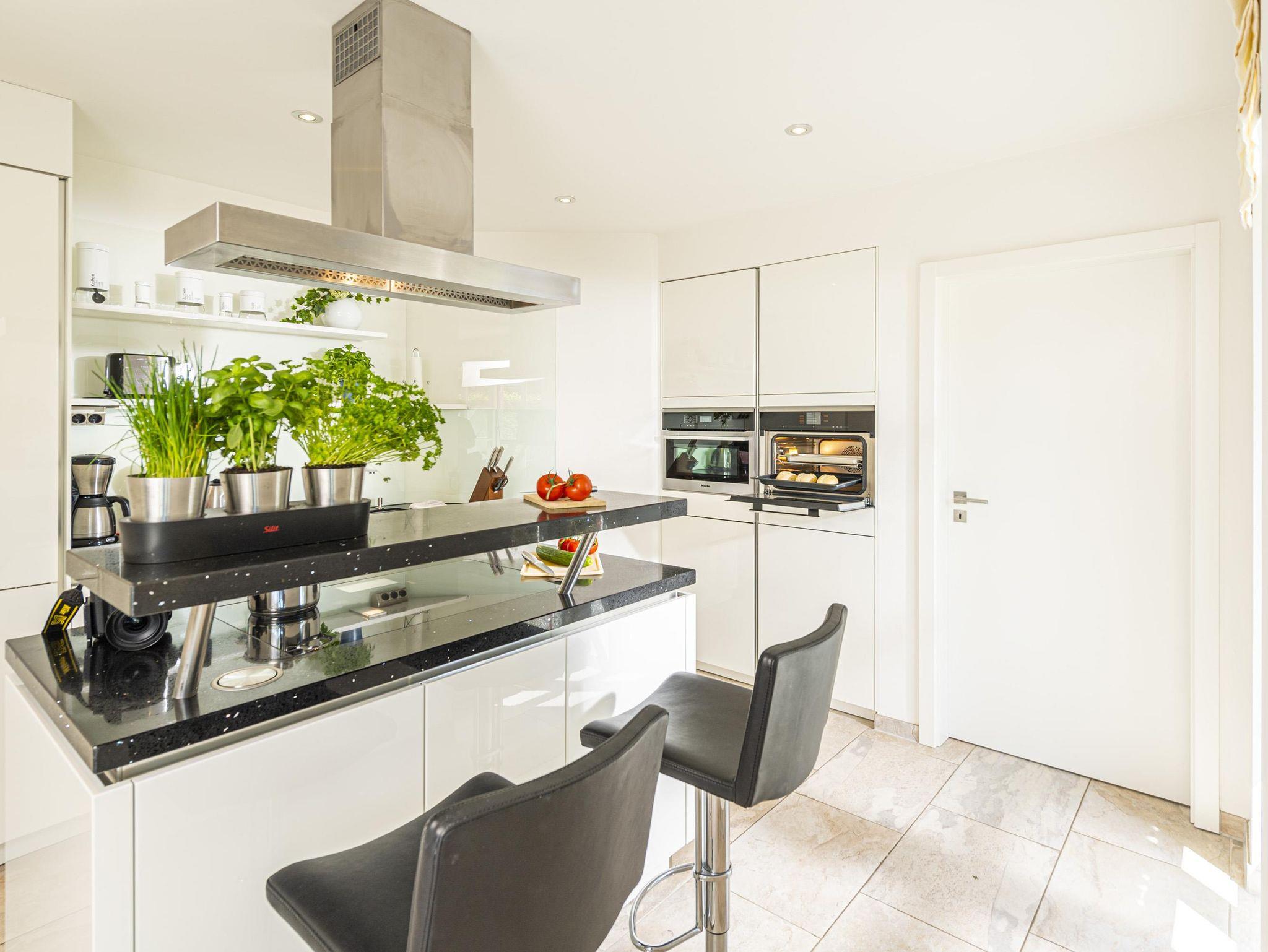 Im Erdgeschoss sind der Eingangsbereich, der Wohnraum mit offener Küche, der Essbereich, ein Kamin und der Zugang zur Terrasse. Zudem finden Sie dort ein Schlafzimmer mit Doppelbett (180 x 200 cm) und angegliedertem Duschbad / WC, ein separates Gäste-WC, ein Hauswirtschaftsraum und ein Abstellraum.