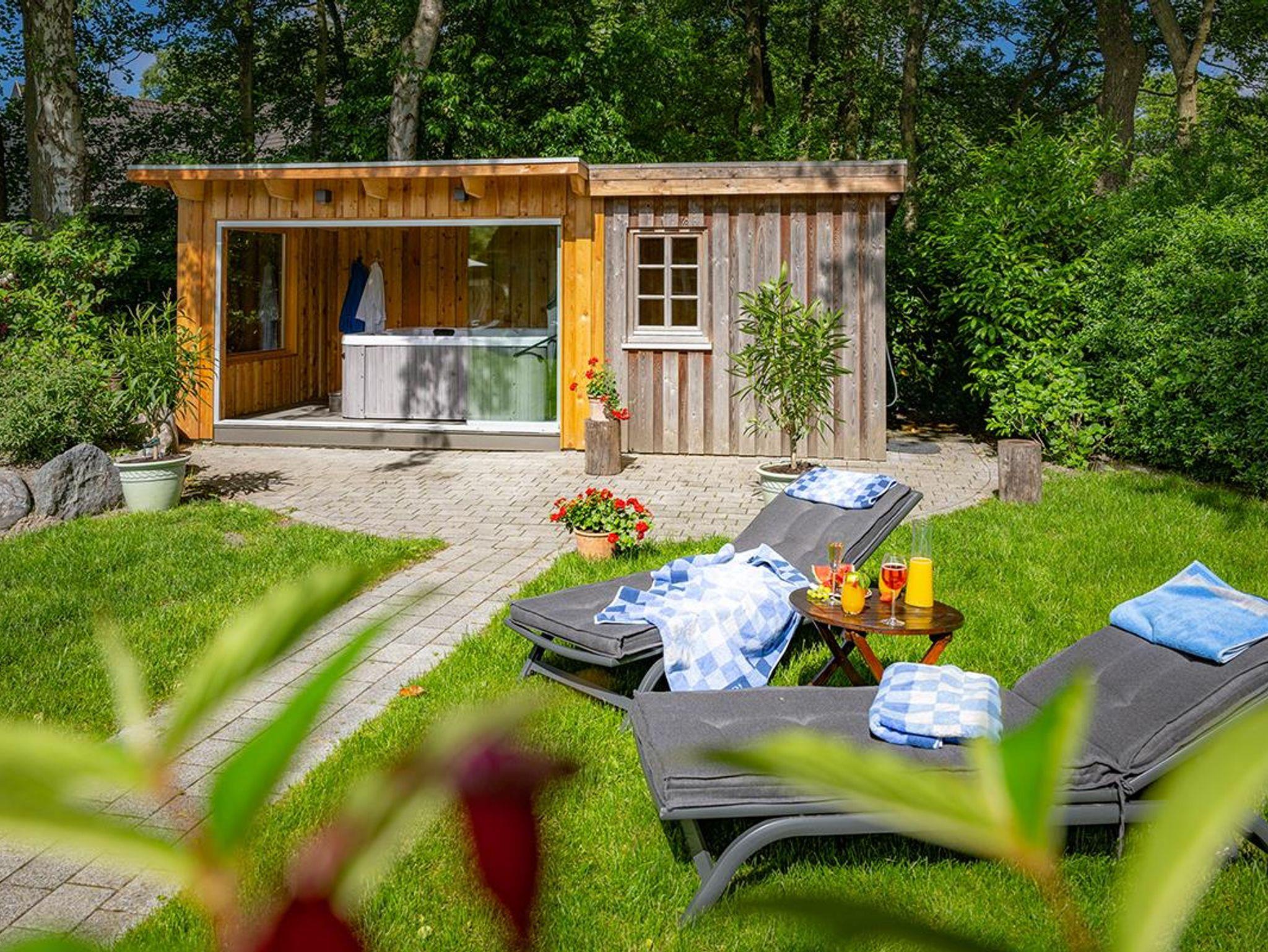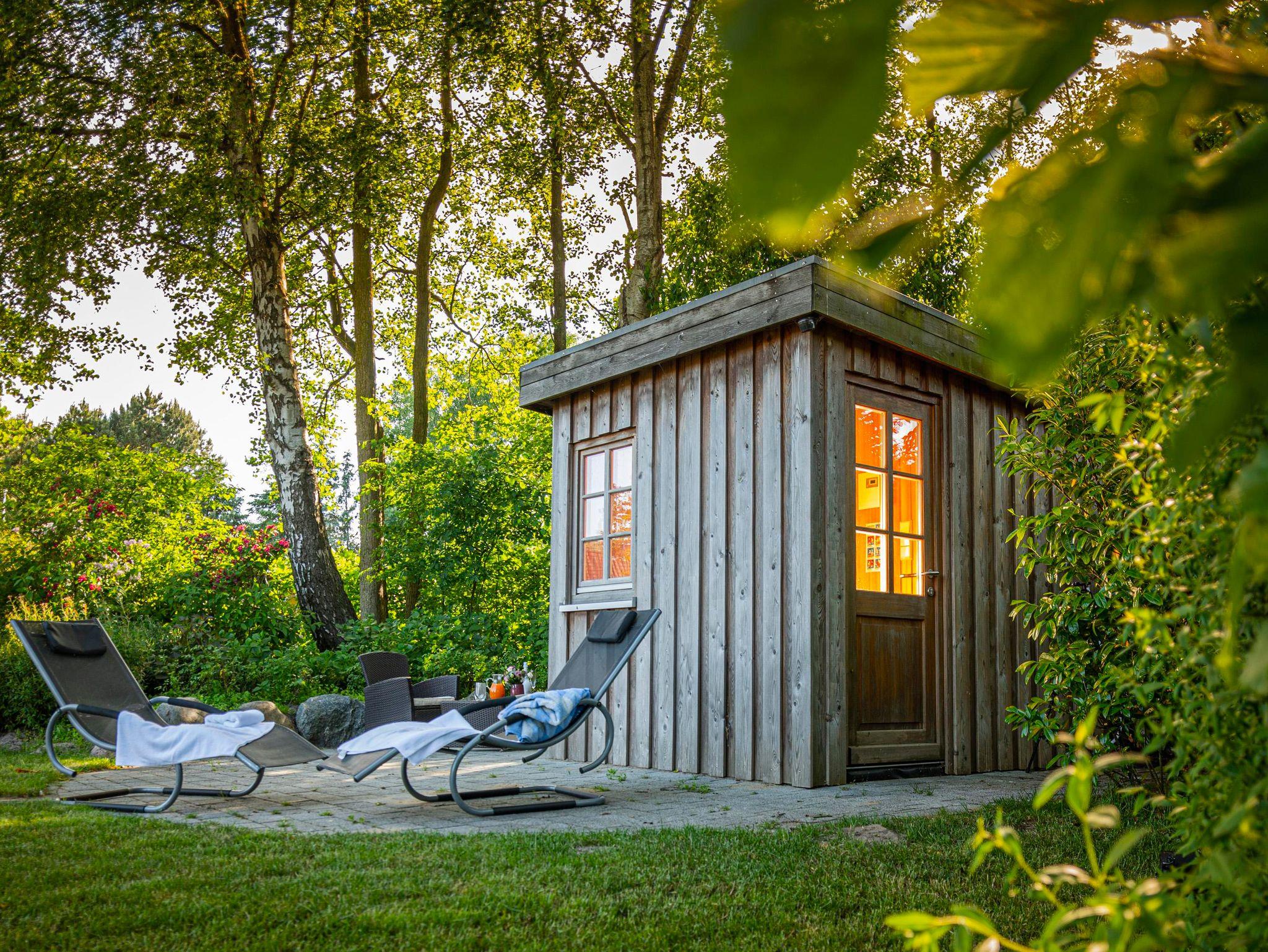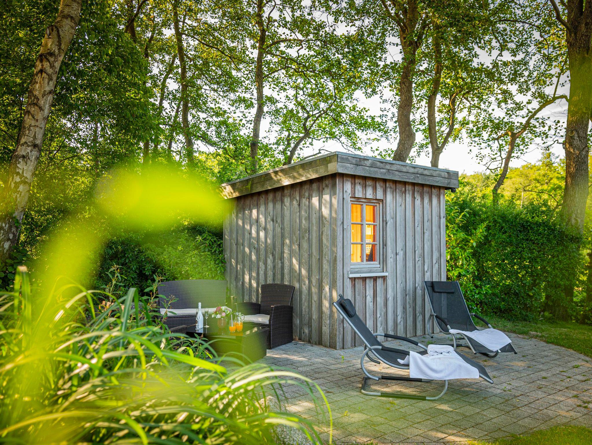 Die umläufige Terrasse (Süd- bzw. Westausrichtung) ist mit Terrassenmöbeln und einem Strandkorb ausgestattet. Im Garten erwartet Sie das besondere Highlight. Hier finden Sie geschützt, einen abgetrennten Bereich mit Blockhaus-Sauna, Außendusche und Terrasse mit Liegestühlen. Es gibt eine Unterstellmöglichkeit für Fahrräder.