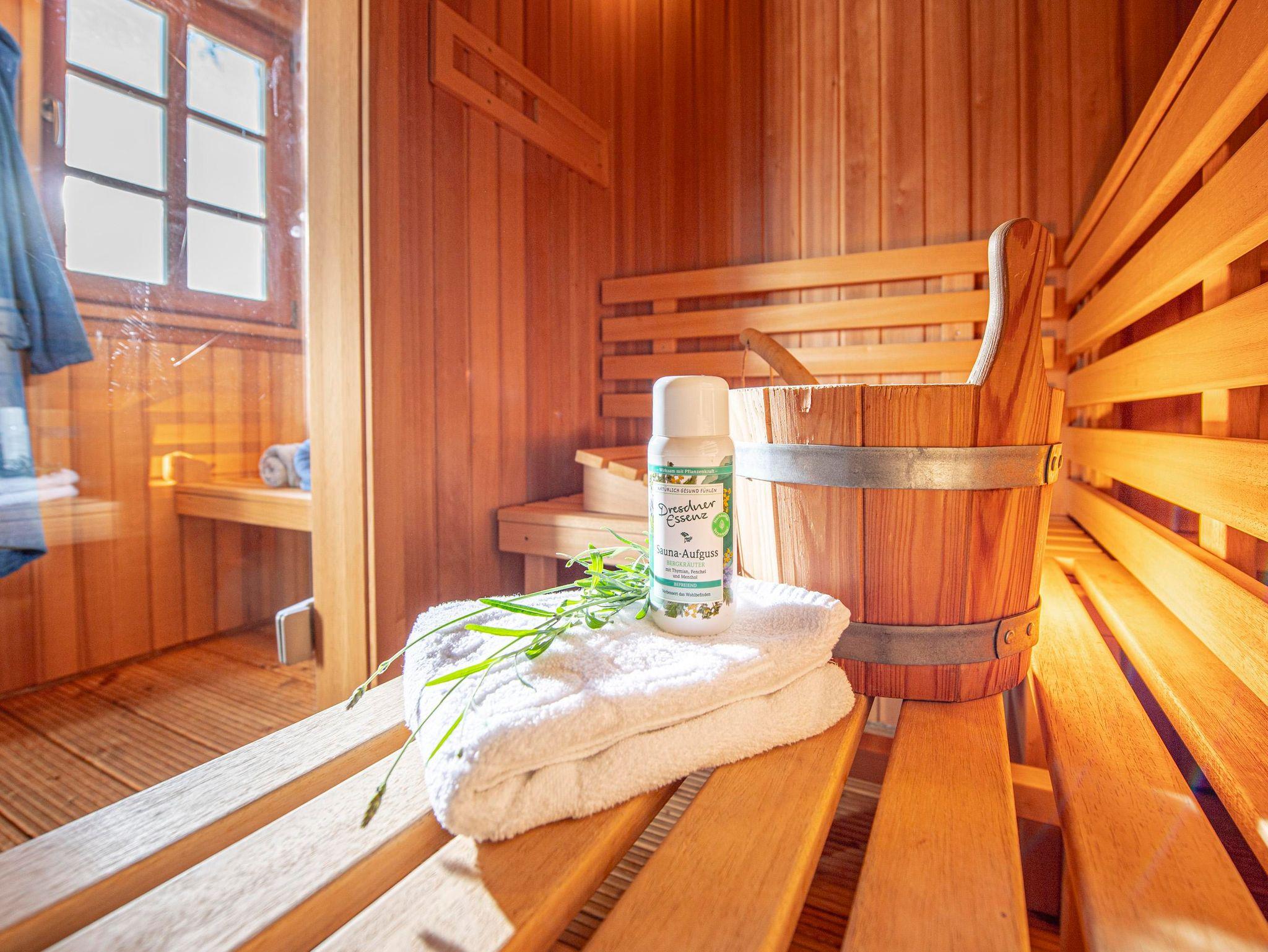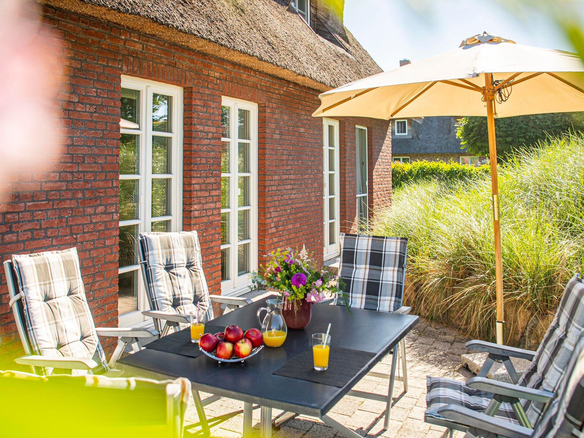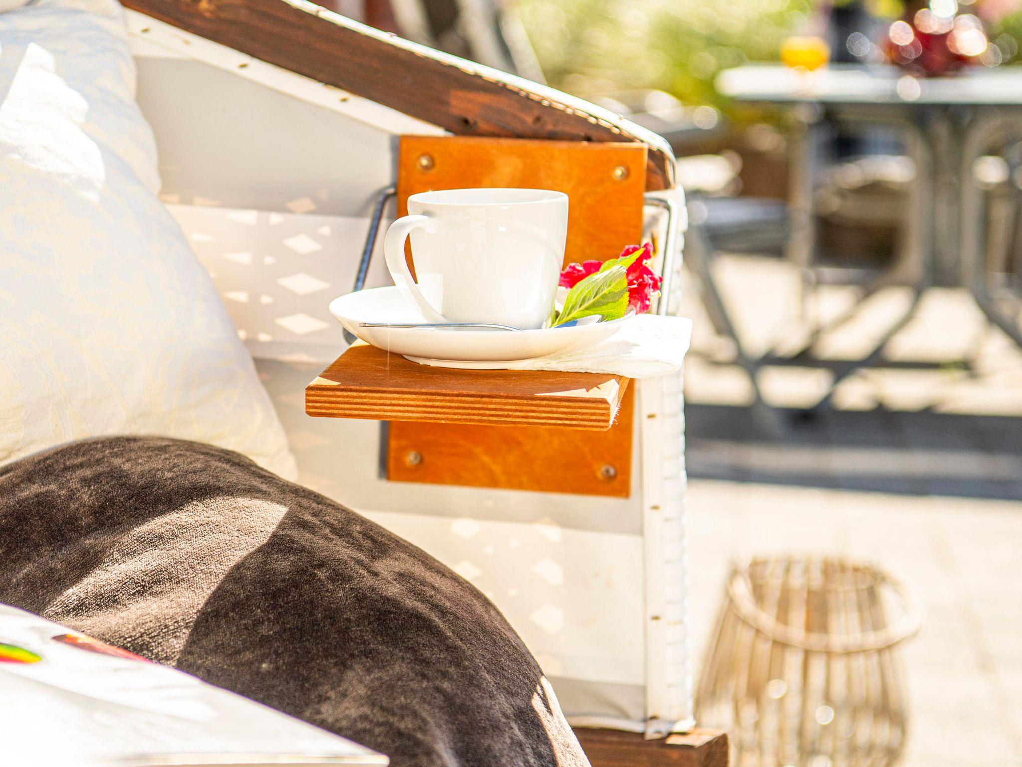 Die umläufige Terrasse (Süd- bzw. Westausrichtung) ist mit Terrassenmöbeln und einem Strandkorb ausgestattet. Im Garten erwartet Sie das besondere Highlight. Hier finden Sie geschützt, einen abgetrennten Bereich mit Blockhaus-Sauna, Außendusche und Terrasse mit Liegestühlen. Es gibt eine Unterstellmöglichkeit für Fahrräder.