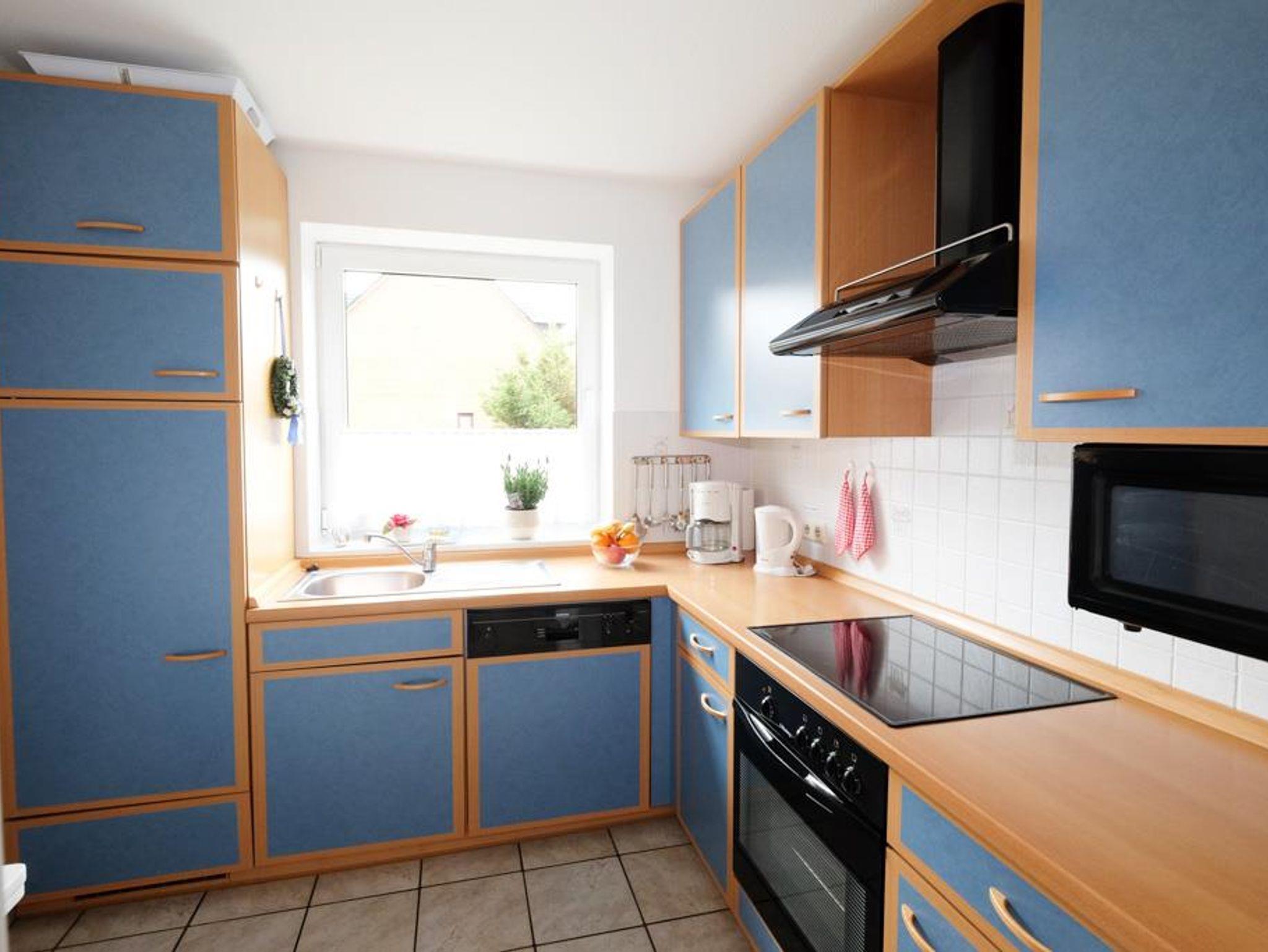 Eine moderne Küche u.a. mit Geschirrspüler, Backofen, Ceranfeld, Mikrowelle, Gefrierschrank,