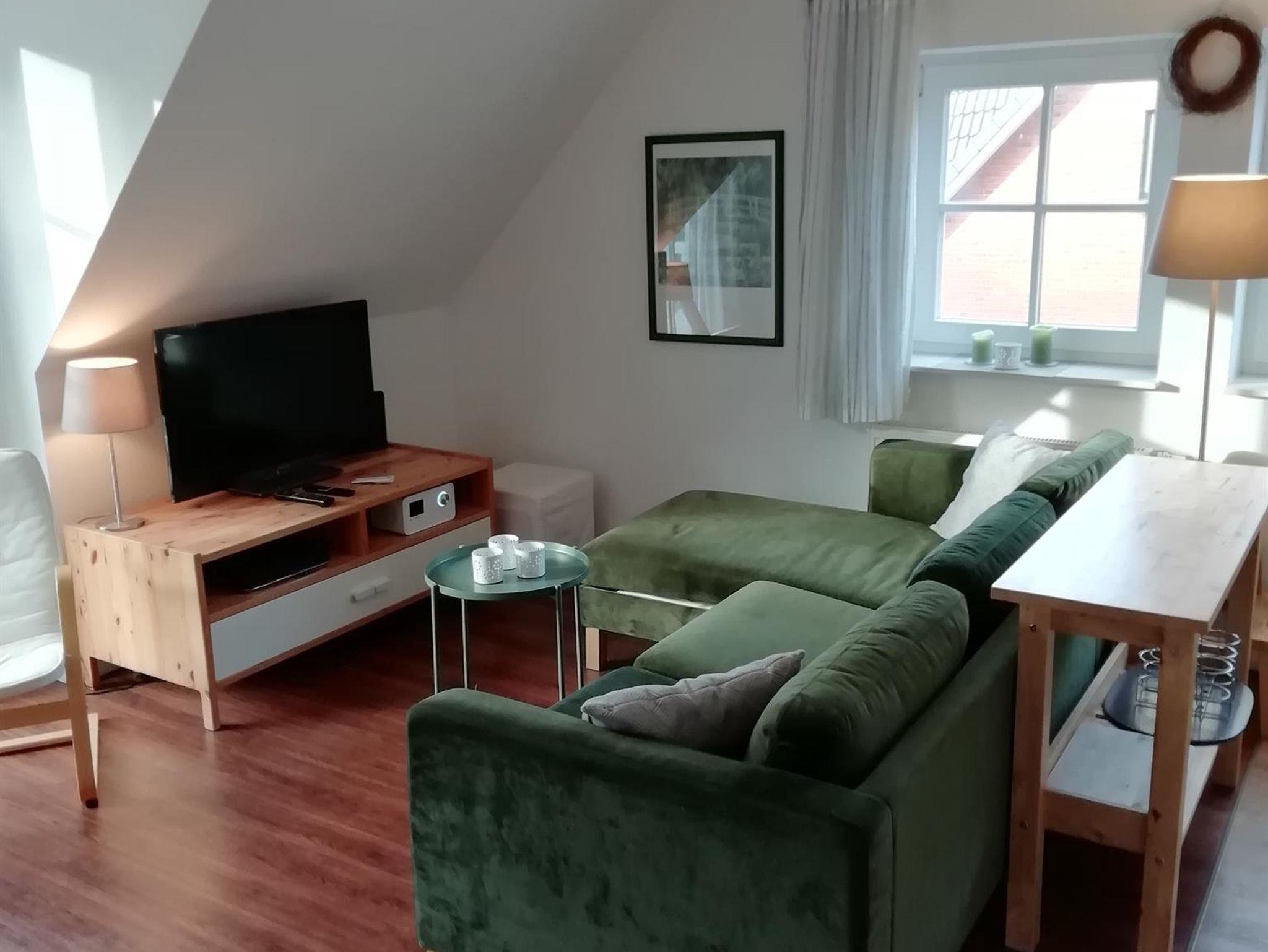 Die Ferienwohnung ist hell, freundlich und liebevoll eingerichtet. Sie ist ausgestattet mit einer Einbauküche mit Backofen, Mikrowelle, Geschirrspüler, Toaster, Wasserkocher und Kaffeemaschine, einer kleinen Essecke und einem gemütlichen Wohnbereich mit Radio und Kabel-TV und einem Zugang zum Balkon. Es steht auch eine Internetnutzung per WLAN zur Verfügung. Die Wohnung verfügt über ein Schlafzimmer mit Doppelbett und einem großen Schlafzimmer ebenfalls mit Doppelbett im Spitzboden. Für Kleinkinder stehen ein Reisebett und ein Kinderhochstuhl zur Verfügung. Im hellem Badezimmer ist eine Dusche vorhanden. Einen Fön stellen wir Ihnen ebenfalls zur Verfügung. Zur Ferienwohnung gehört auch ein gemeinschaftlicher Fahrradkeller und eine gemeinsame Waschmaschine. Die Wohnung und die Umgebung ist kinderfreundlich. Es handelt sich um eine Nichtraucherwohnung. Haustiere sind nicht erlaubt.