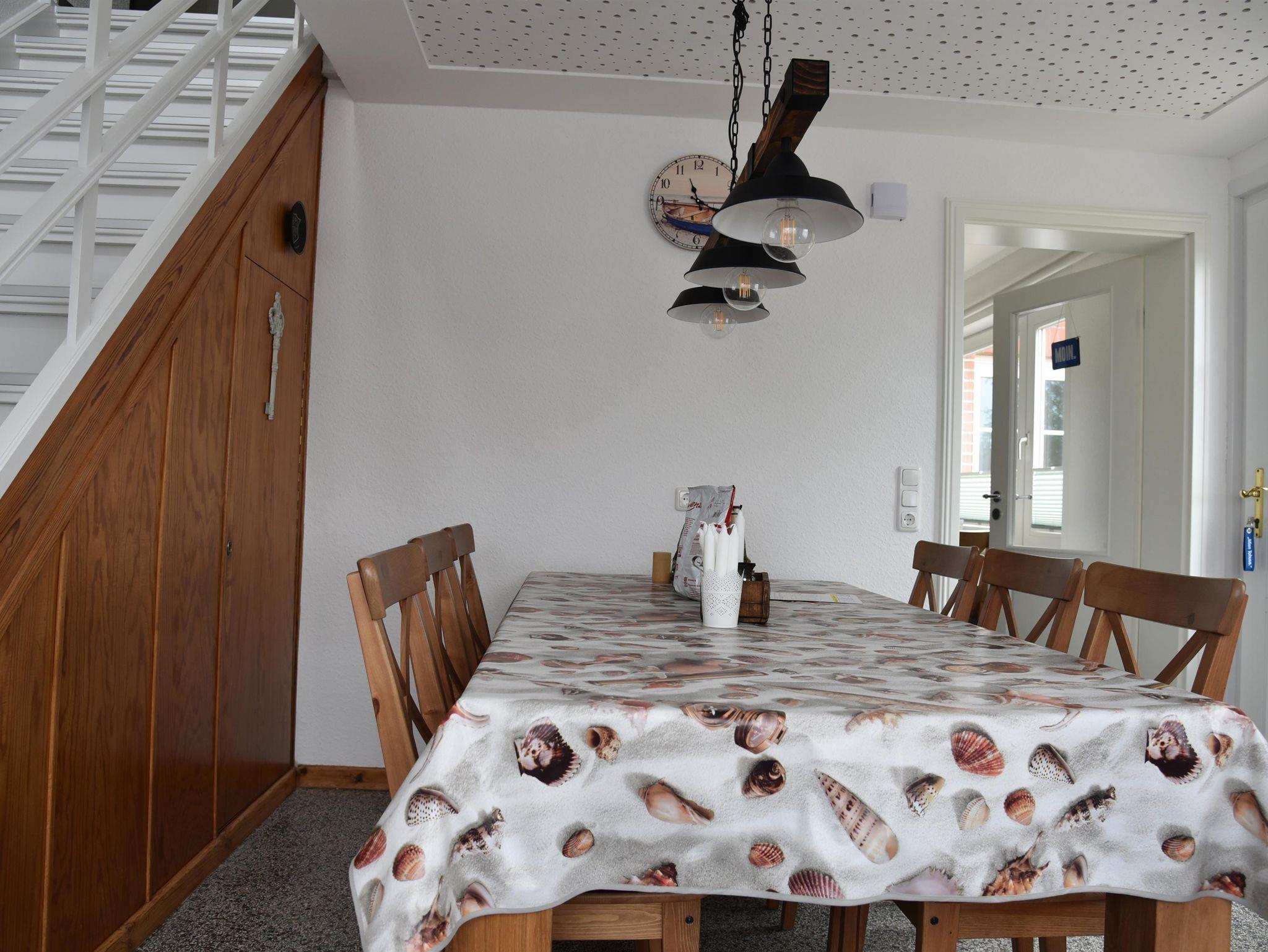 Sie betreten das Haus und gelangen in die großzügige Essdiele von der die offene Küche abgeht.