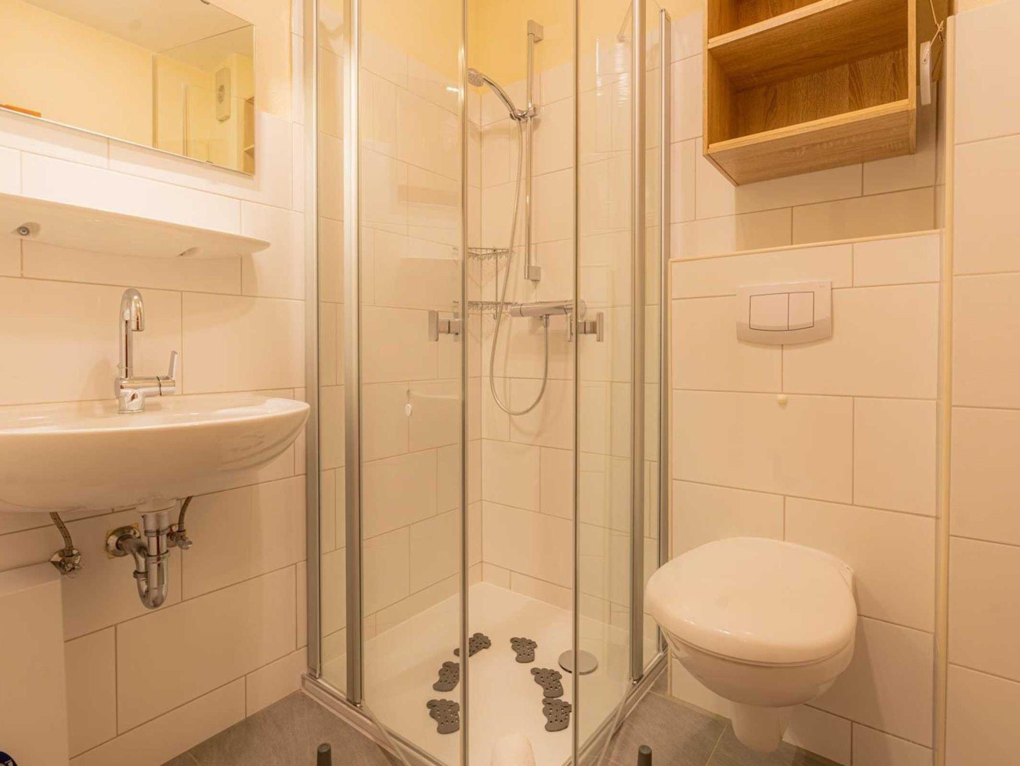 Badezimmer (Duschbad) mit Dusche, WC und Föhn.