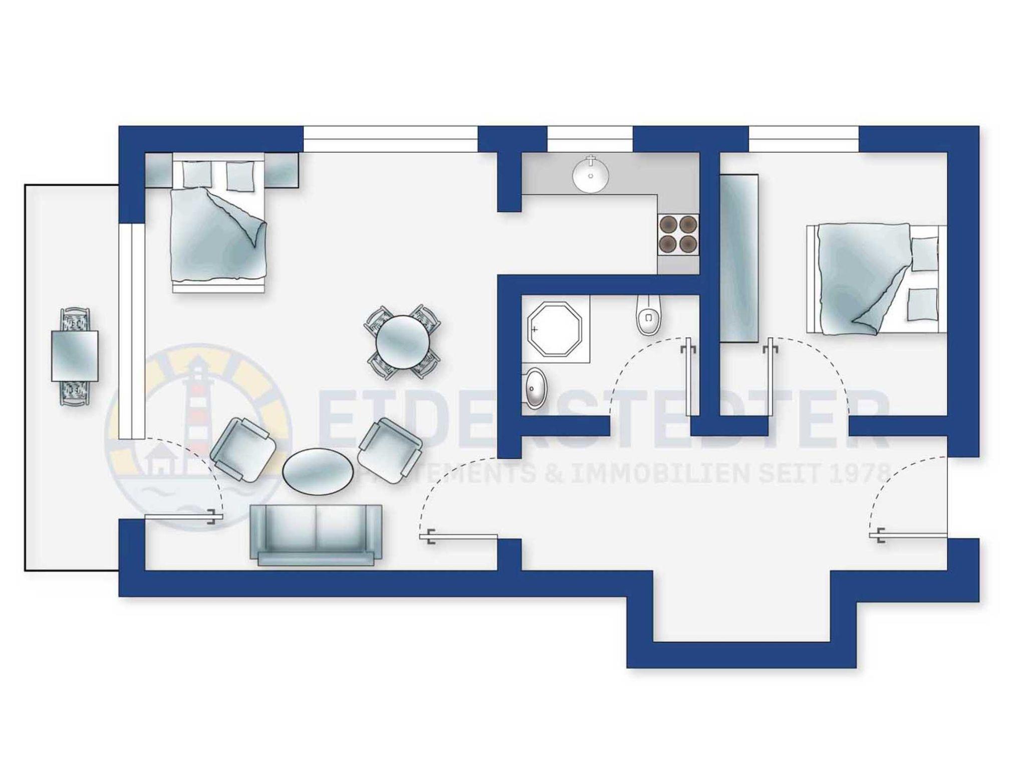 Gemütliche 2-Zimmer-Ferienwohnung im Haus Dünenblick mit ca. 42 qm auf 1 Ebene (EG) für bis zu 3 Personen. In ruhiger und strandnaher Lage im Ortsteil Dorf in St. Peter-Ording. Nur wenige Gehminuten von den Geschäften und Restaurants der Dorfstraße und vom Deich entfernt.