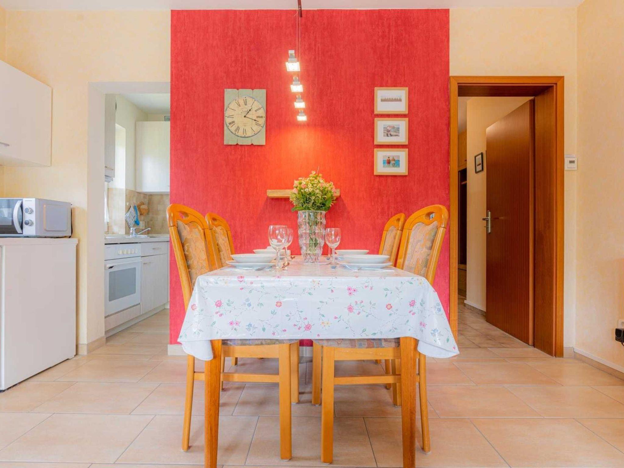Wohnzimmer mit Sofa, Sessel, TV (Sat), ausklappbarem Schrank-Doppelbett (2x 80x200cm) und Esstisch mit 4 Stühlen. Direkter Zugang zur möblierten Gartenterrasse nach Süden. Kleine halboffene Küche mit Backofen, Mikrowelle, Geschirrspüler und Kühlschrank mit Gefrierfach.