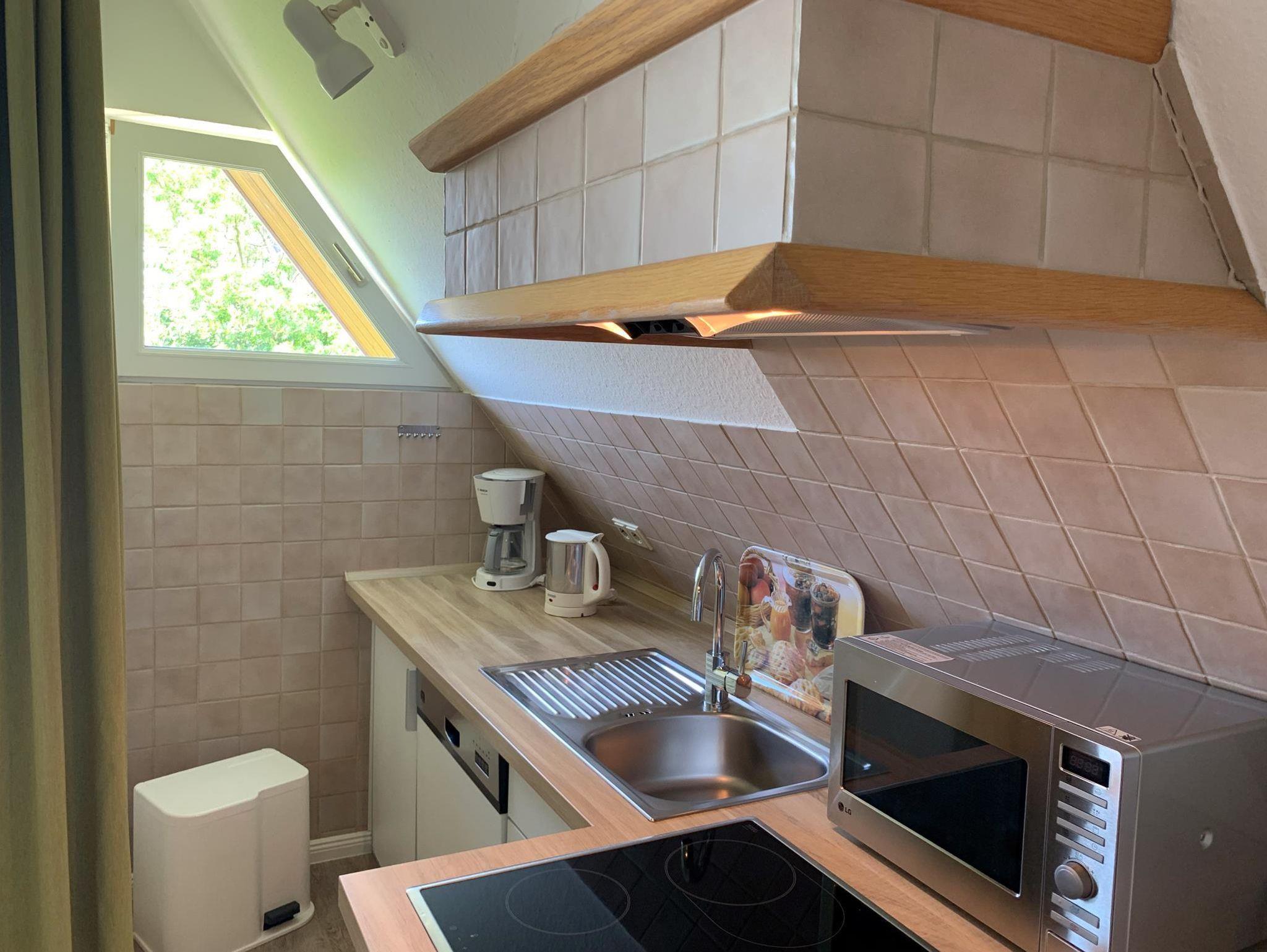 • komplett eingerichtete Küche mit Ceranfeld, Mikrowelle, Geschirrspüler, Kühlschrank mit Gefrierfach, Wasserkocher, Kaffeemaschine (Filter), Toaster.
