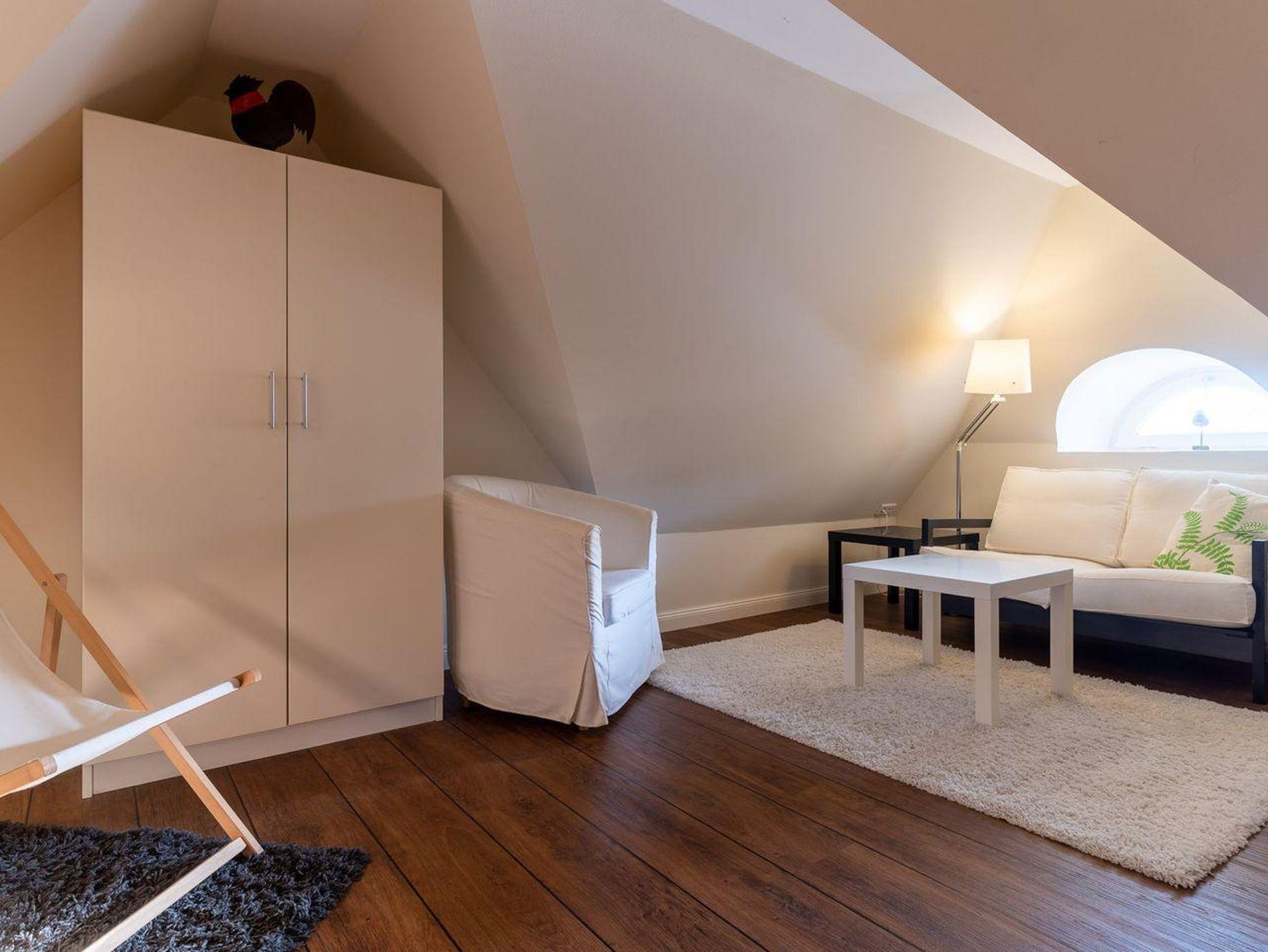 Das Apartment befindet sich im Obergeschoss und verfügt über ca. 80 m² Wohnfläche und teilt sich wie folgt auf: Auf der ersten Etage befindet sich ein großzügiger Wohnraum mit einer offenen Küche und einem gemütlichen Essbereich. Die Küche ist mit hochwertigen Geräten voll ausgestattet. Ein separates Duschbad bietet jeden Komfort. Im stilvollen Schlafzimmer mit 1,8 x 2,0 m Doppelbett können Sie herrlich entspannen. Über eine Treppe gelangen Sie in das Dachgeschoss, wo sich ein weiteres Schlafzimmer mit 2 Einzelbetten und einer gemütlichen Sitzecke sowie TV befindet. Mit viel Liebe zum Detail wurde großen Wert auf die Inneneinrichtung gelegt. Carpe Diem!