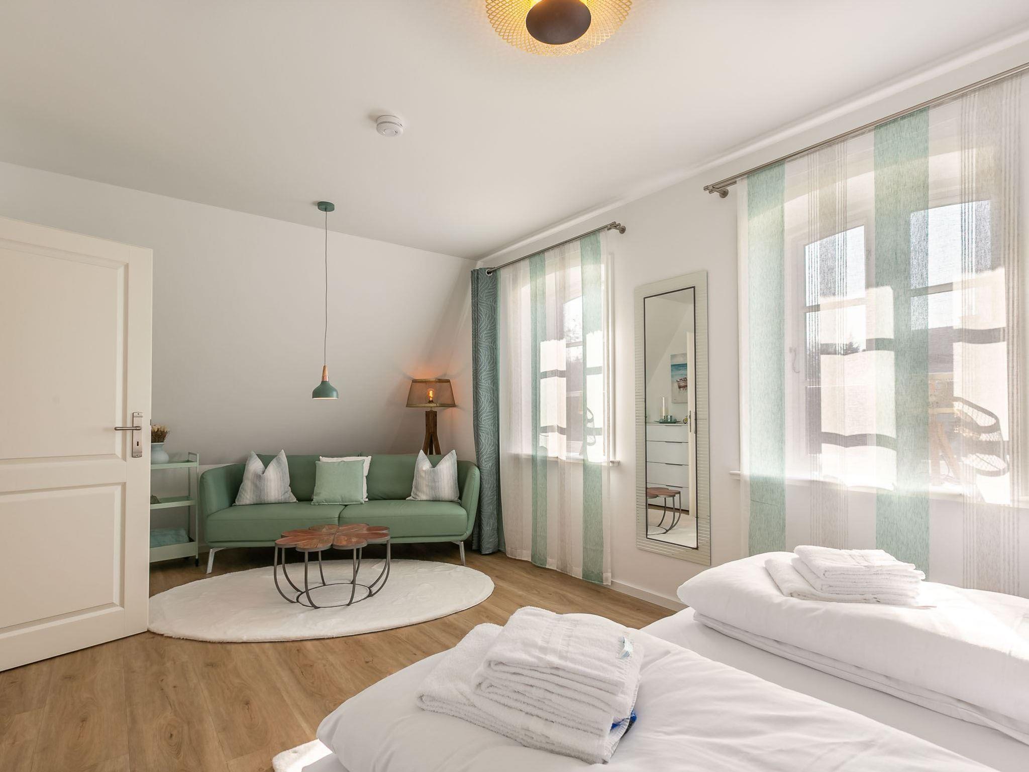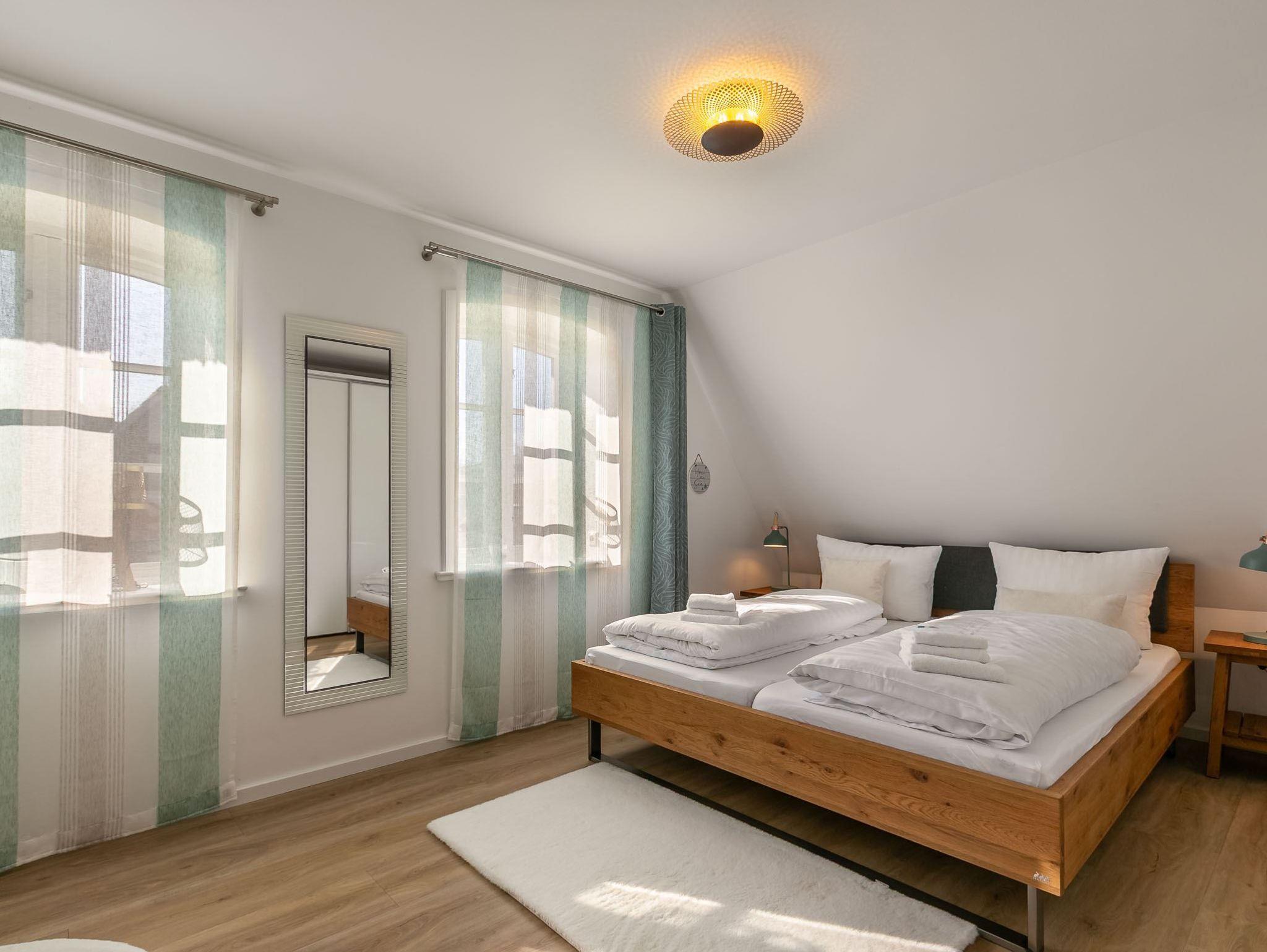 2. Schlafzimmer (OG) mit Doppelbett (2x 90x200cm), Ledersofa, Ganzkörperspiegel, Kleiderschrank und Kommode.
