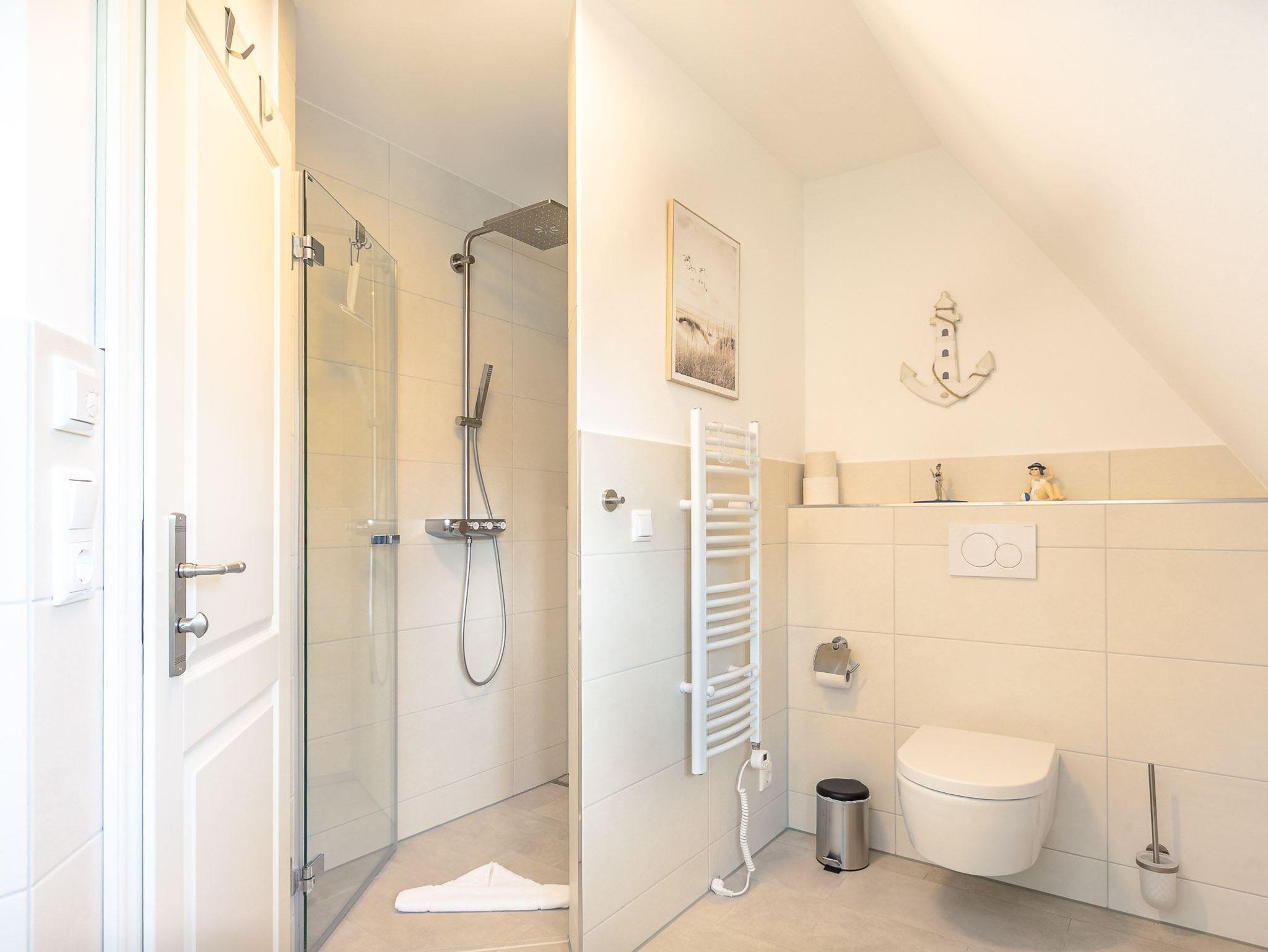 2. Bad (OG) mit ebenerdiger Regen-Dusche, WC, Handtuchwärmer, Tageslicht und Föhn.