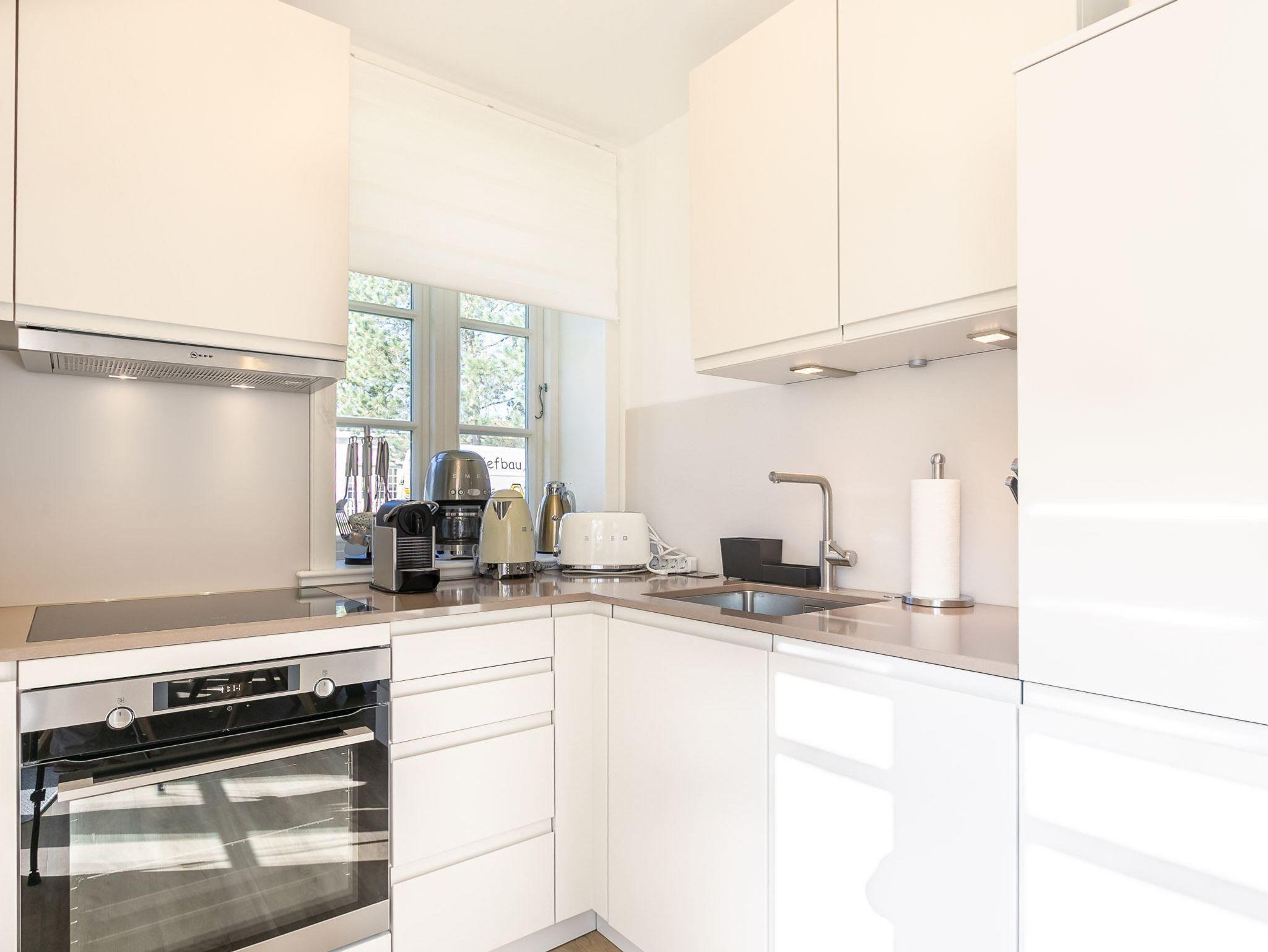Offene Küche mit Backofen, Mikrowelle, Kühlschrank mit Gefrierfach, Geschirrspüler und Krups Nespresso Kapsel-Kaffeemaschine.