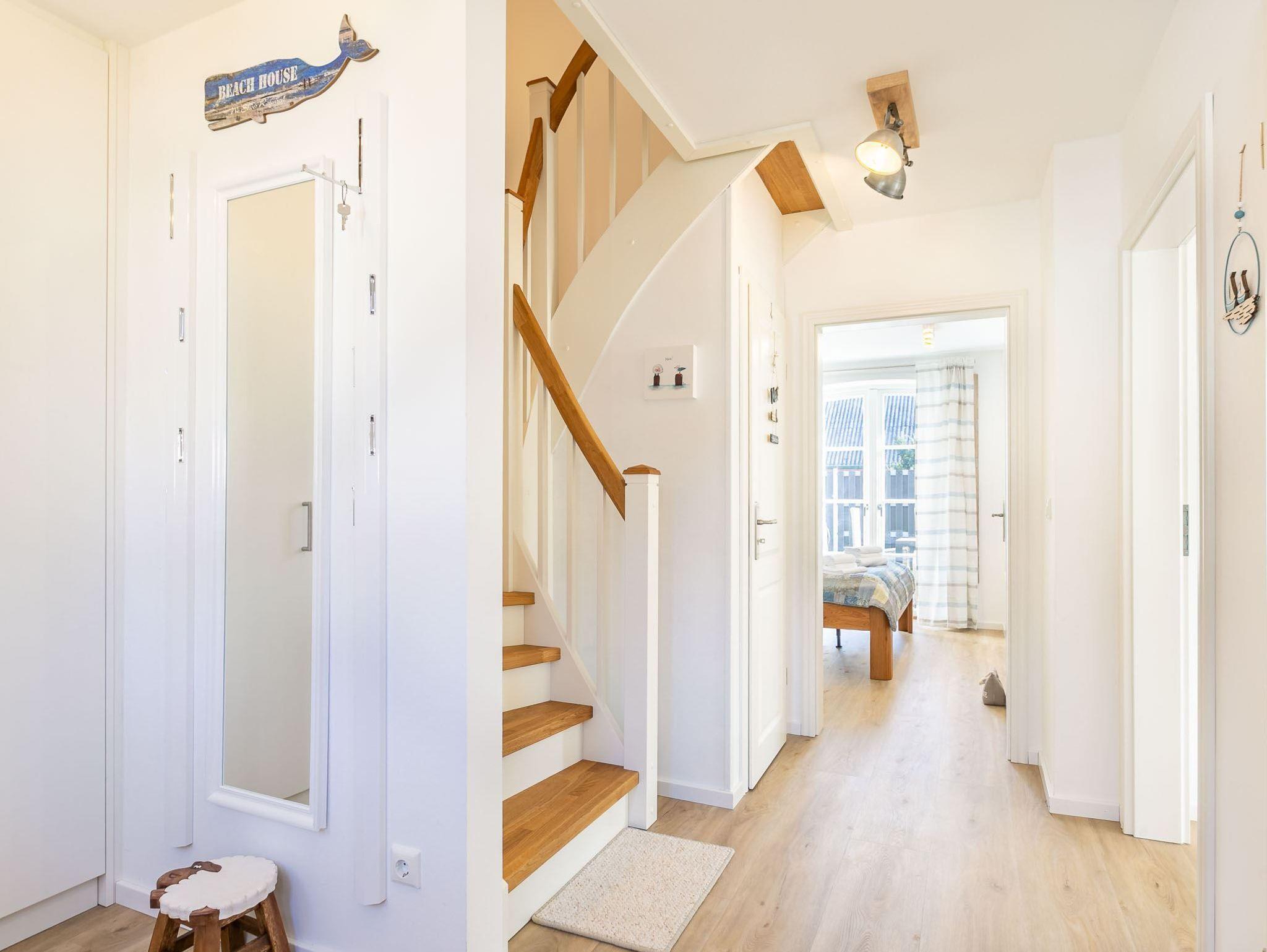 Flur mit Garderobe, Spiegel und Schuhablage im Eingangsbereich.