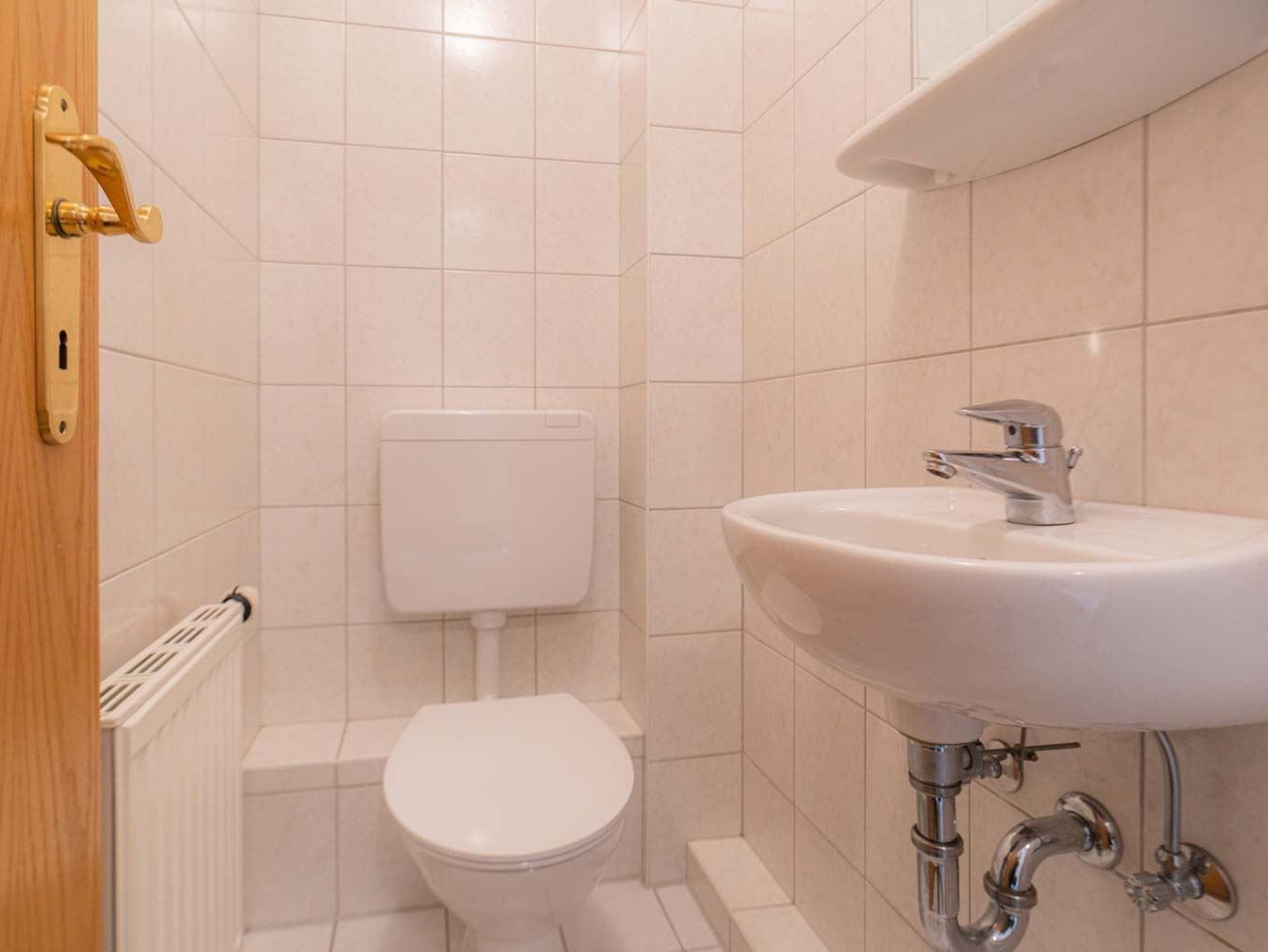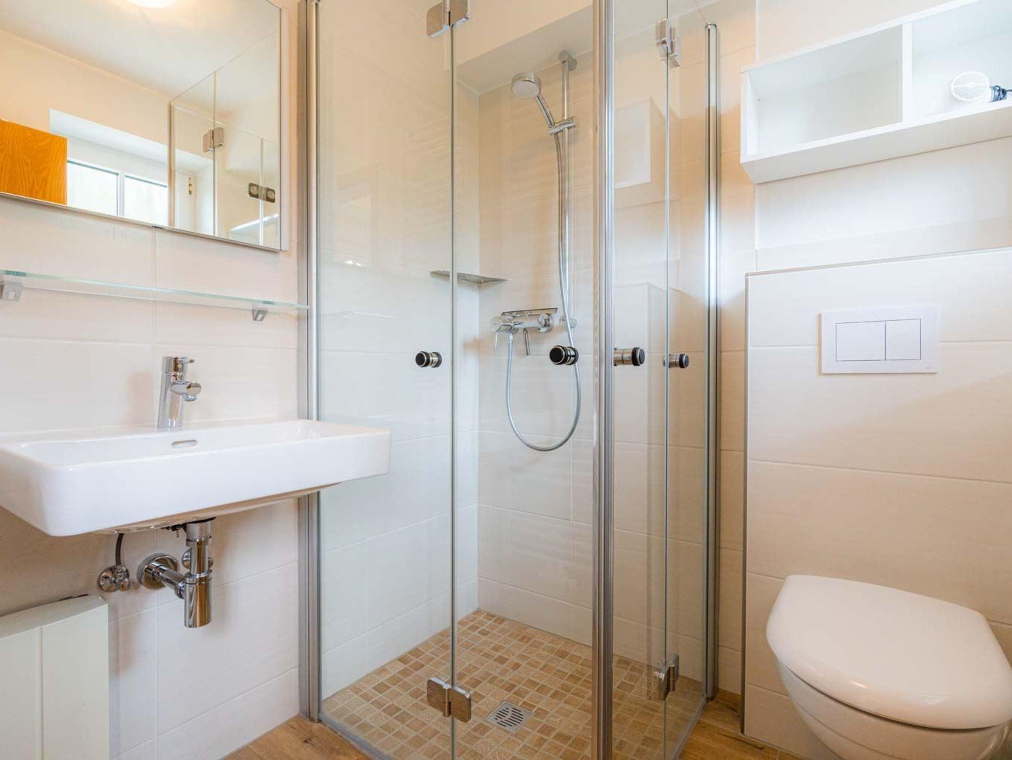 Badezimmer (Duschbad) mit Dusche, WC, Heizkörper und Tageslicht. Separates Gäste-WC vorhanden.