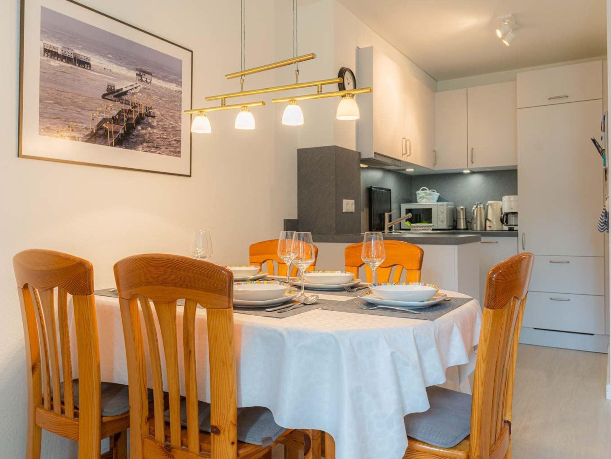 Wohnzimmer mit Sofa (3er), 2 Sesseln, TV (Kabel) und Esstisch mit 5 Stühlen. Direkter Zugang zur windgeschützten, möbierten Terrasse nach Süden mit gemeinschaftlichem Garten. Offene Küche mit Backofen, Mikrowelle, Kühlschrank mit Gefrierfach und Geschirrspüler.