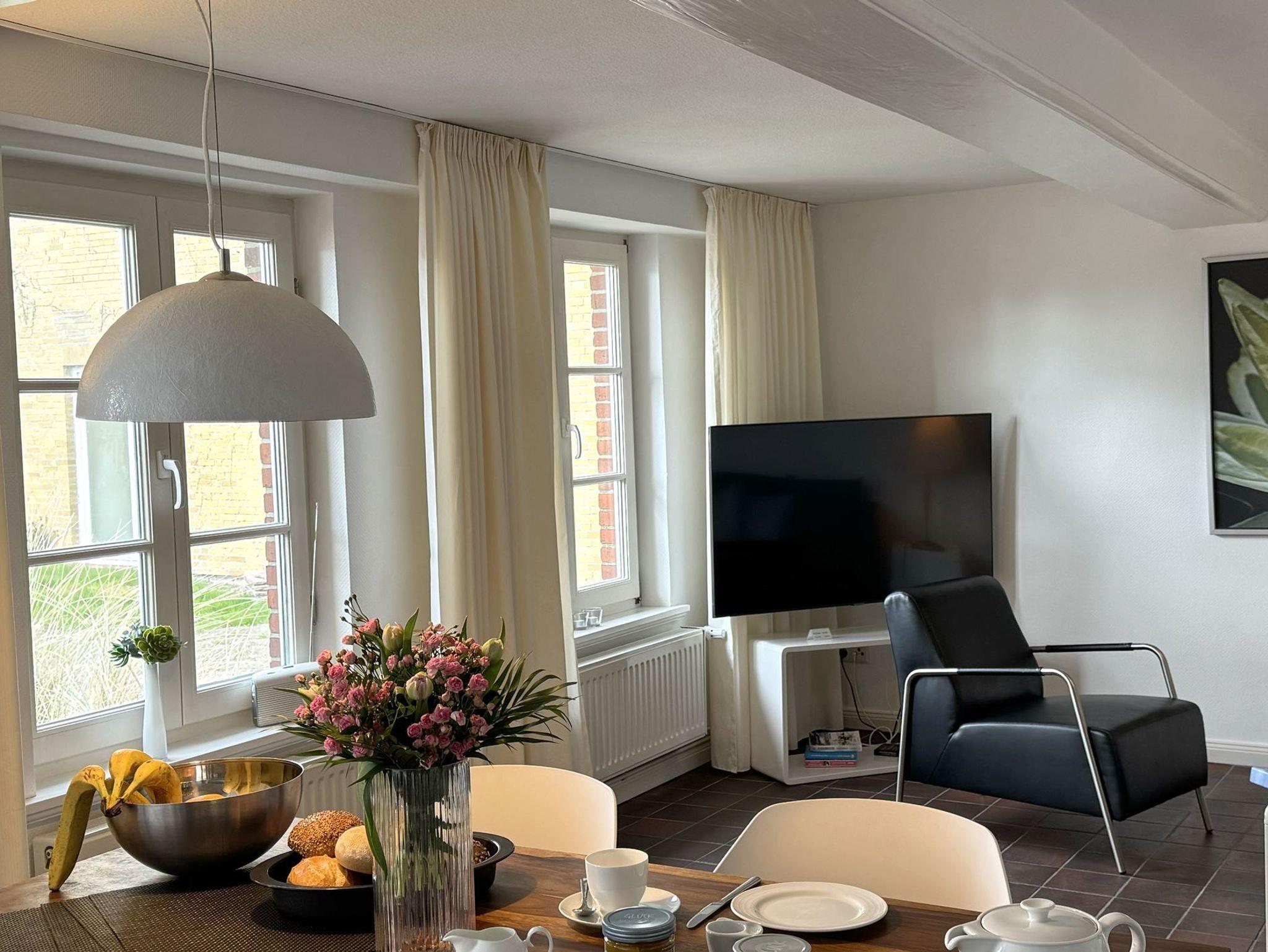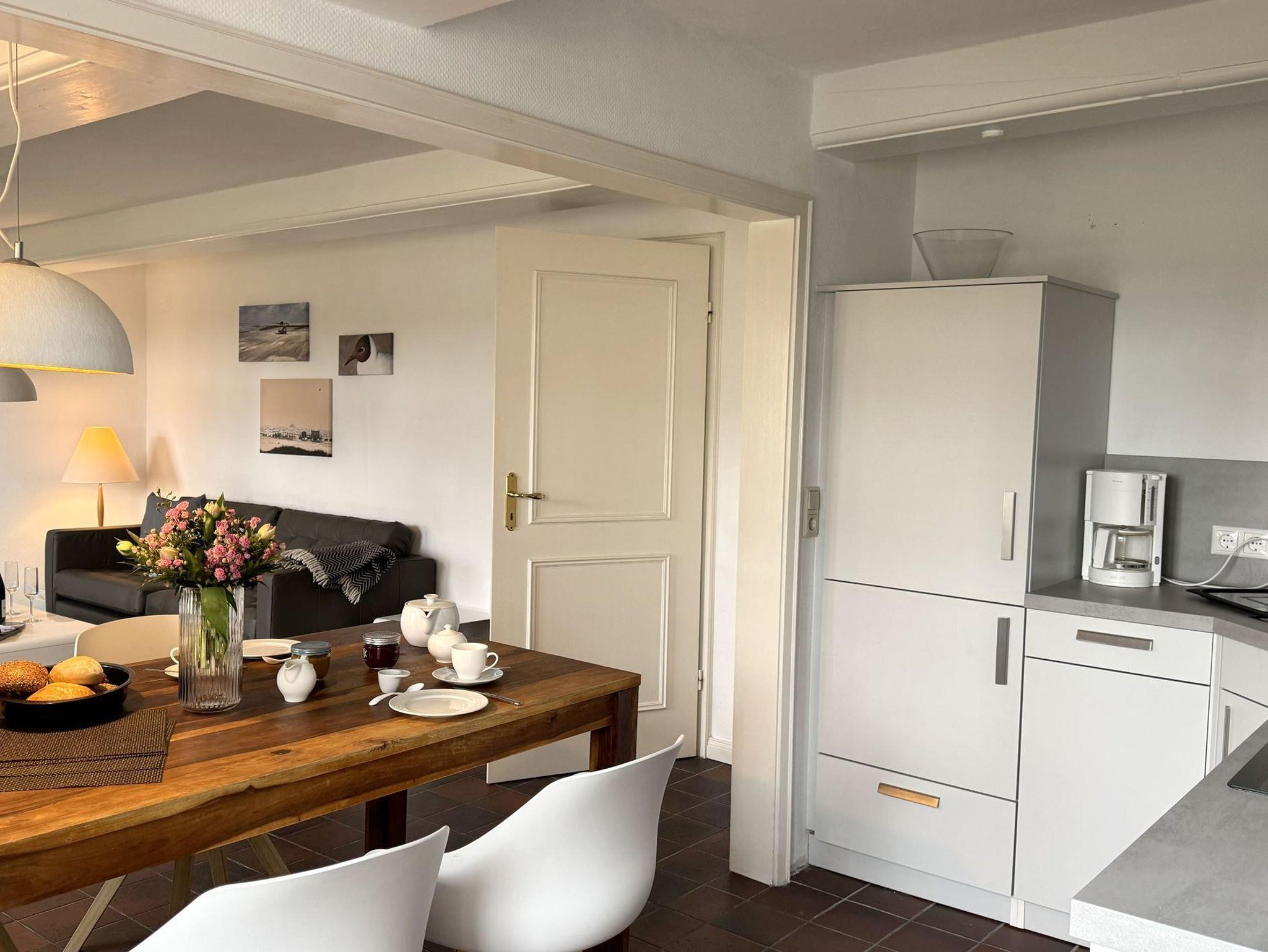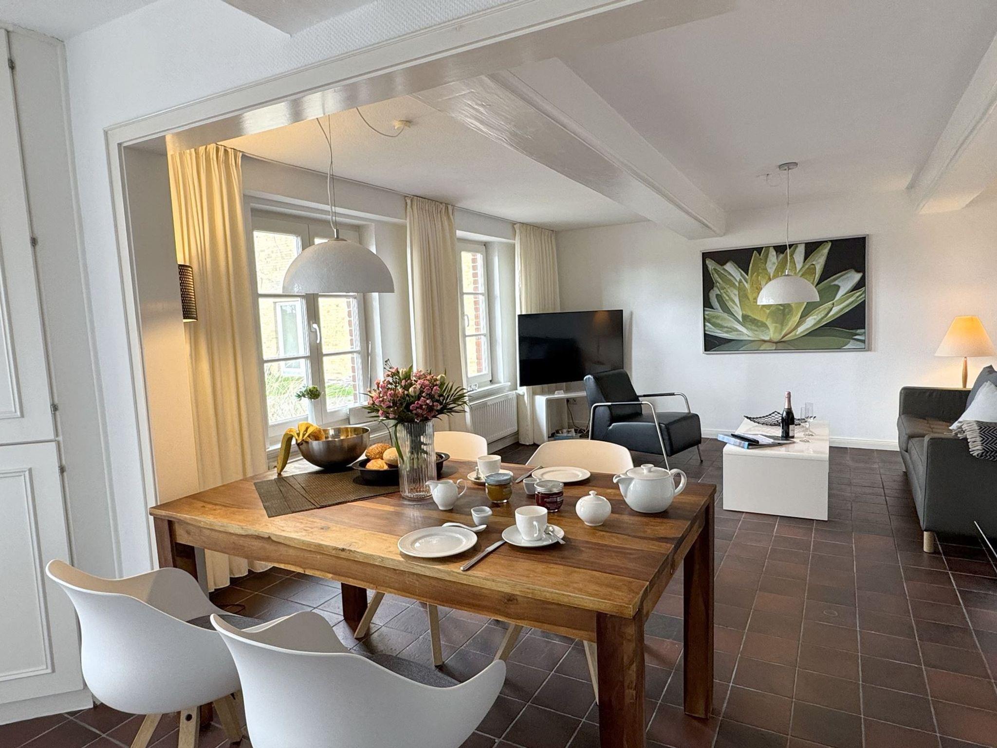 Genießen Sie Ihren Urlaub in unserer gemütlichen und komfortablen Bauernhauswohnung für bis zu 4 Personen. Es erwartet Sie original friesisches Ambiente unter einem Reetdach. Das über 100 Jahre alte Bauernhaus liegt eingebettet in viel Grün. Auf der zur Wohnung gehörenden Südterrasse, ausgestattet mit Strandkorb und Gartenmöbeln, können Sie wunderbar entspannen und die Seele baumeln lassen. Im Eingangsbereich finden Sie eine Diele mit Garderobe vor. Weiter geht es in den lichtdurchfluteten Wohn- und Essbereich mit vollausgestatteter, offener Küche, hier macht das Kochen richtig Spaß. Moderne friesische Behaglichkeit findet sich in der geschmackvollen Einrichtung und mit viel Liebe zum Detail wieder. In den beiden Schlafzimmern mit Doppelbetten finden Sie erholsamen Schlaf. Im geräumige Duschbad findet sich eine grosse, bodengleiche Dusche. Freuen Sie sich auf wundervolle und ruhige Urlaubstage bei uns.
