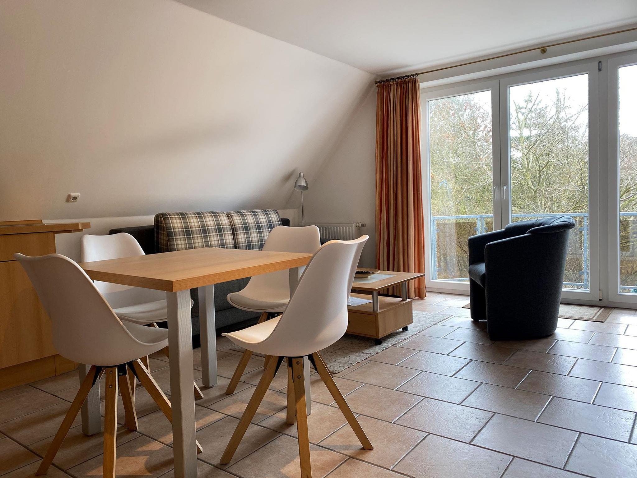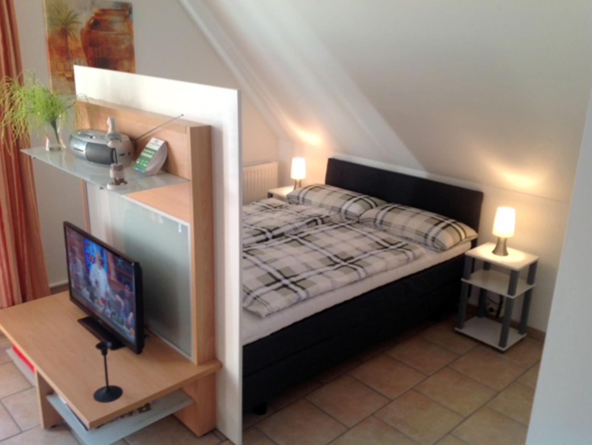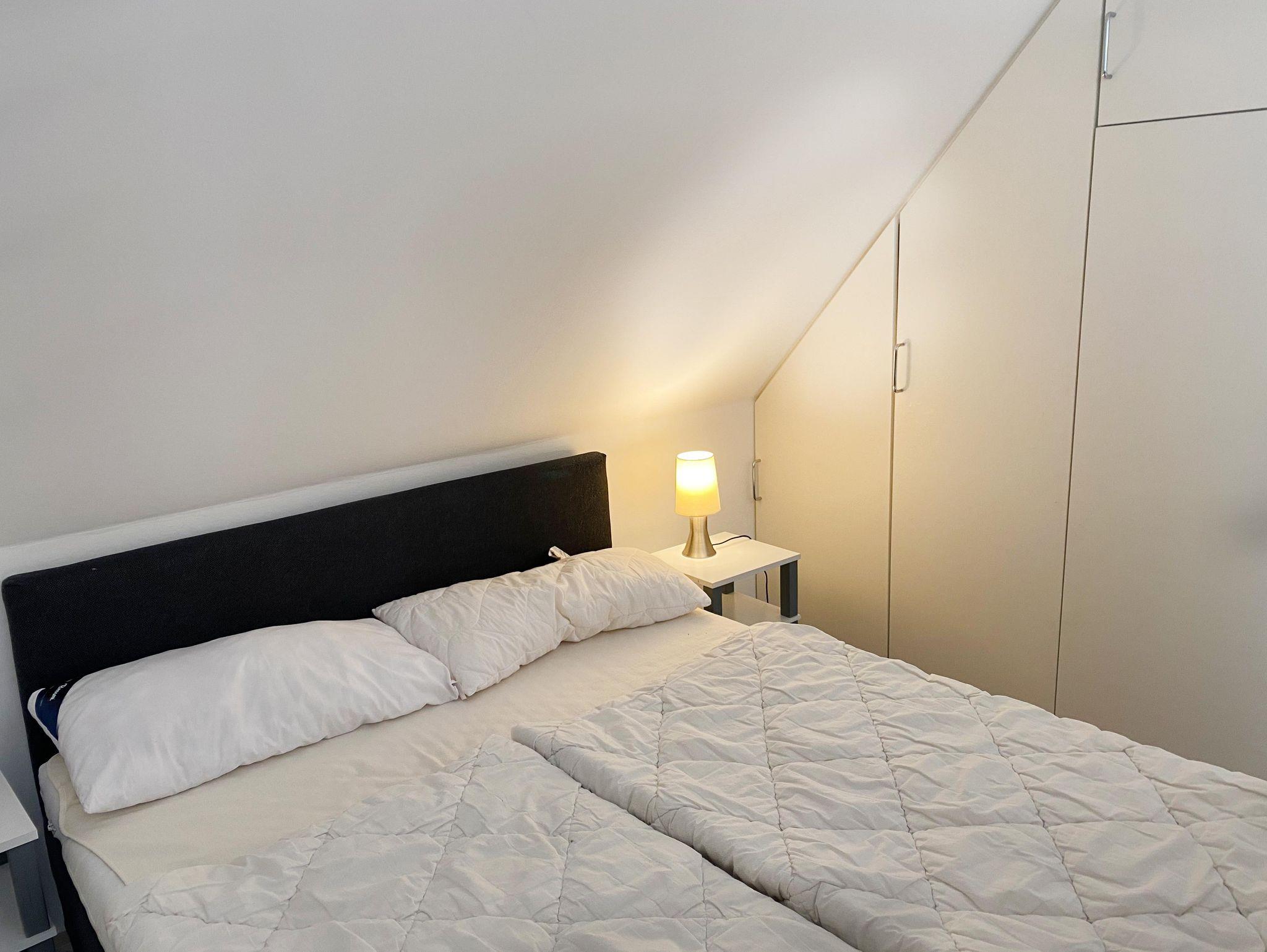 Über die Wendeltreppe ins Schlafzimmer. Die moderne 2-Zimmer-Ferienwohnung Möweninsel Nr. 04 liegt im 1. OG und DG. Die 2 Einzelbetten unterm Dach und das Boxspringbett im Wohnraum versprechen eine angenehme Nachtruhe. Auf dem Süd-Ost-Balkon können Sie würzige Nordseeluft schnuppern. Das geschmackvolle Bad und die moderne Küchenzeile mit Cerankochfeld, Backofen und Spülmaschine machen den Urlaub sehr angenehm.