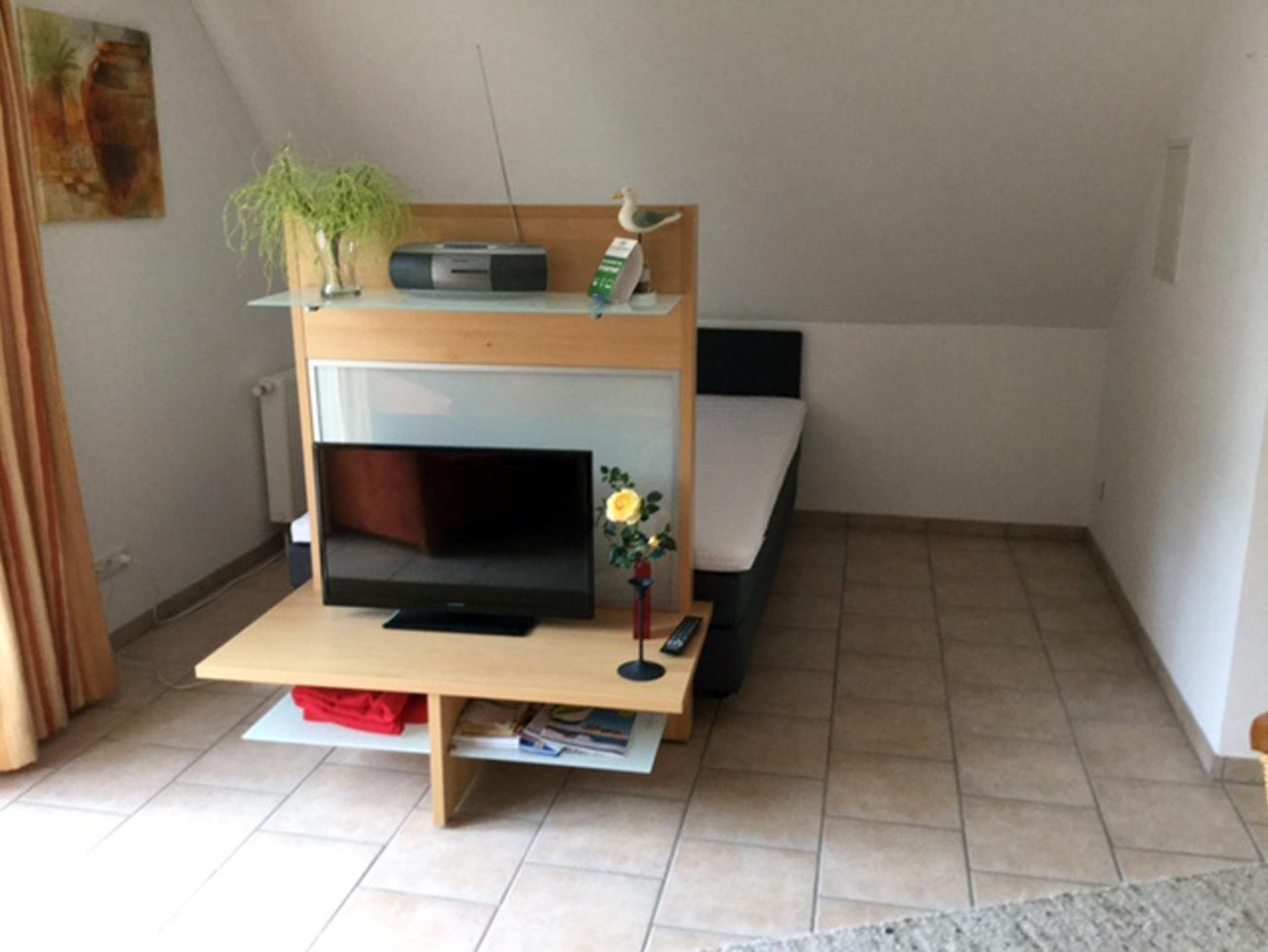 Wohnzimmer: Boxspringbett, Schlafcouch, Couchtisch, Sessel, TV-Regal, Sat-TV, Kofferradio mit CD-Player, Stehlampe, Esstisch, 3 Stühle, Garderobenständer, Spiegel, Wendeltreppe nach oben, Küchenzeile, 4 Plattenherd mit Ceranfeld und Backofen, Dunstabzugshaube, Kühlschrank, Spülmaschine, Kaffeemaschine, Wasserkocher, Eierkocher, Toaster, Geschirr, Kochtöpfe, Schuhständer