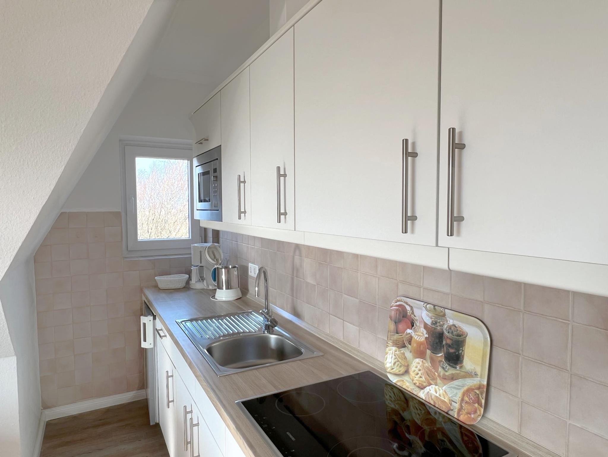 • komplett eingerichtete Küche mit Ceranfeld, Mikrowelle, Geschirrspüler, Kühlschrank mit Gefrierfach, Wasserkocher, Kaffeemaschine (Filter), Toaster.