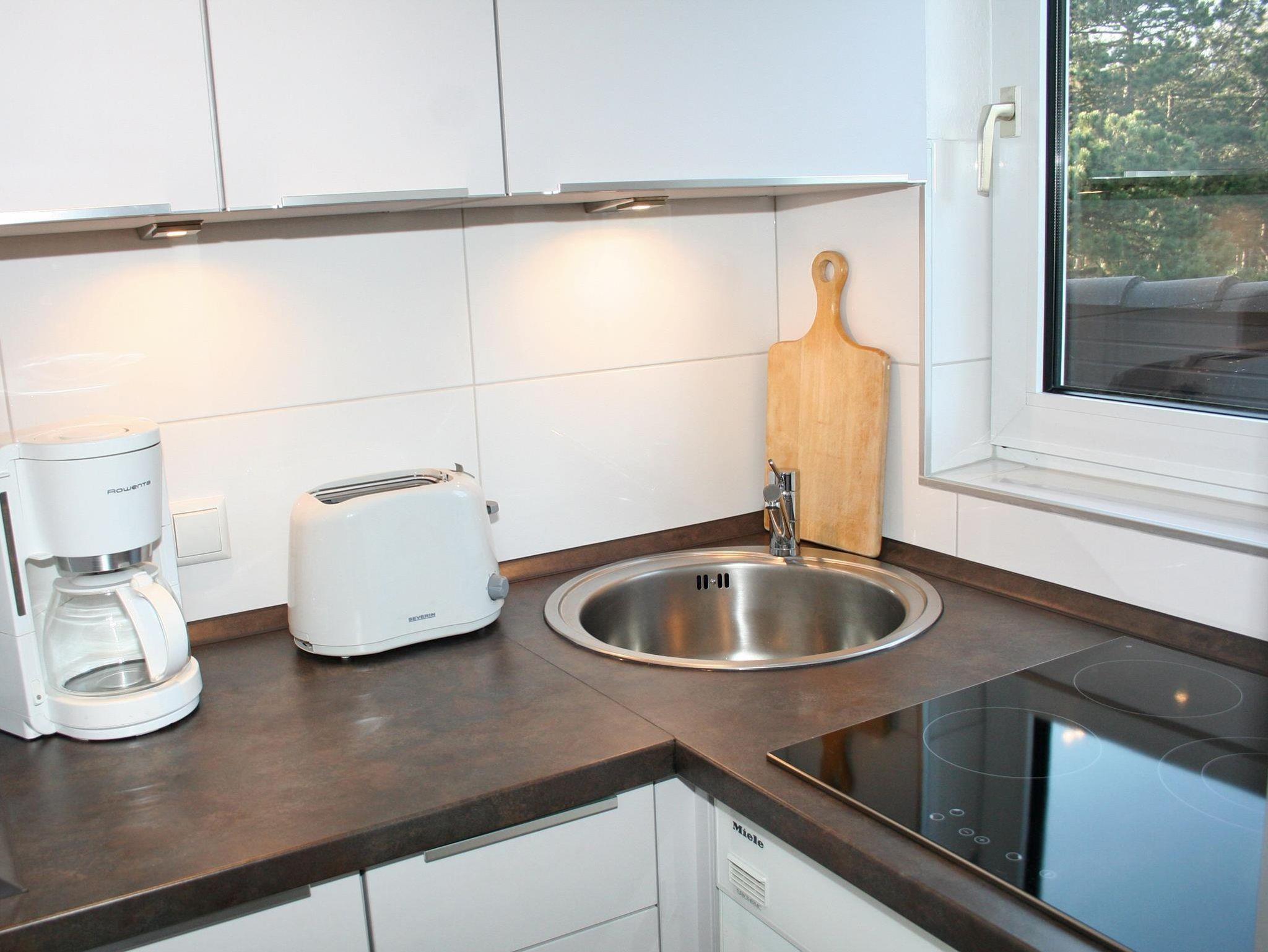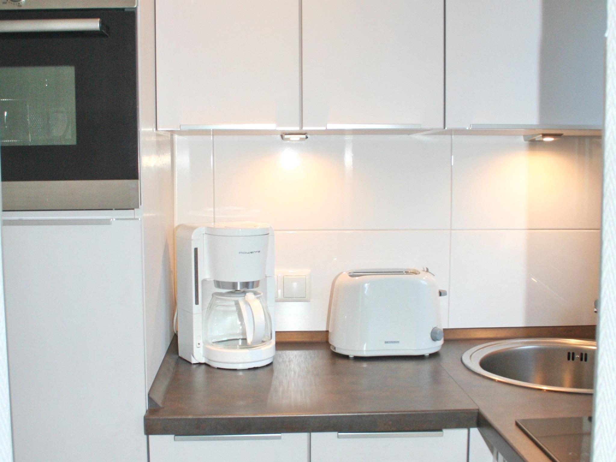 Küche: Einbauküche, 4 Plattenherd, Dunstabzugshaube, Kühlschrank, Spülmaschine, Mikrowelle, Kaffeemaschine, Wasserkocher, Toaster, Handmixer, Geschirr, Kochtöpfe