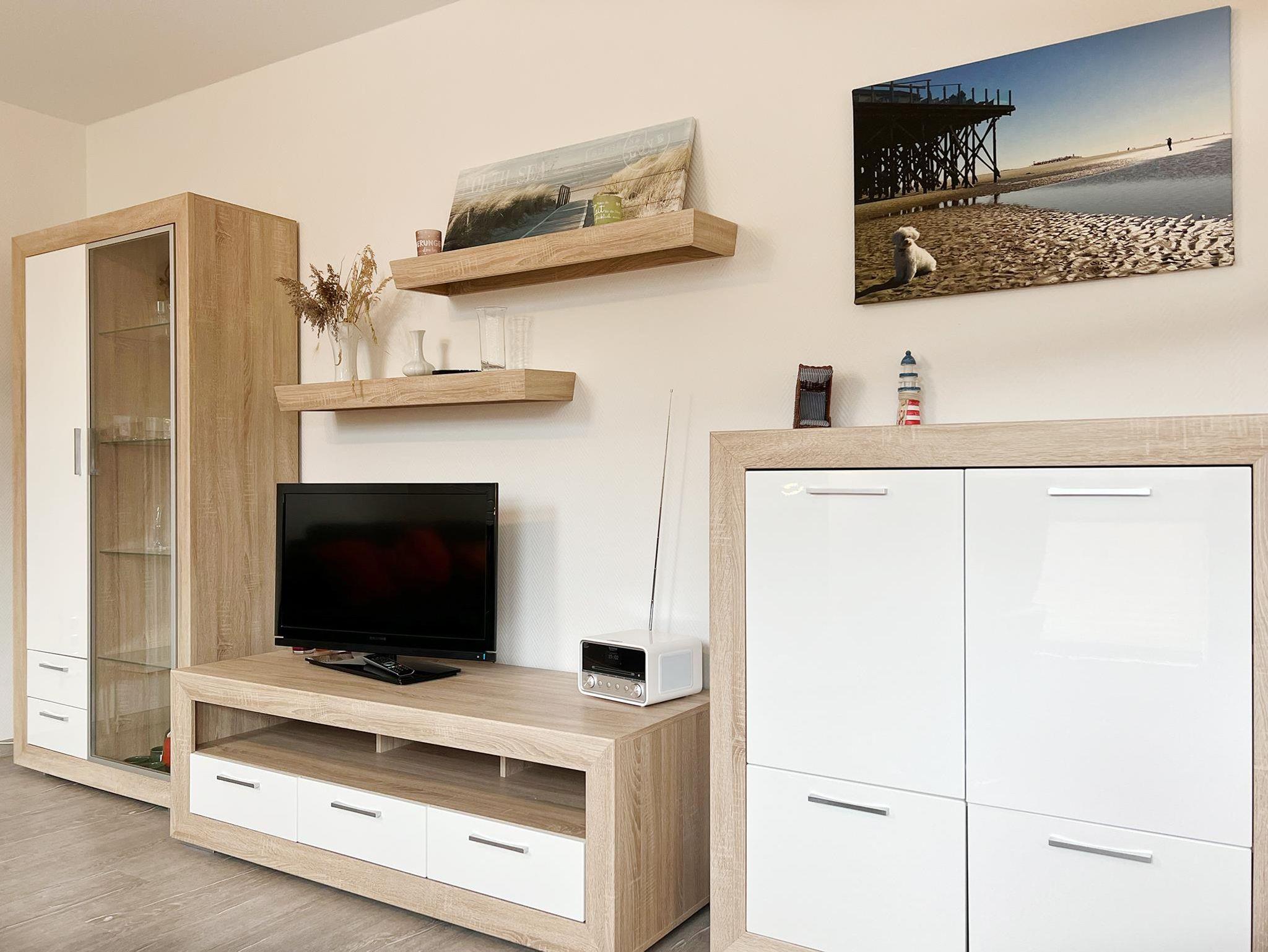 Wohnzimmer: Eckcouch, Couchtisch, Sessel, Hocker, Beistelltisch, Tischlampe, Schrank, Vitrinenschrank, Kabel-TV, Kofferradio mit CD-Player, Esstisch, 4 Stühle,