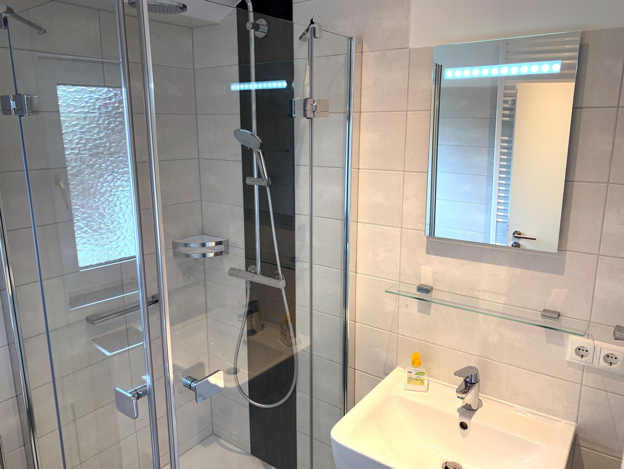 Bad: Dusche, Waschbecken, WC, Fön, Duschkabine