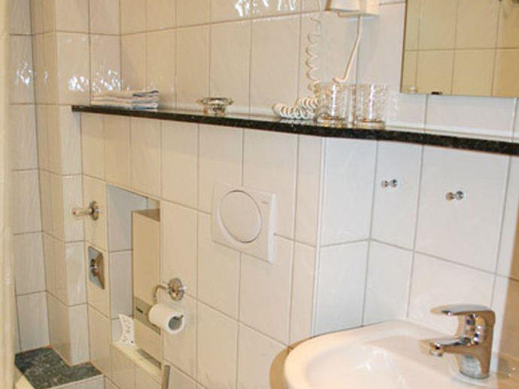 Bad: Dusche, Waschbecken, WC, Spiegel, Kosmetikspiegel, Fön, große Ablage