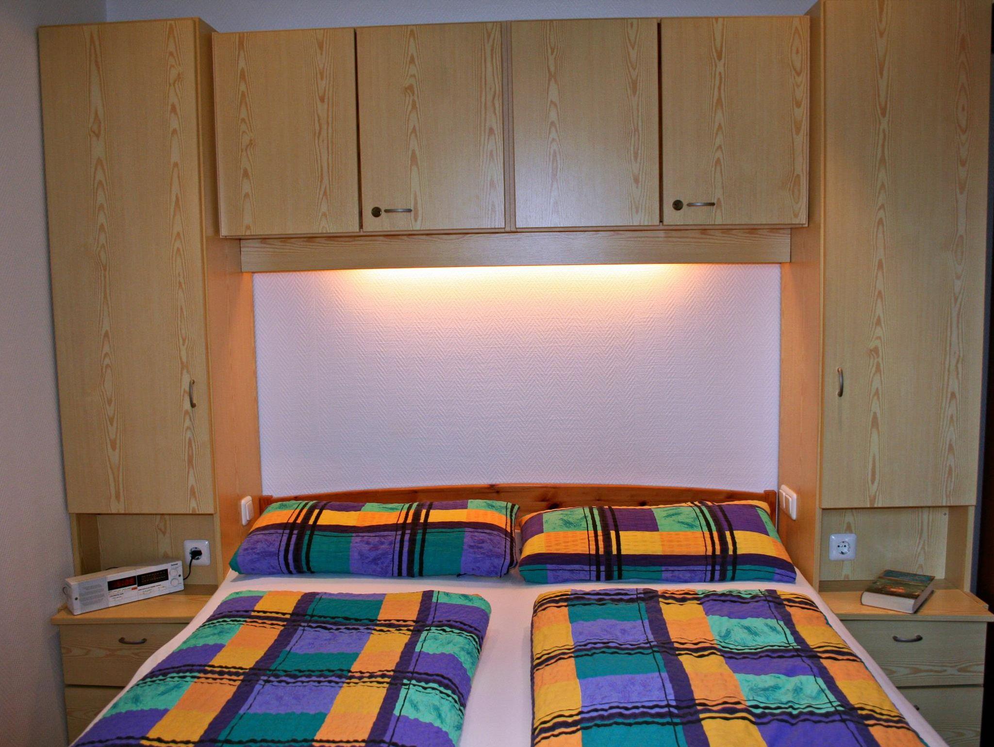 Schlafzimmer: Doppelbett 1,60m x 2,00m (2 getrennte Matratzen), 2 Ablagen, E-Heizung, Kleiderschrank, Wäscheschrank, Bügelbrett, Staubsauger, Zweit-Fernseher, Radio,