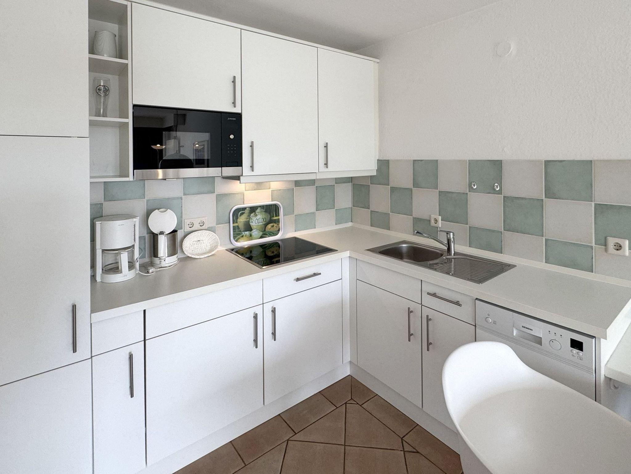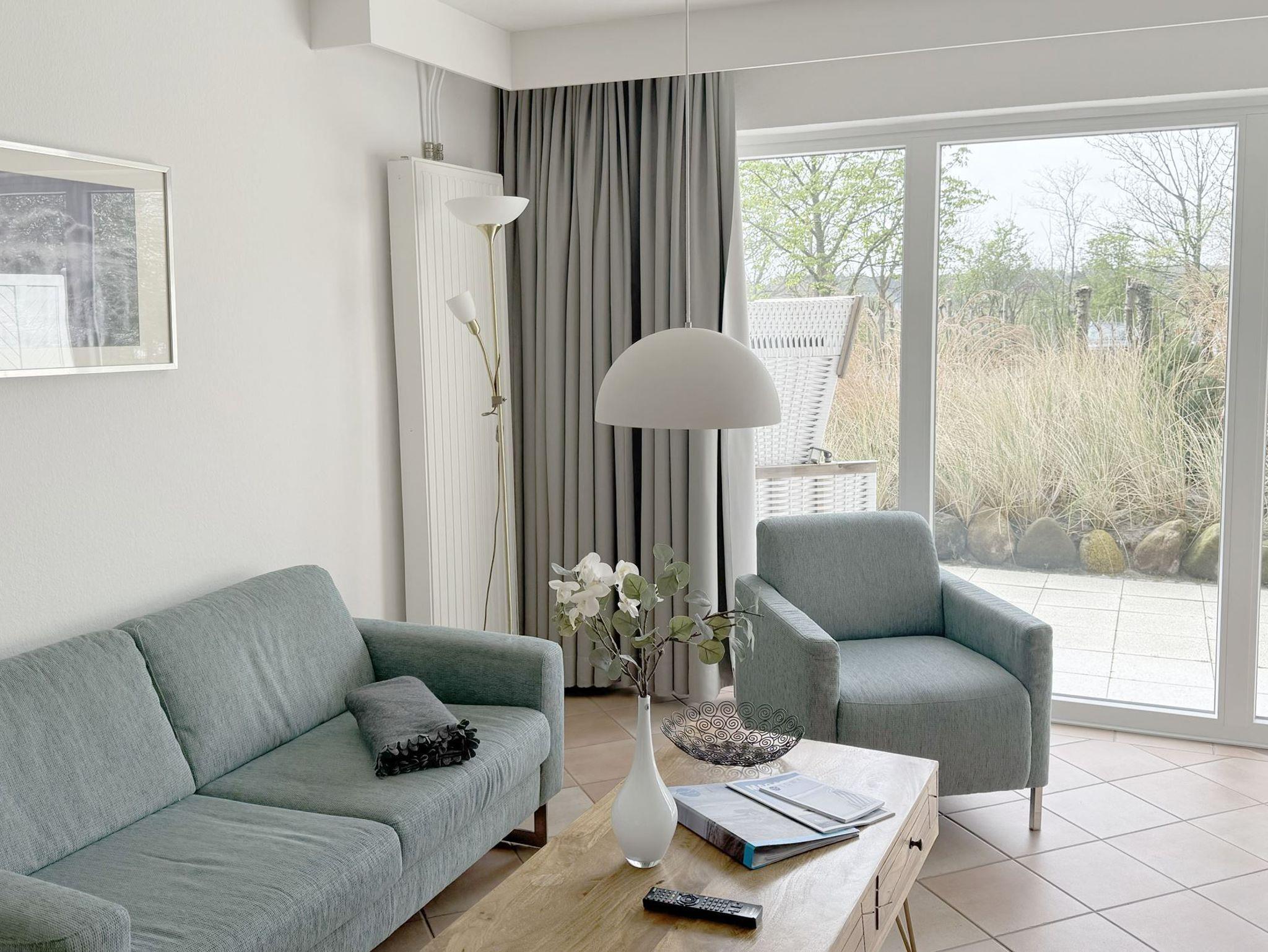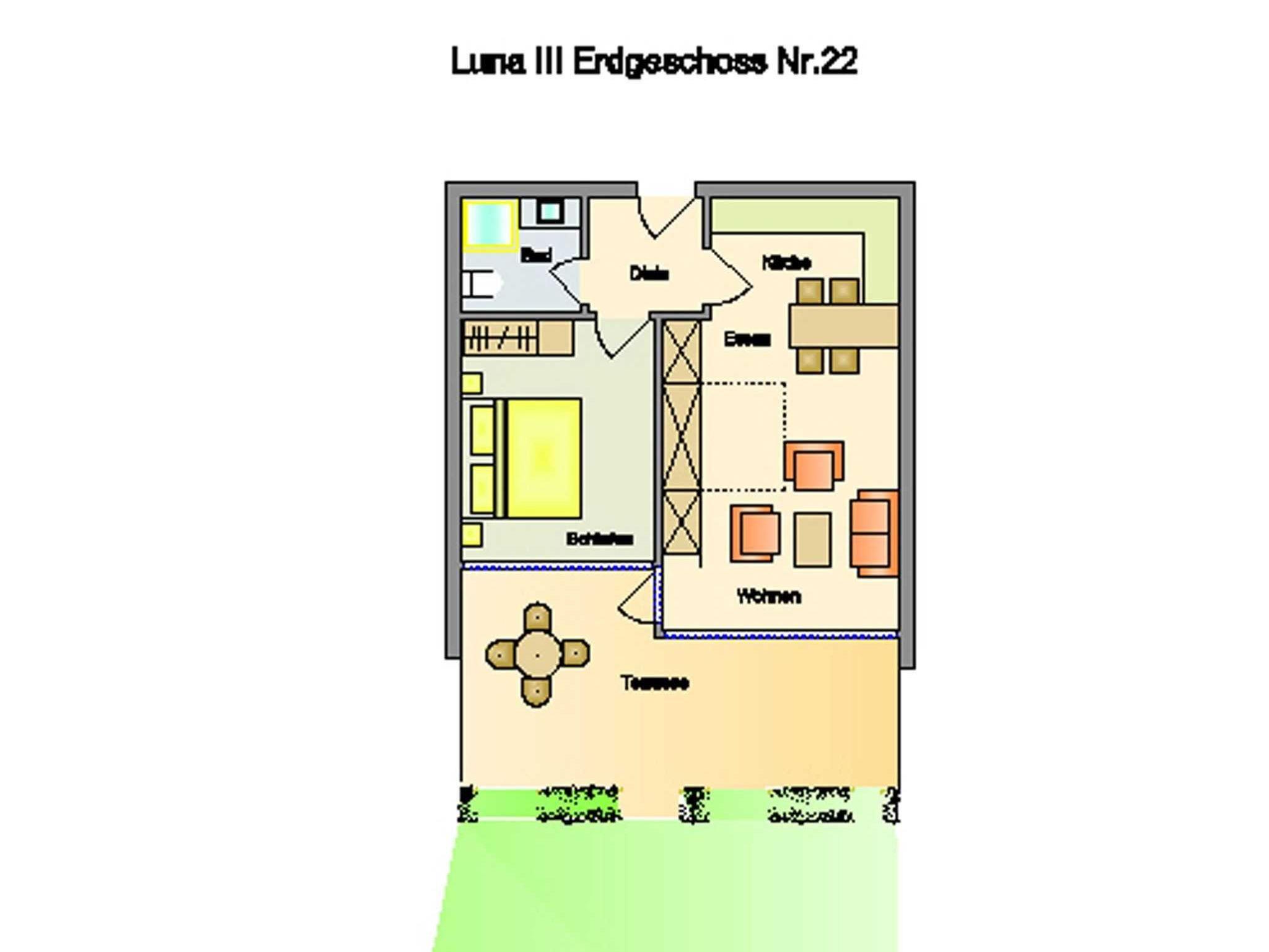 Die ca. 55 qm teilen sich folgendermaßen auf:Eingangsbereich mit Garderobe, offener Wohnraum mit Essbereich und integrierter Einbauküche,Einzelschrankbett (90x200cm,Matratze ), direkter Zugang zur Loggia und Garten, Schlafzimmer mit Doppelbett (180x200cm,getrennte Matratzen), 1 Duschbad mit WC und Waschbecken.