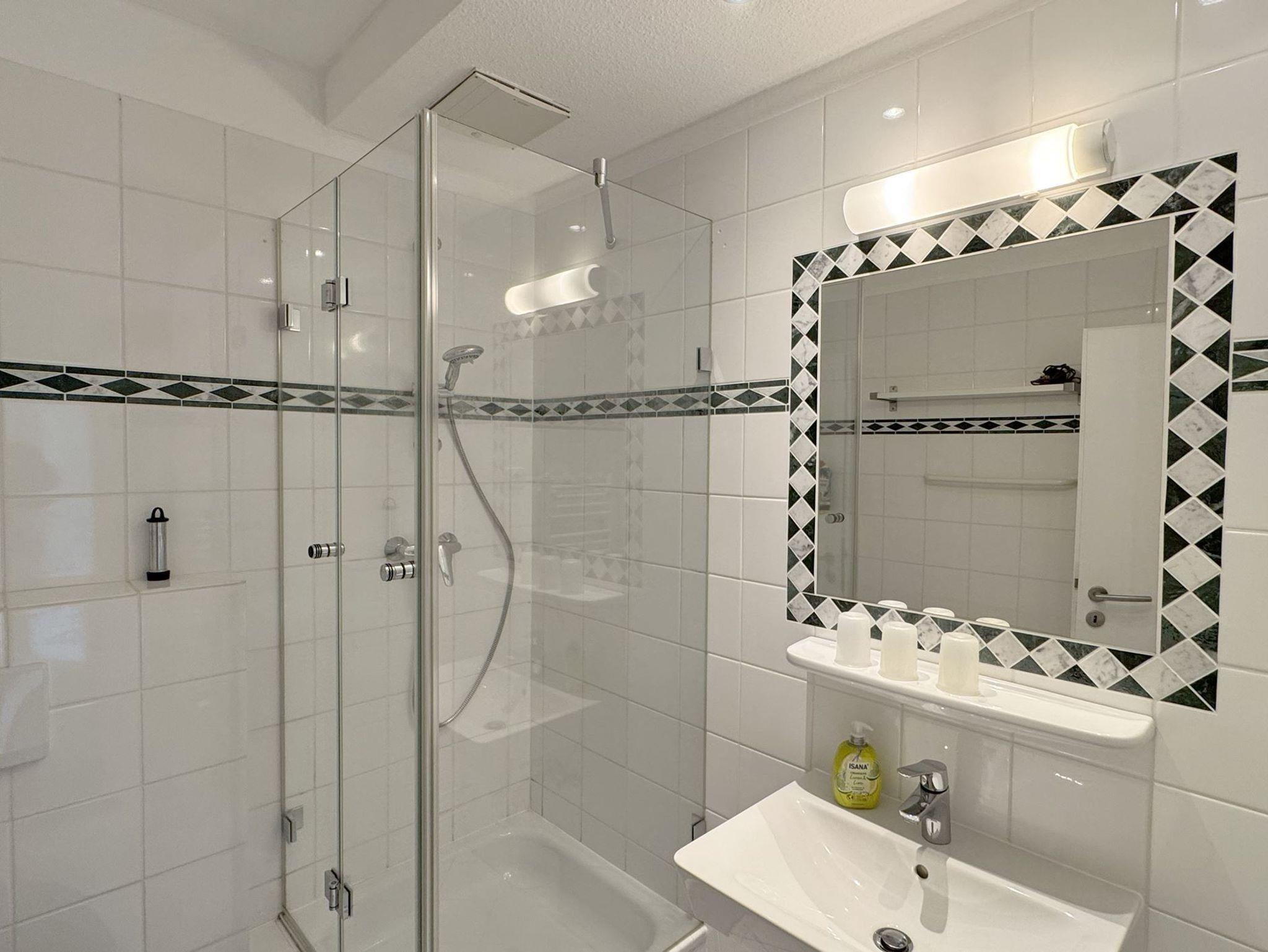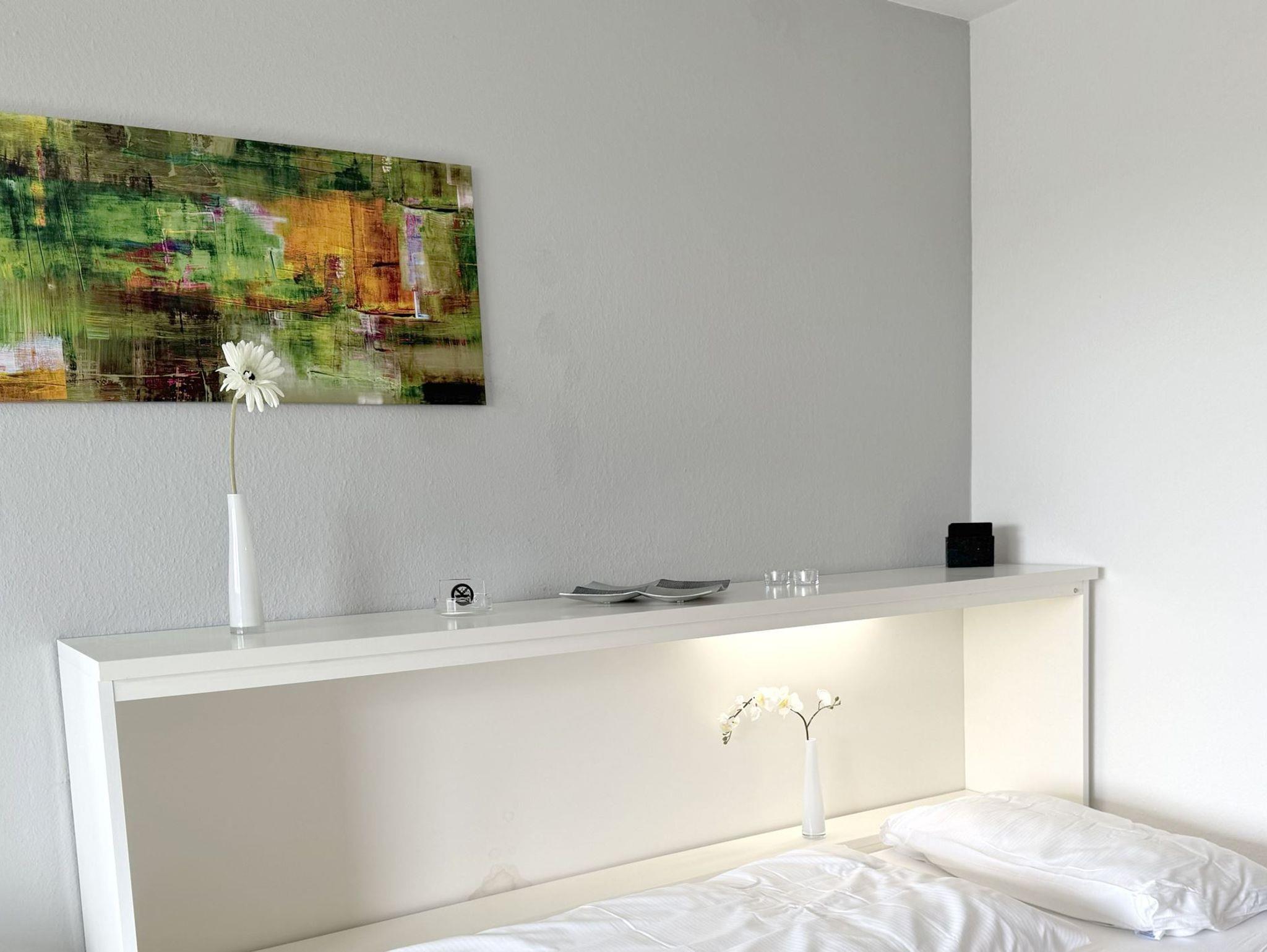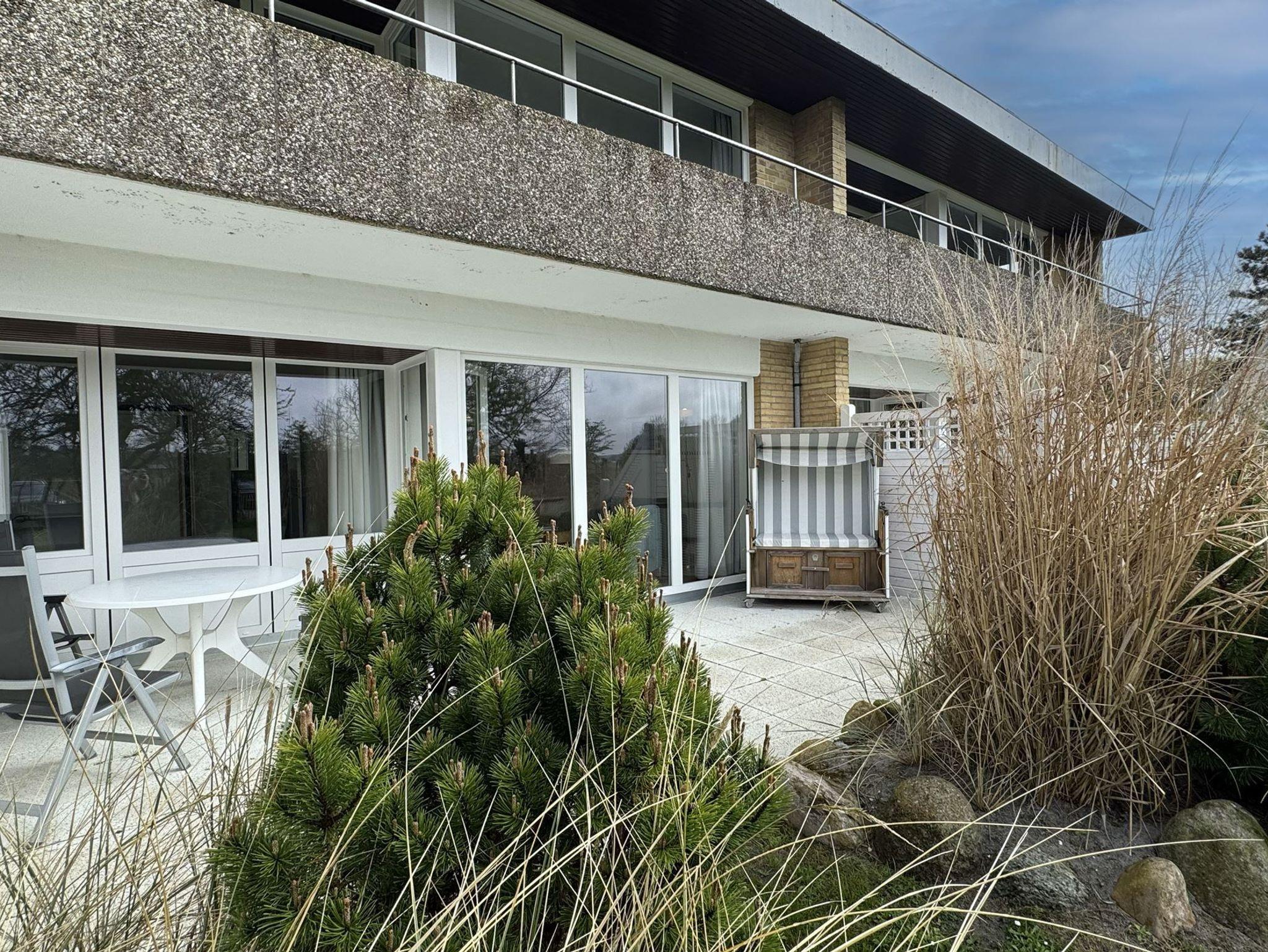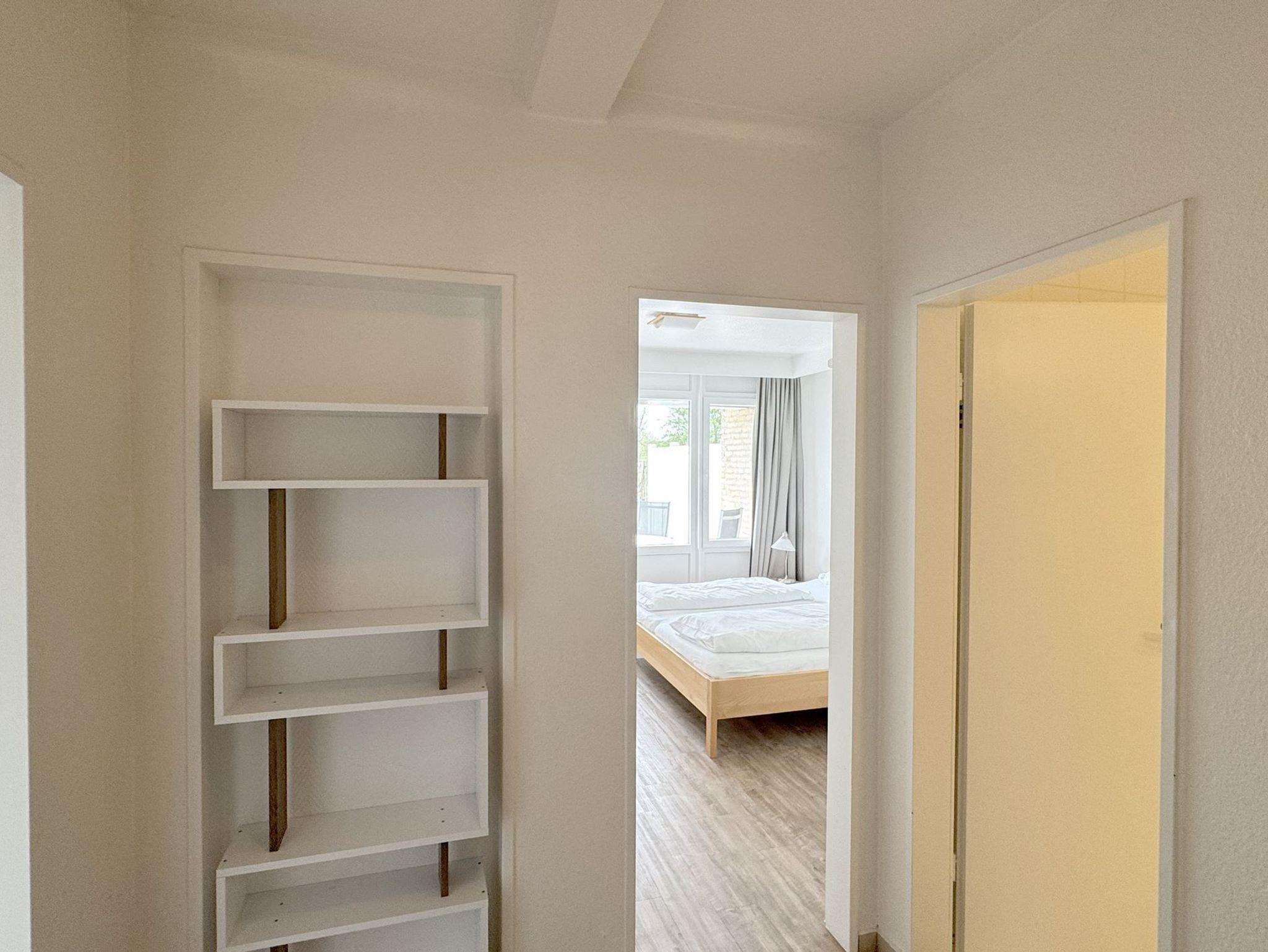 Die ca. 55 qm teilen sich folgendermaßen auf:Eingangsbereich mit Garderobe, offener Wohnraum mit Essbereich und integrierter Einbauküche,Einzelschrankbett (90x200cm,Matratze ), direkter Zugang zur Loggia und Garten, Schlafzimmer mit Doppelbett (180x200cm,getrennte Matratzen), 1 Duschbad mit WC und Waschbecken.