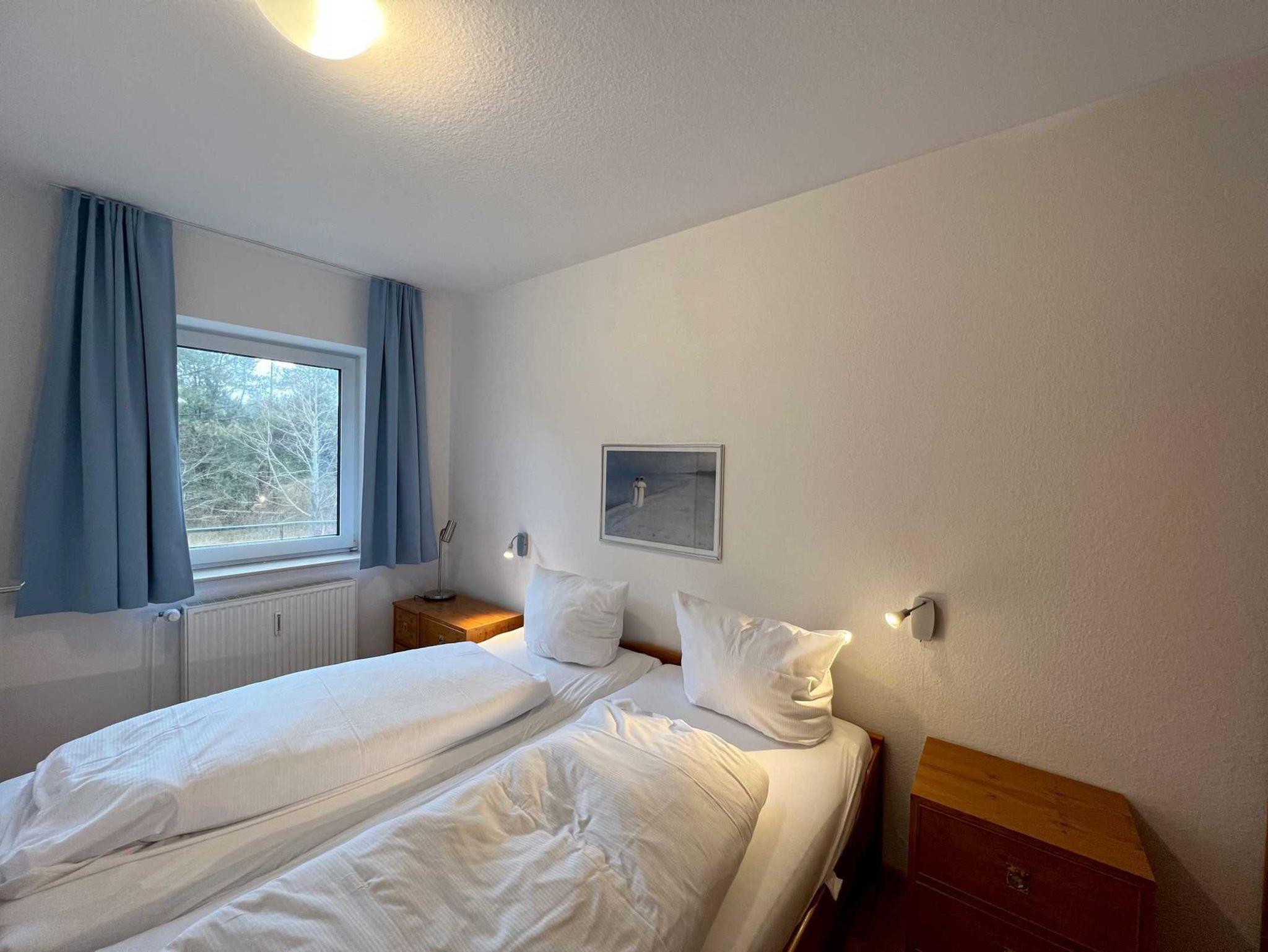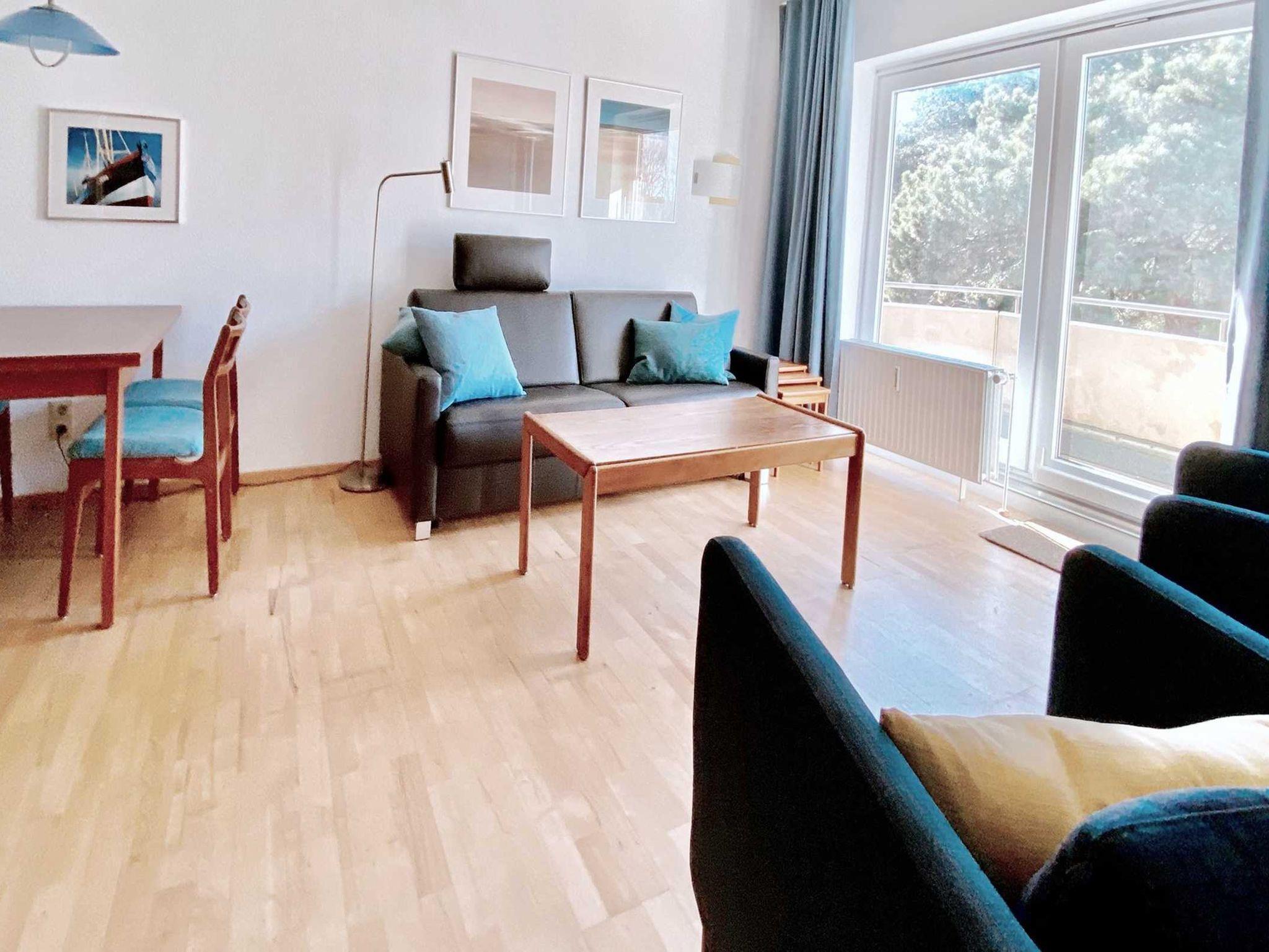 Auf dem nordwestlich ausgerichteten Balkon können Sie sich auf einer Sitzgruppe mit 4 Balkonstühlen entspannen. Genießen Sie die ruhige Lage abgewandt von der Durchgangsstraße und den unverbauten Blick auf den Dünenwald.