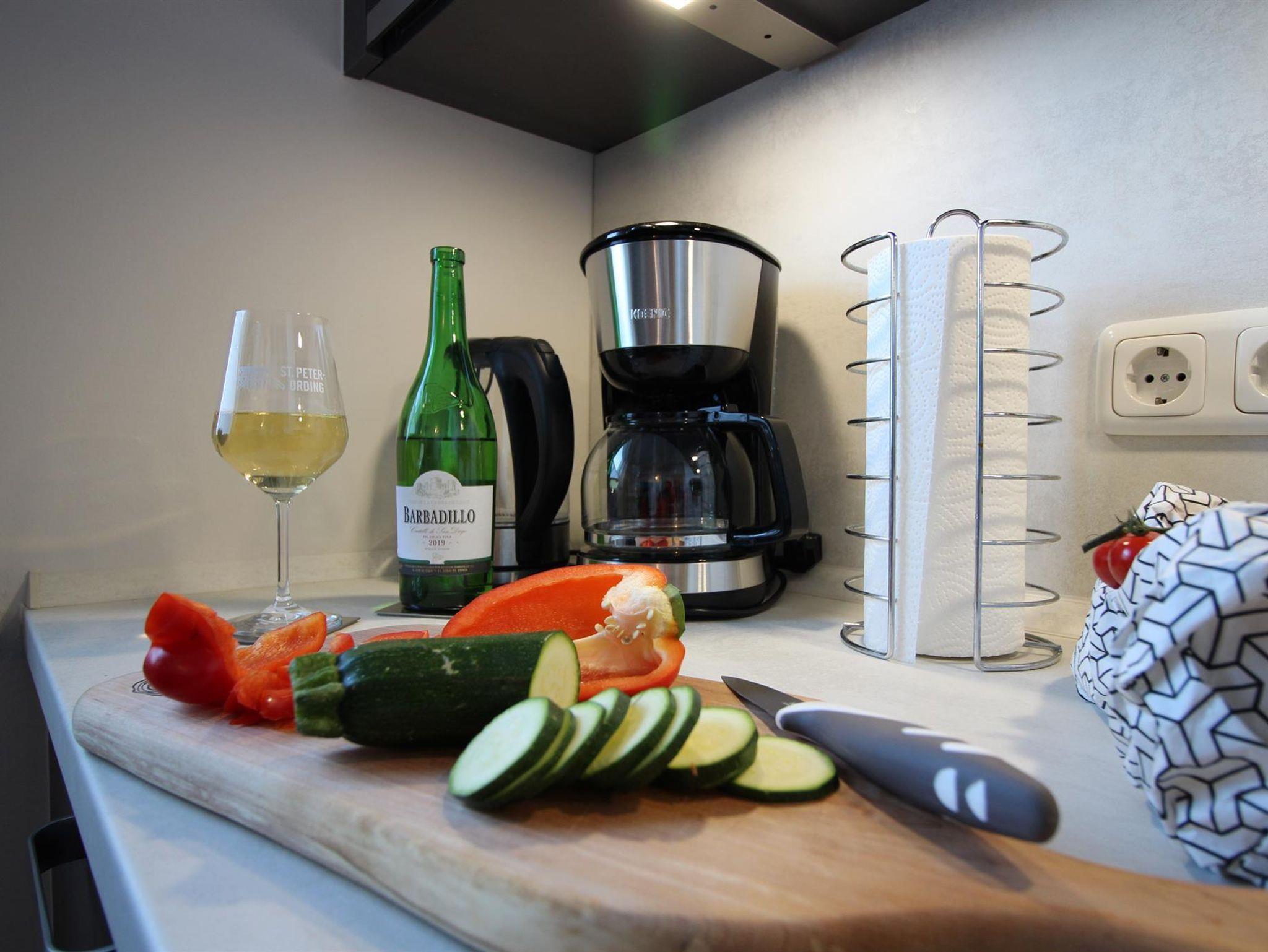 Kochen Sie doch entspannt in ihrem Urlaubsdomizil - in der separaten Einbauküche mit Geschirrspüler, Mikrowelle, Backofen, Kühlschrank mit Gefrierfach, Kaffeevollautomat mit Dampfdüse für Milchaufschäumer, etc.. Auch Mixer und Backformen fehlen nicht.