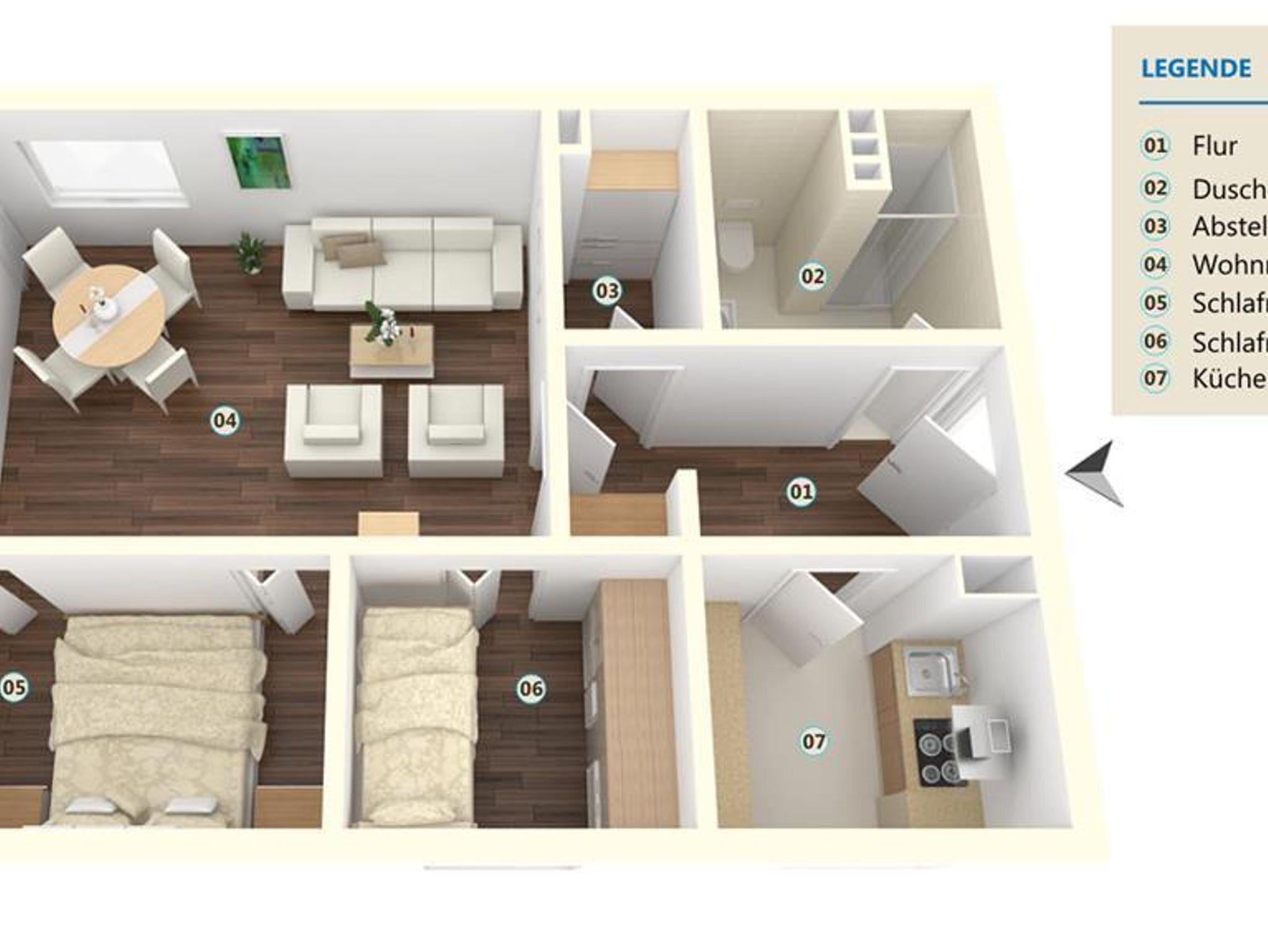 Ein Wohnraum mit Esstisch, Stühlen, neues 42 HDTV mit HD Kanälen,Netflix etc., 1 Schlafraum mit Doppelbett, 1 Zimmer mit Etagenbetten, hochwertiges Badezimmer mit Handtuchheizung, Bad-Radio, Haartrockner, .