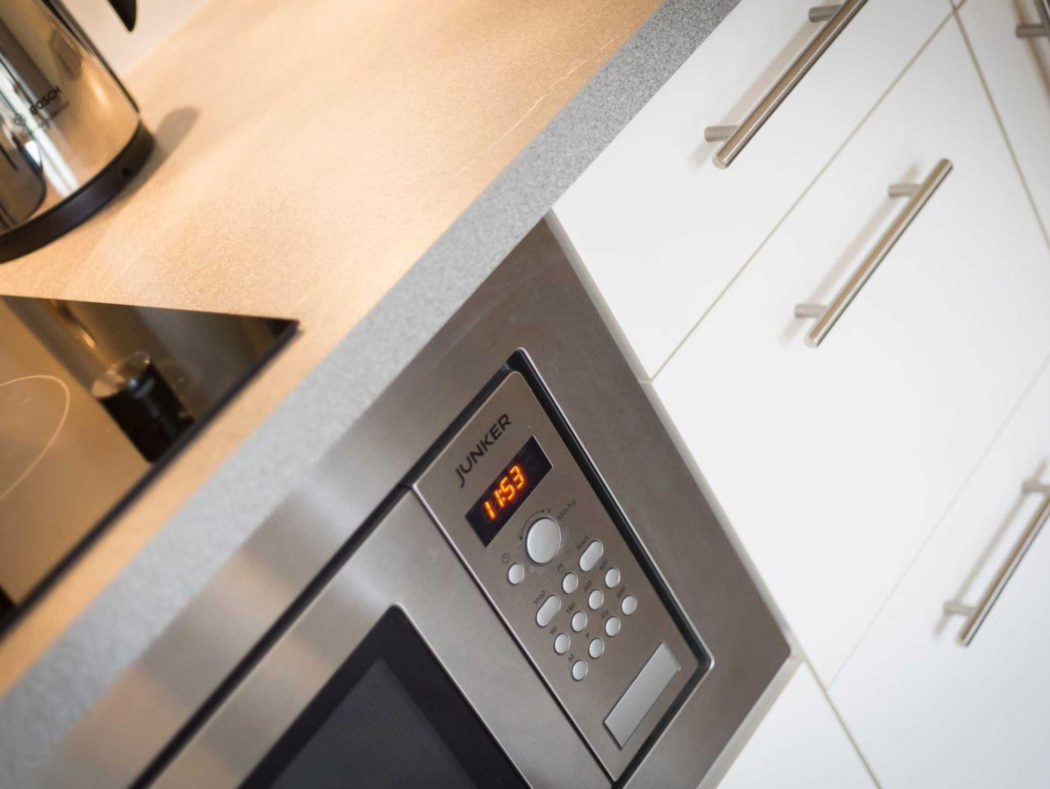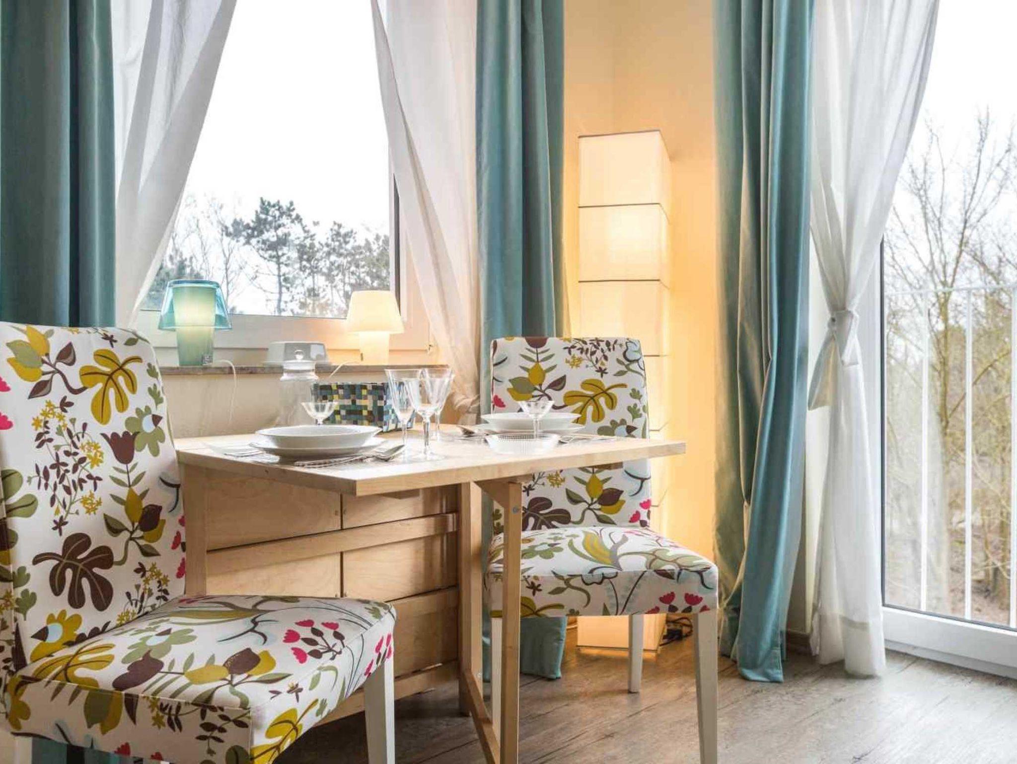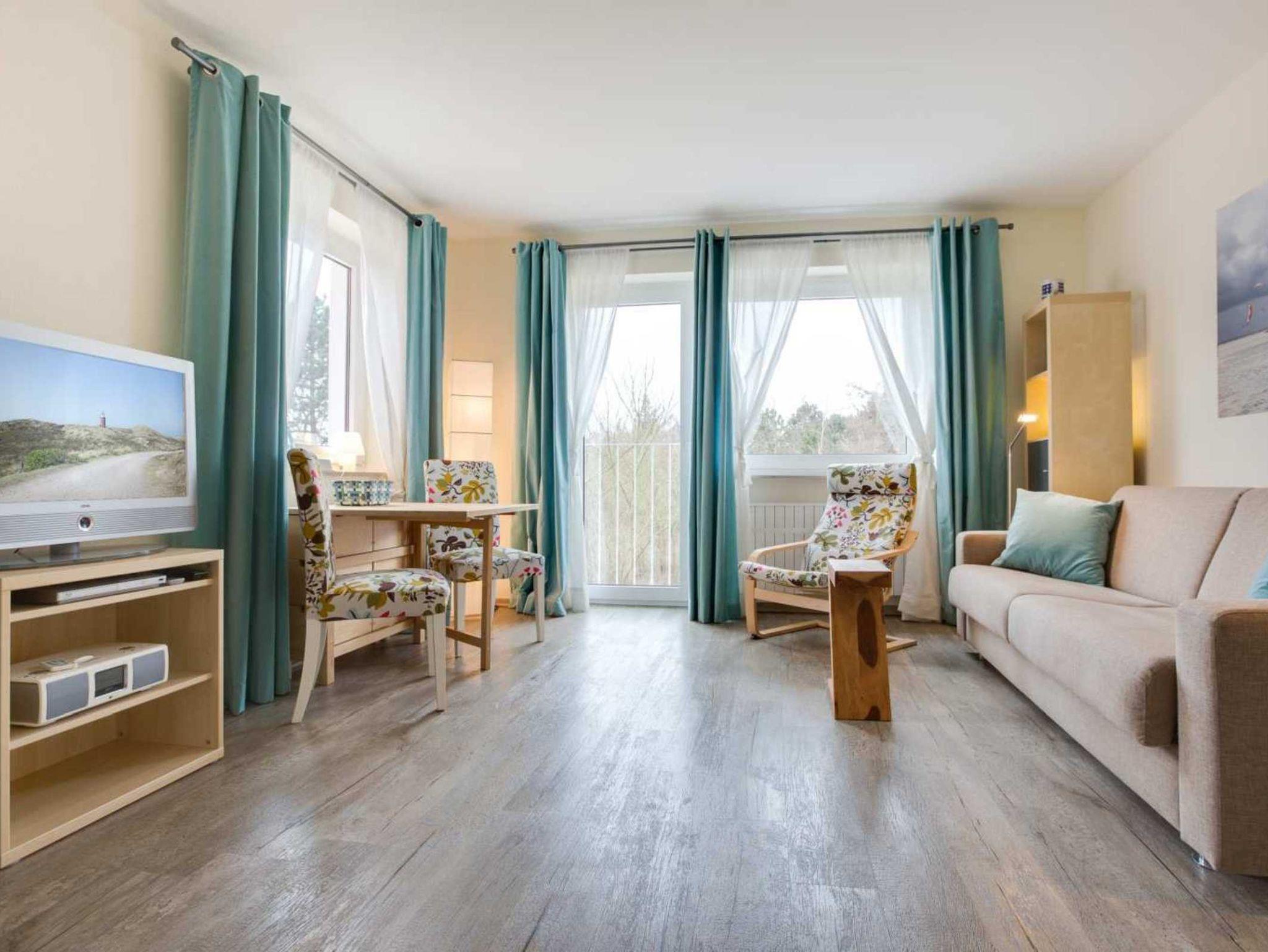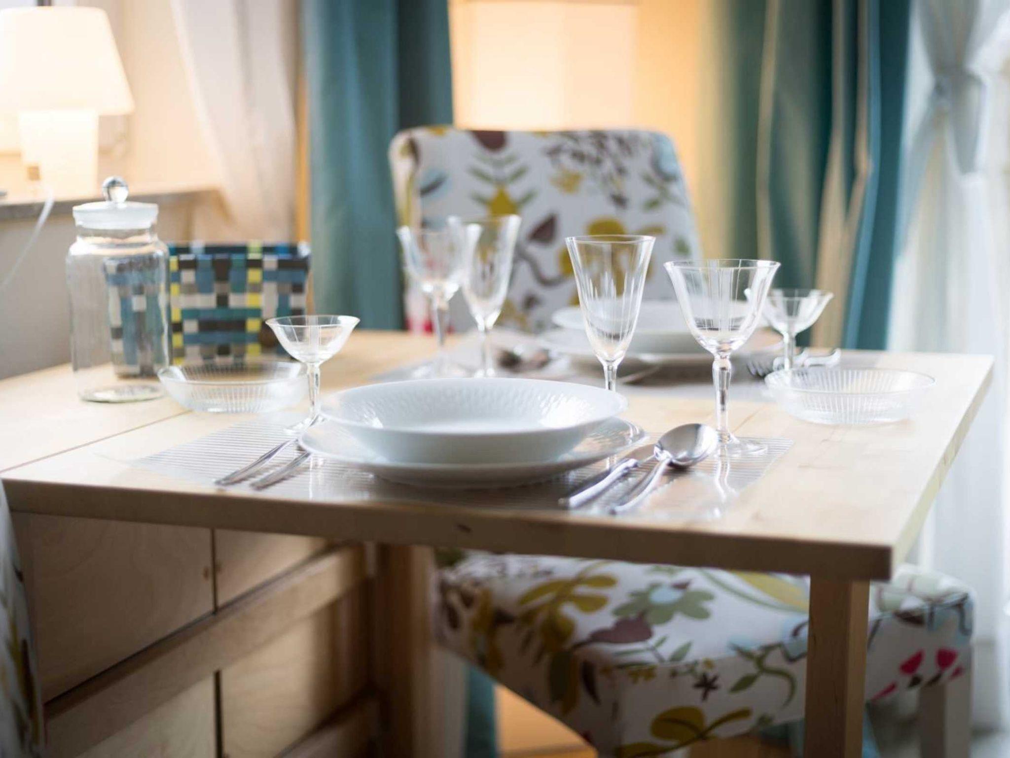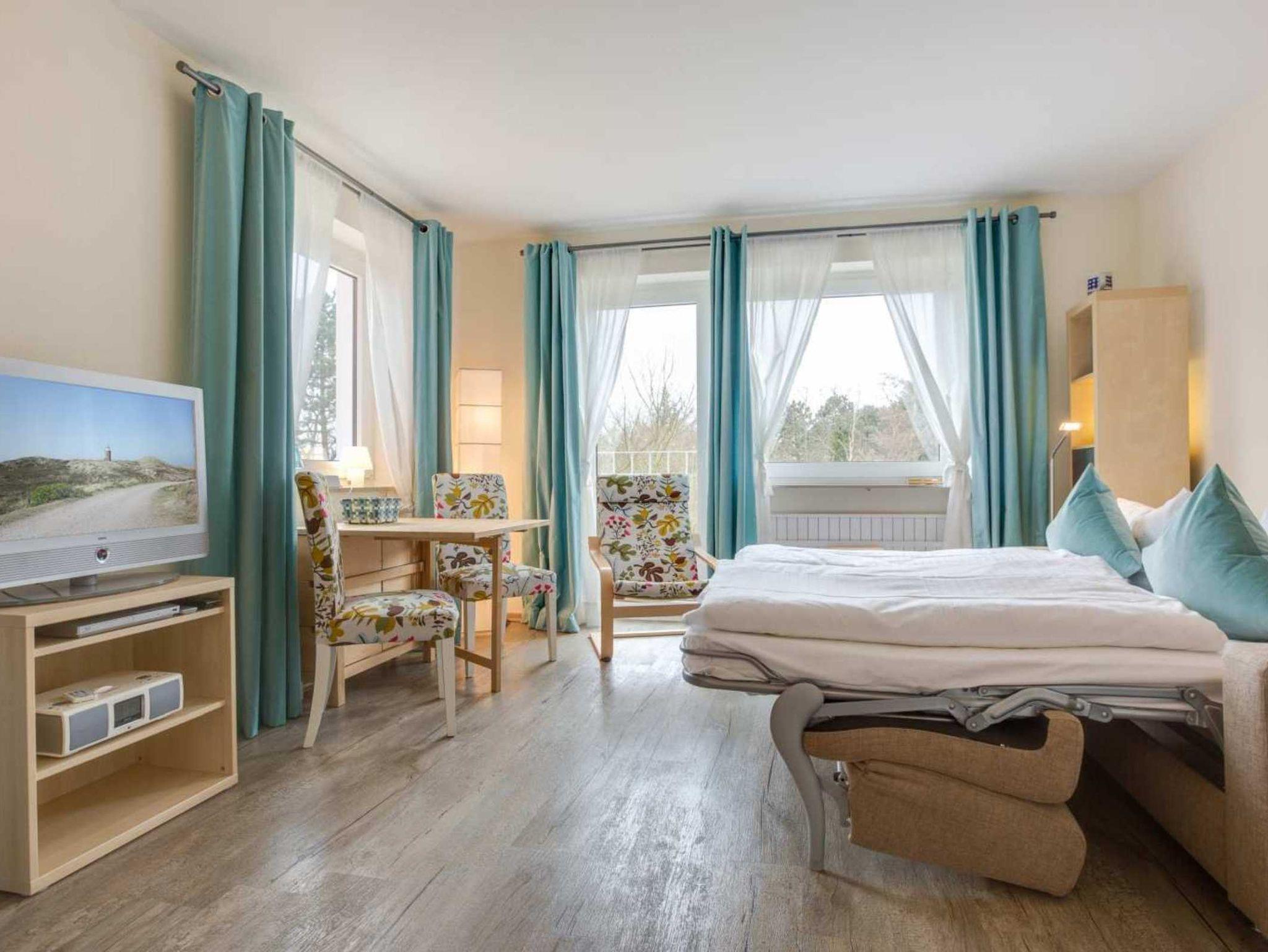 Wohn- und Schlafzimmer mit ausziehbarem (Schlaf-) Sofa (160x190cm), Sessel, Esstisch mit 2 Stühlen, TV (Sat), DVD-Player und Radio. Französischer Balkon. Offene Küche mit Herd mit 2 Kochstellen, Mikrowelle und Kühlschrank mit Gefrierfach.