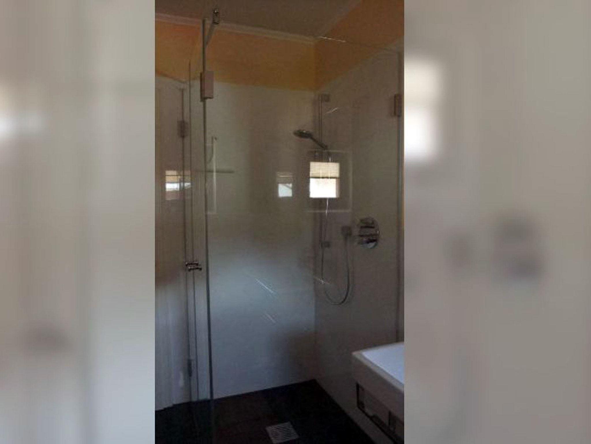 Bad: Waschbecken, WC, bodengleiche Duschkabine, Spiegel, Fön, Standregal
