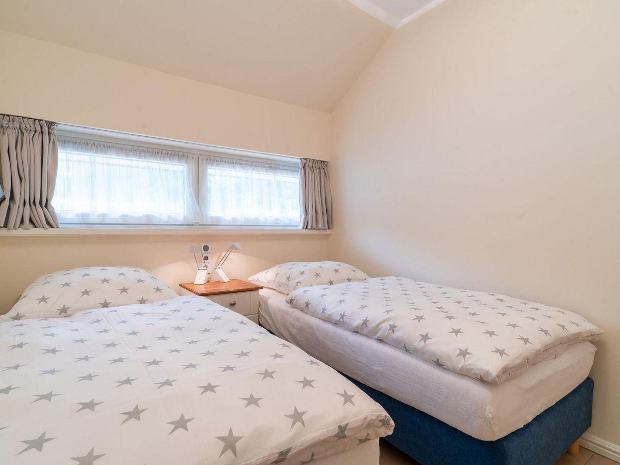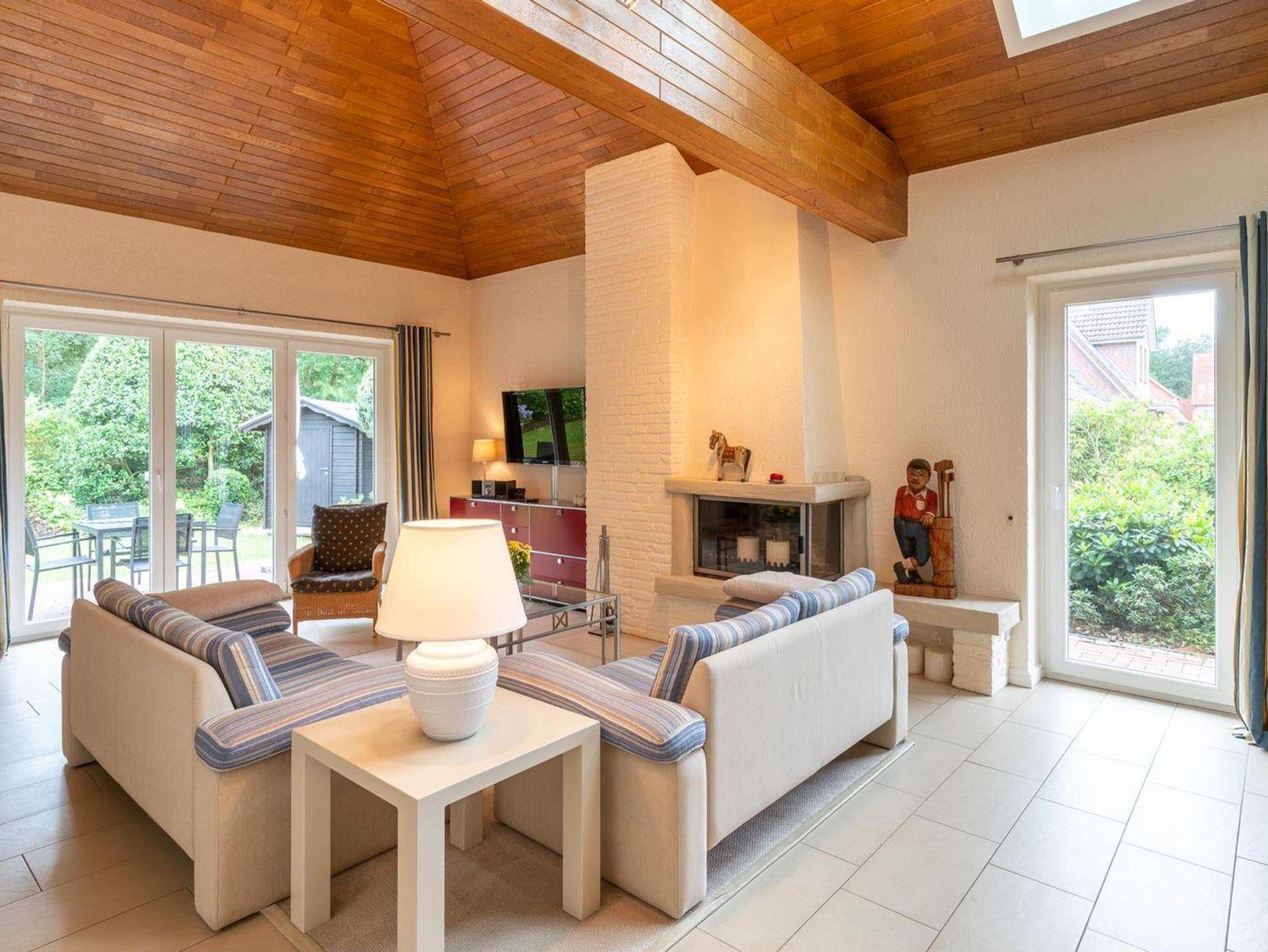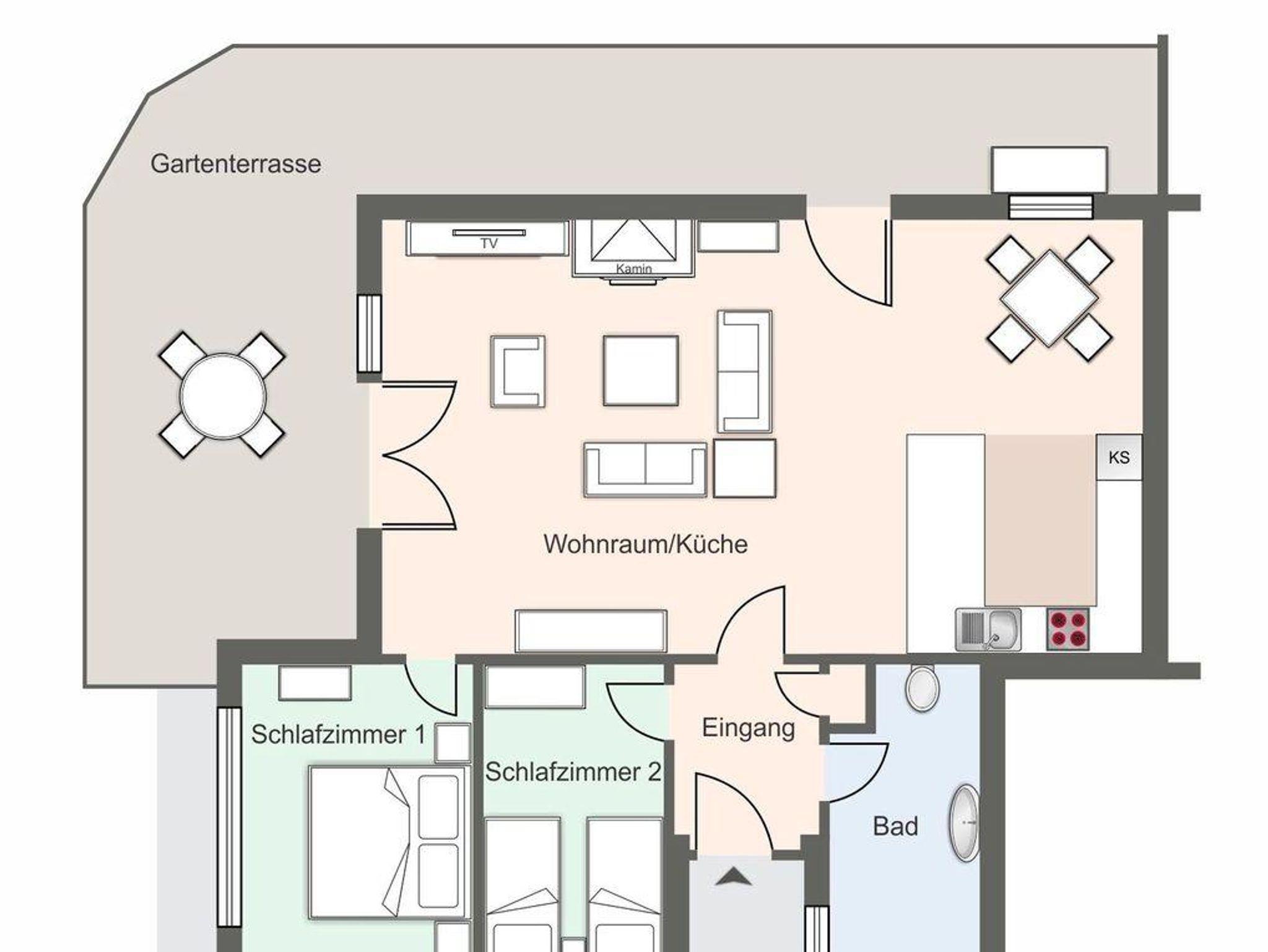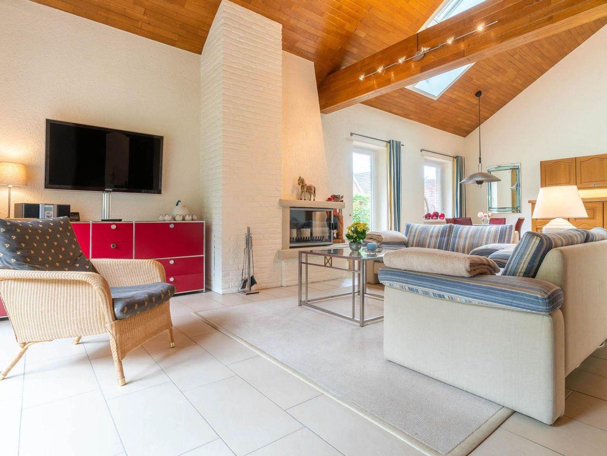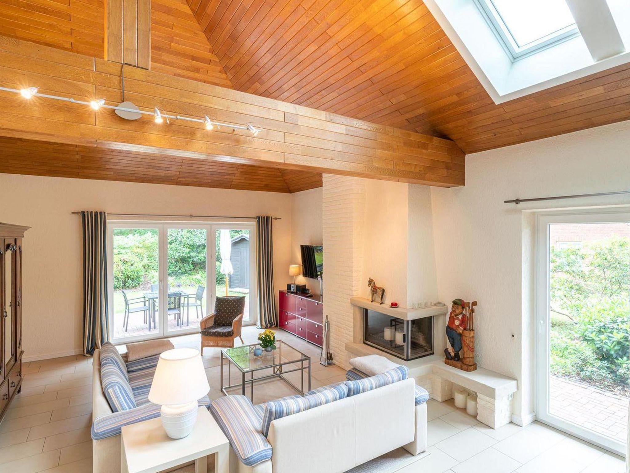 Die Bungalowhaushälfte verfügt über ca. 85m² Wohnfläche und teilt sich wie folgt auf: Im Erdgeschoss befindet sich der großzügige Wohnraum mit offener Balkendecke und einer Wohnküche mit Essbereich. Im Erdgeschoss ist ebenso ein Duschbad und ein Flur mit einer Garderobe von hier aus gelangen Sie jeweils ins Doppelschlafzimmer. Ein Schlafzimmer ist mit einem Doppelbett und ein weiteres mit 2 Einzelbetten ausgestattet. Vom Wohnzimmer gelangen Sie auf die Terrassen mit Blick in den wunderschön eingewachsenen Garten.