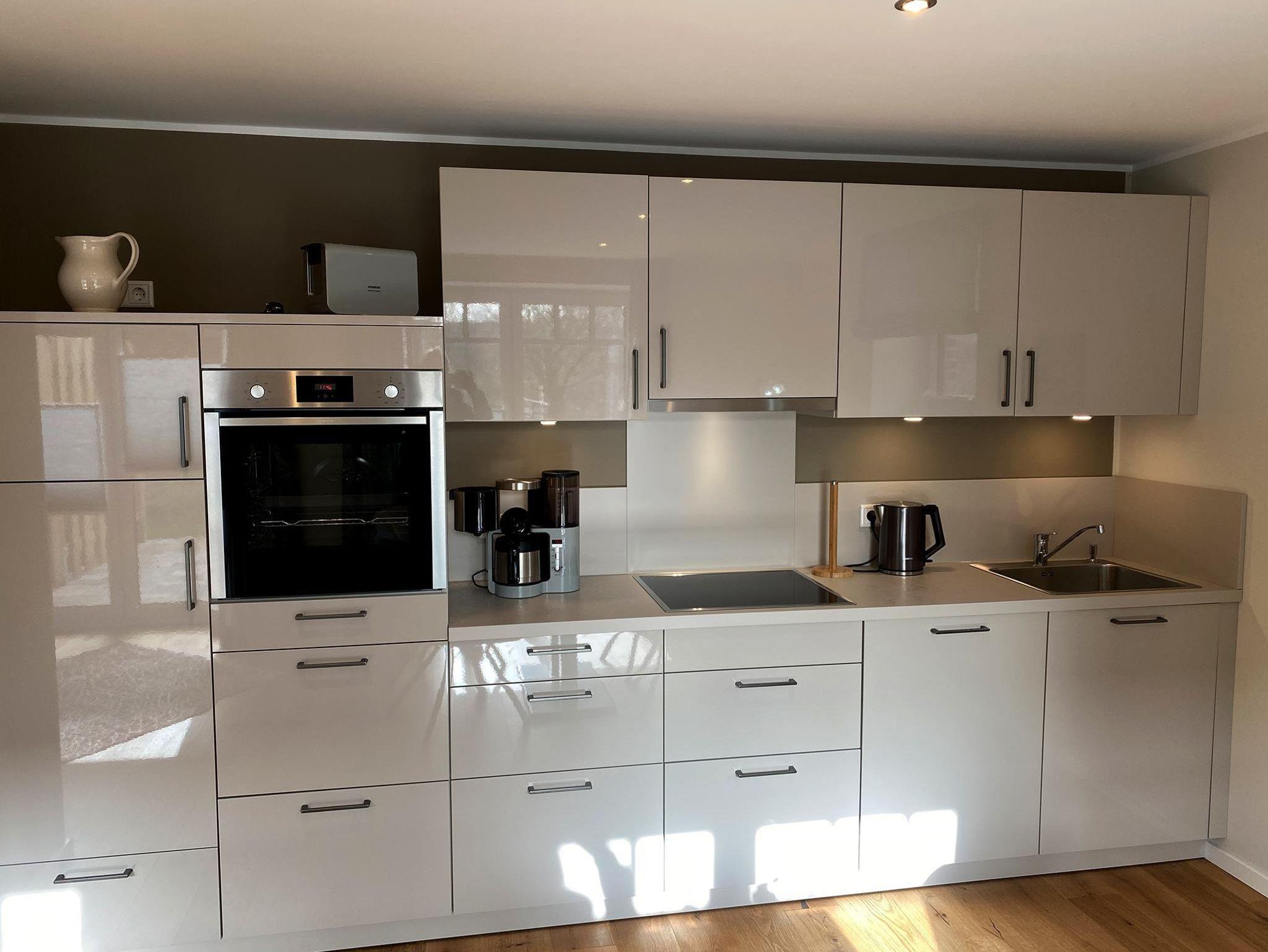 Küche: Küchenzeile, Geschirrspüler, Backofen, Ceranfeld, Kaffeemaschine, Wasserkocher, Toaster, Geschirr, Mixer, Töpfe, Pfannen usw.