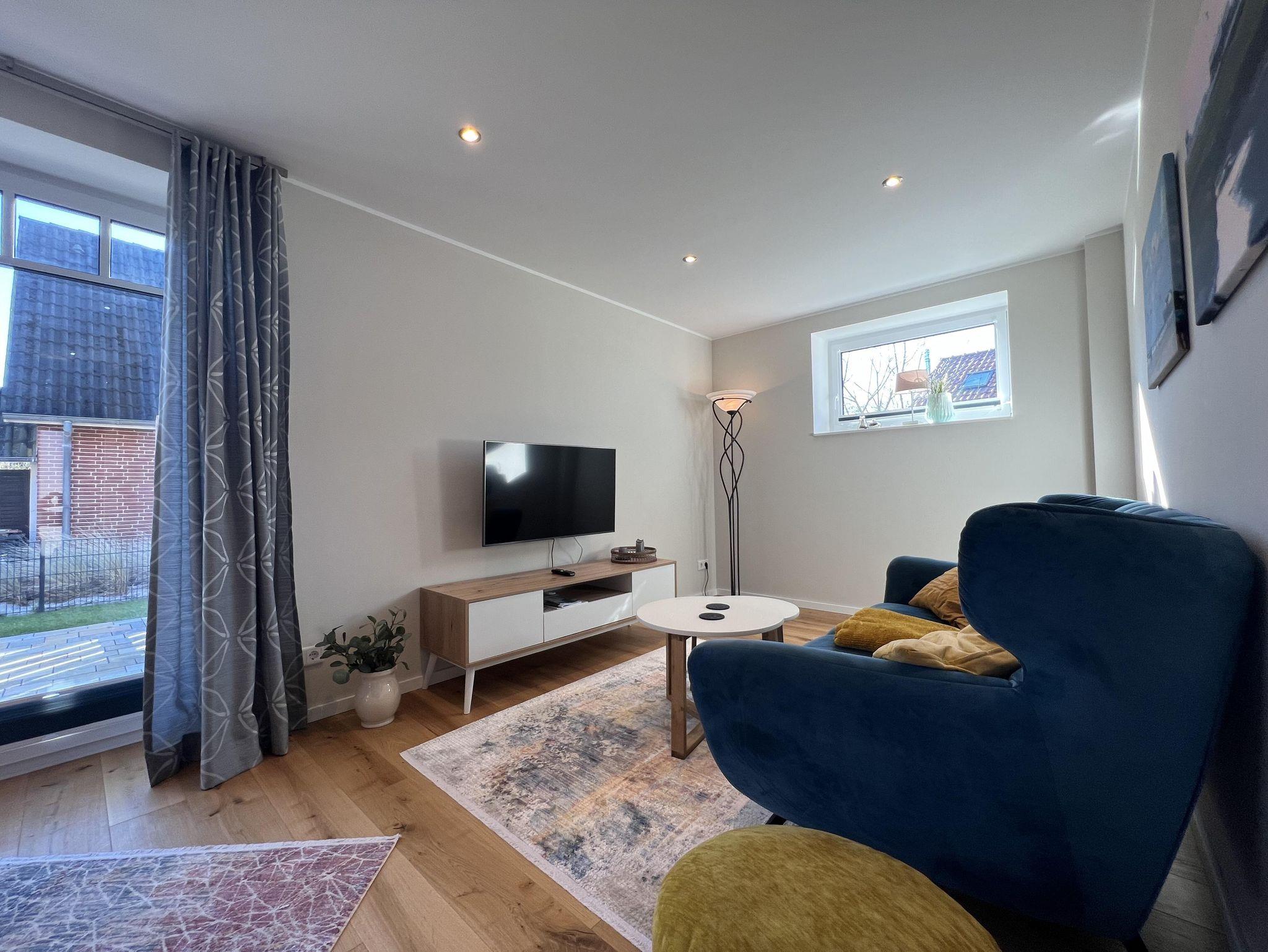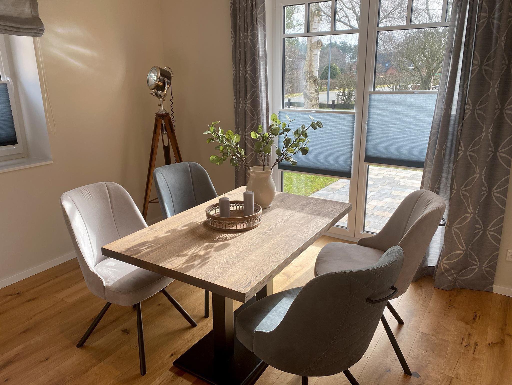 Wohnzimmer: Couch, Couchtisch, TV-Unterschrank, Flachbild-TV, Radio, Stehlampe, Essplatz mit 4 Stühlen.