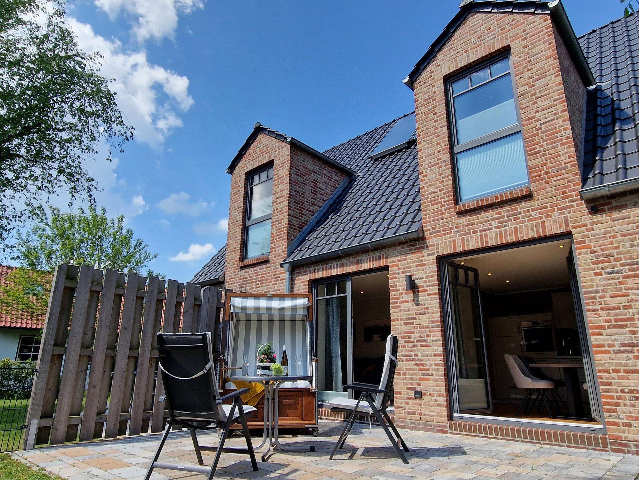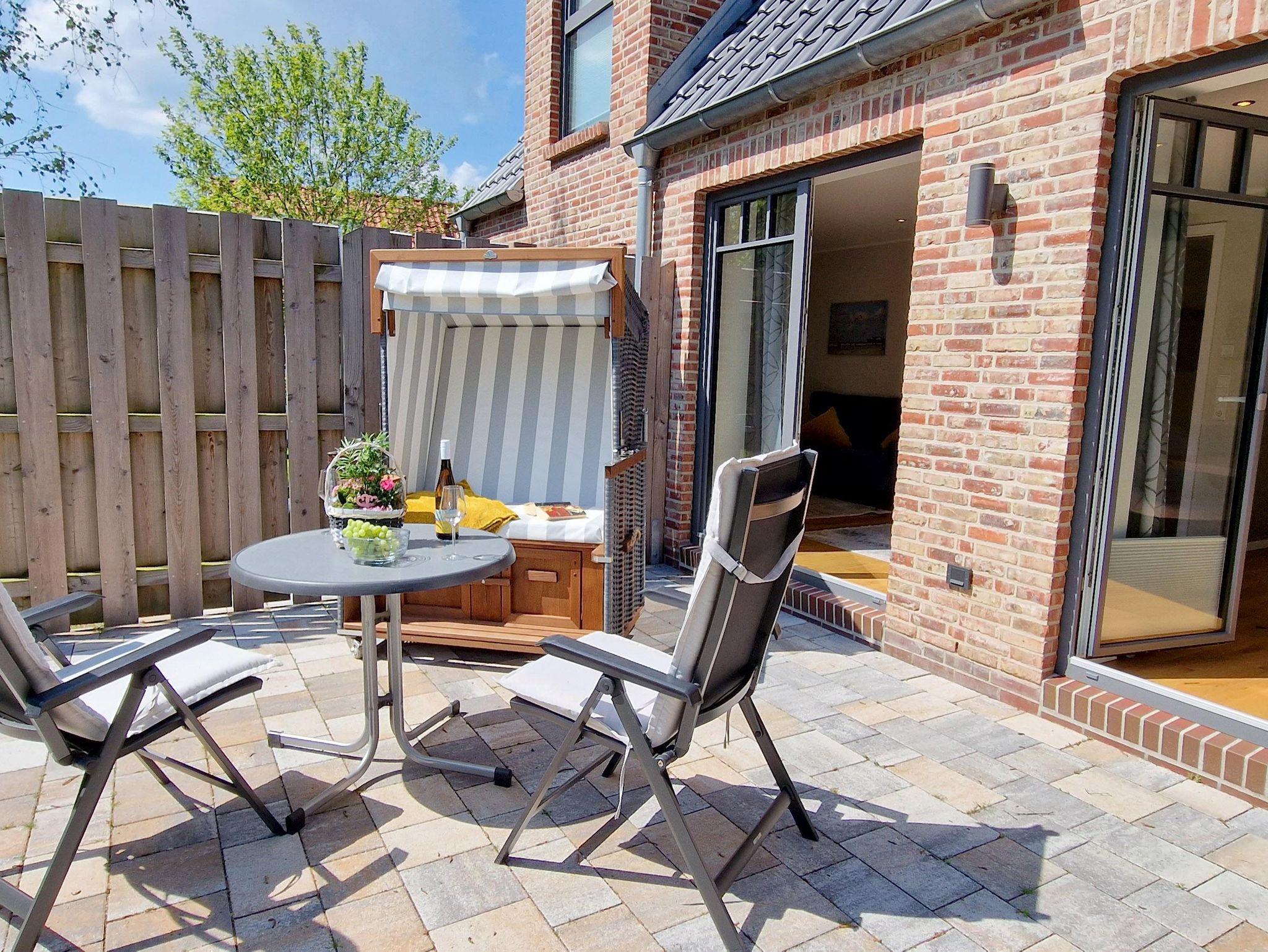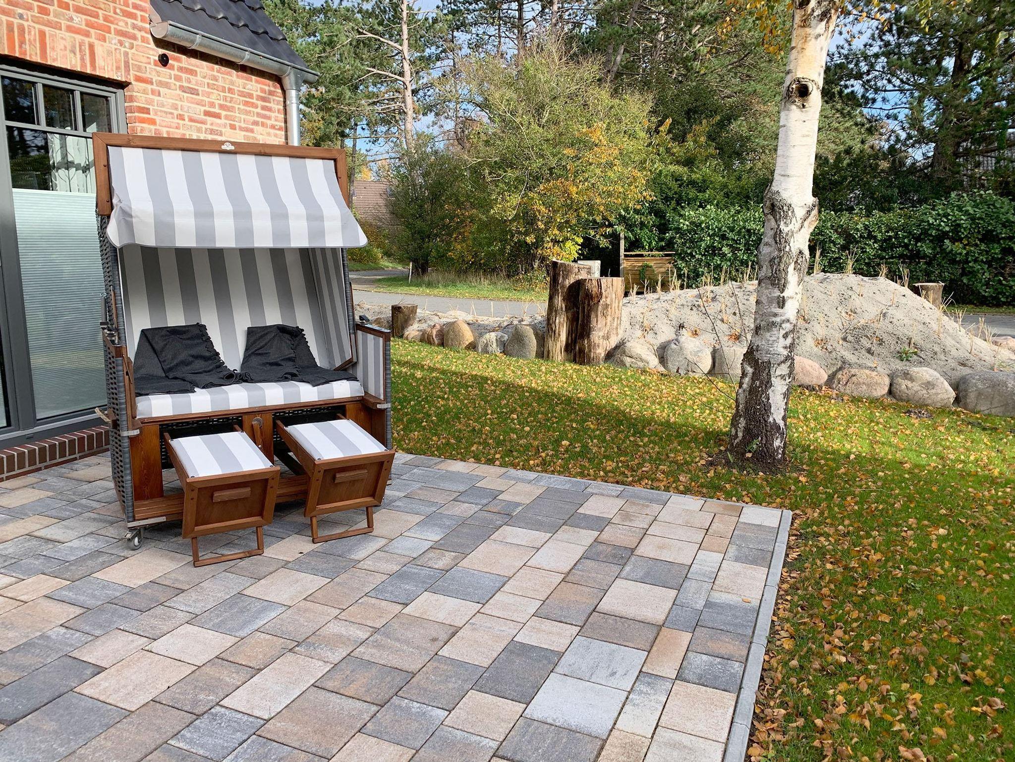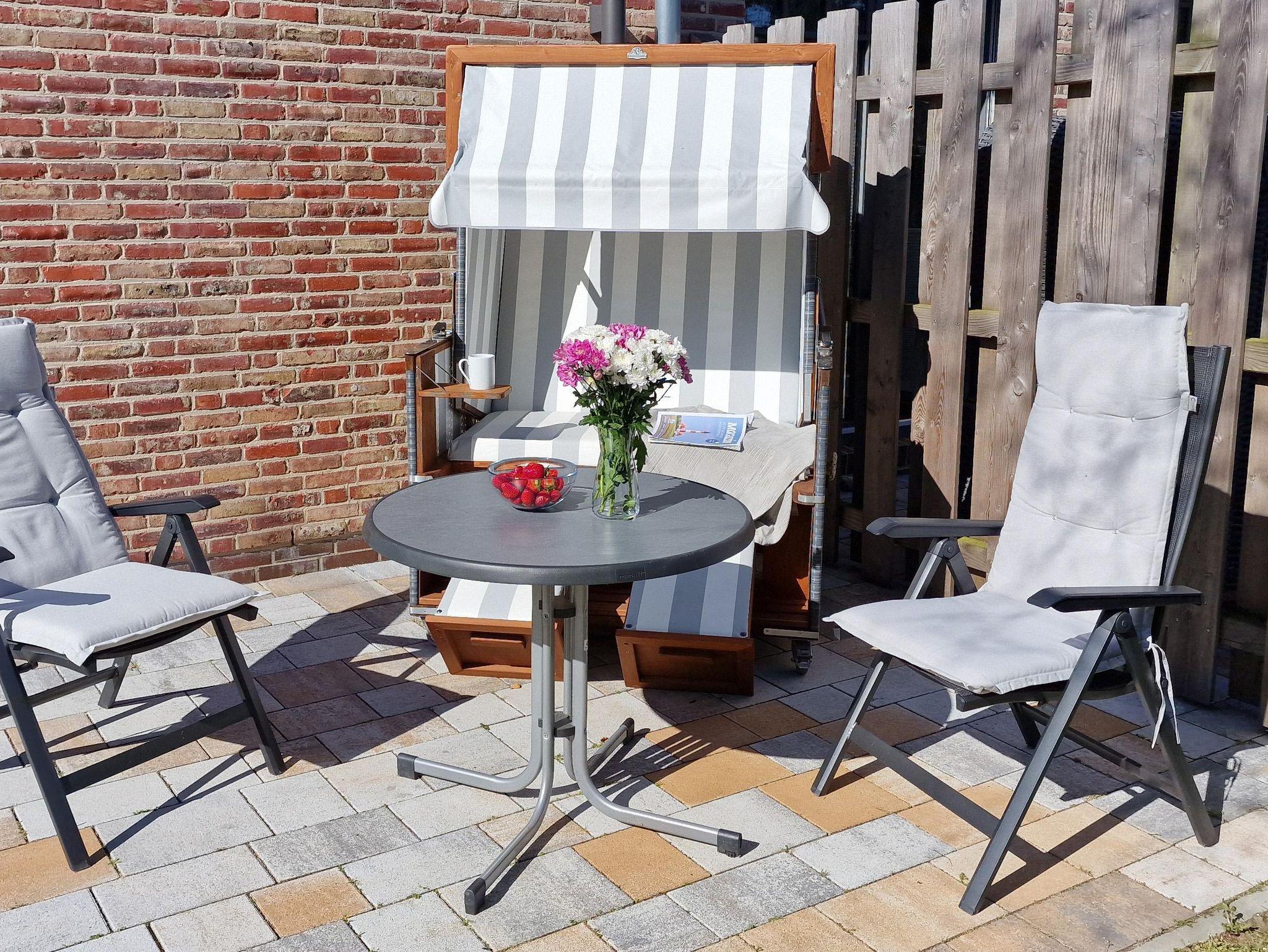 Terrasse: Terrasse mit Strandkorb und Gartenmöbeln und Zugang zum Garten