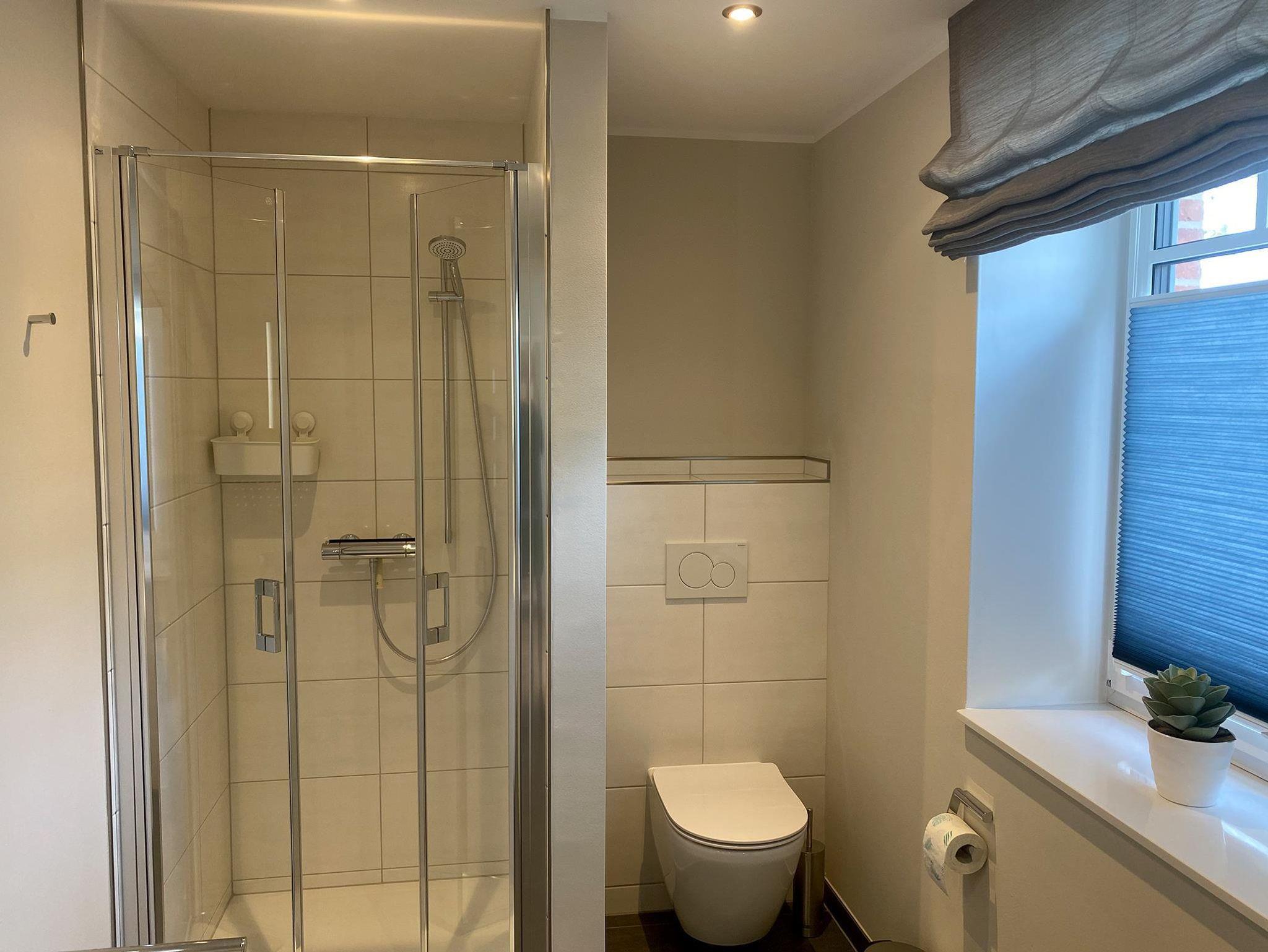 Bad: begehbare Dusche, WC, Wachbecken, Spiegel, Ablage, Waschmaschine;Wäscheständer.