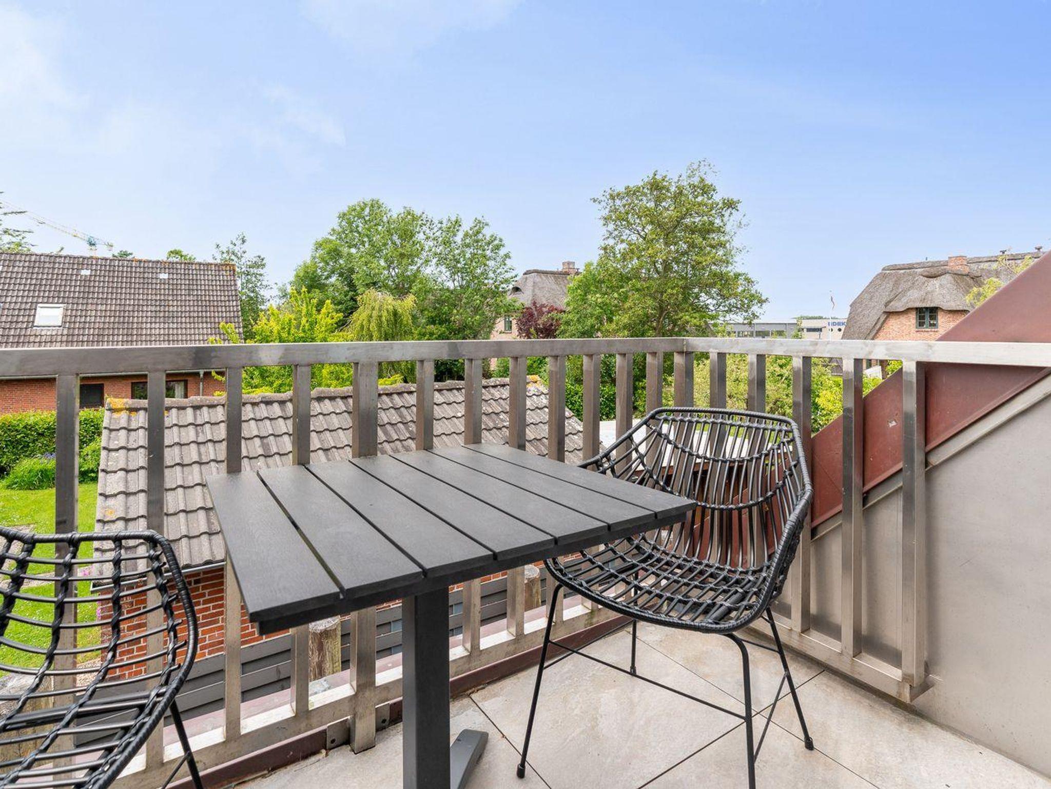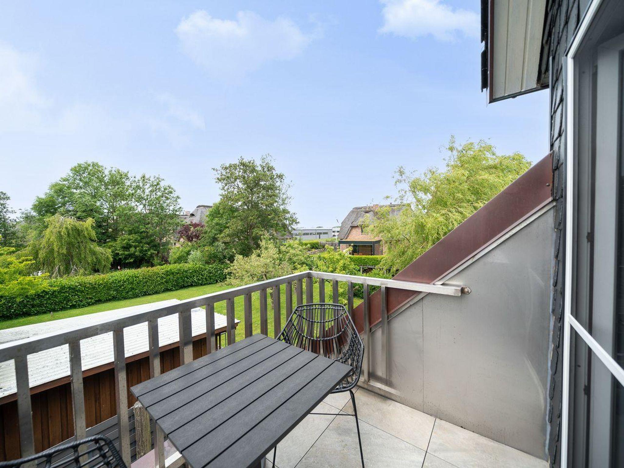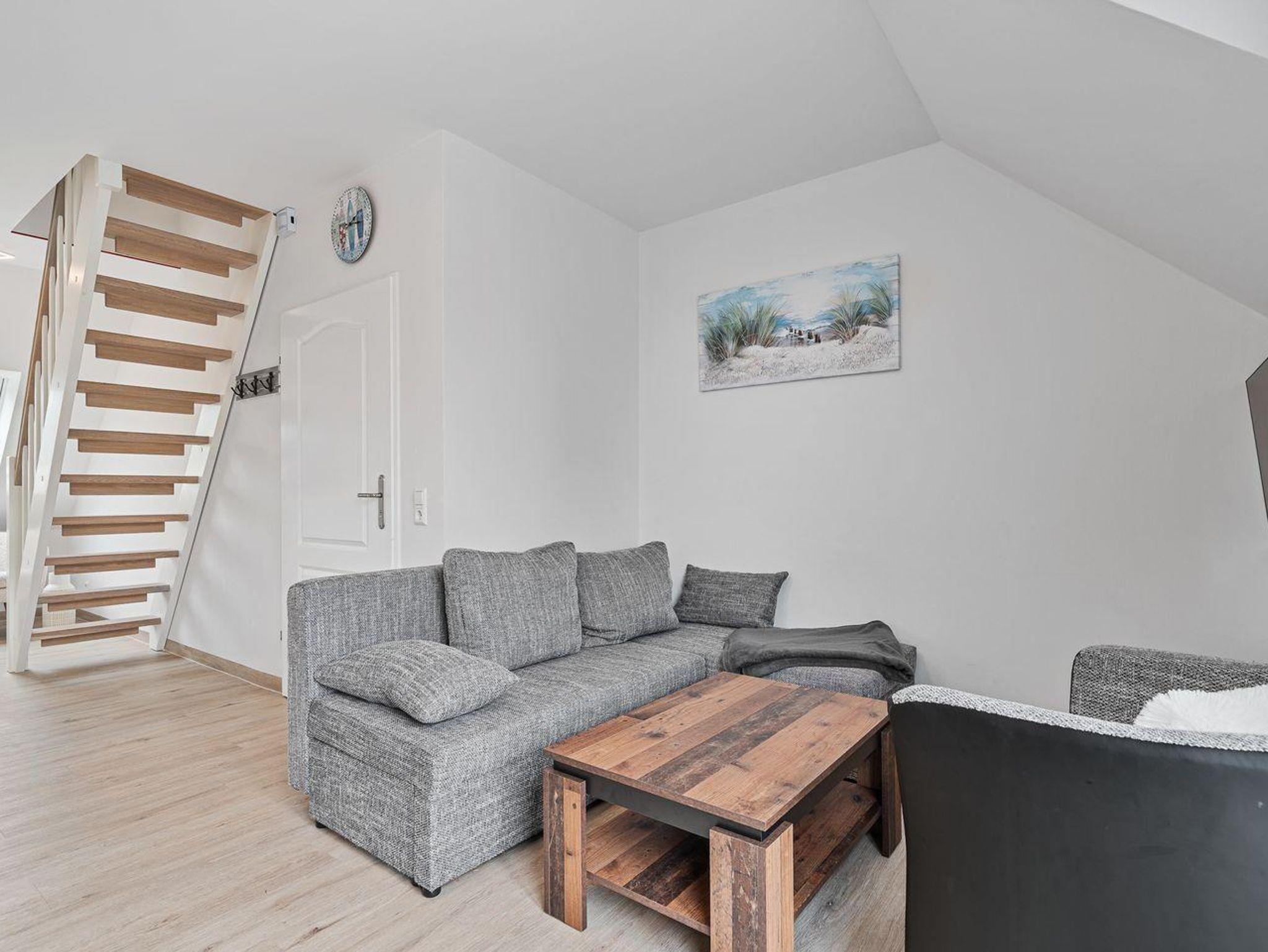 Im Hauptgeschoss erwarten Sie ein gemütlicher Wohnbereich mit Sofa, ein Elternschlafzimmer mit komfortablem Boxspringbett, die voll ausgestattete Küche mit Esstisch für vier Personen, Spülmaschine, Kaffeemaschine und Backofen sowie das moderne Bad mit Dusche und WC. Der Balkon lädt zum Entspannen ein.