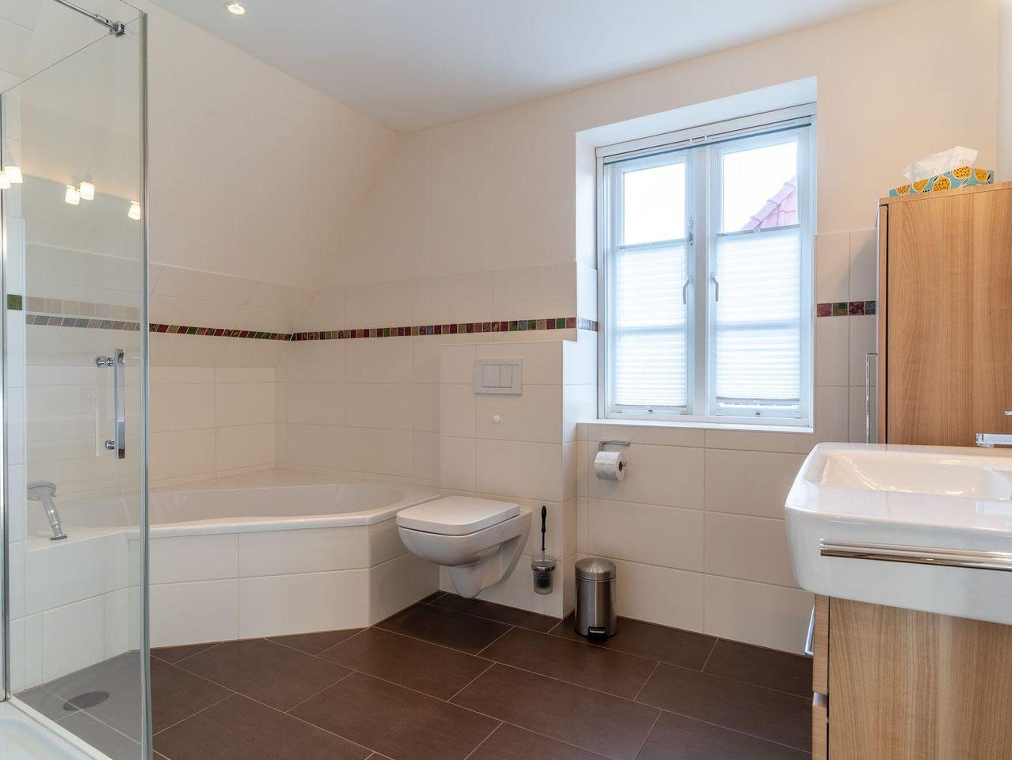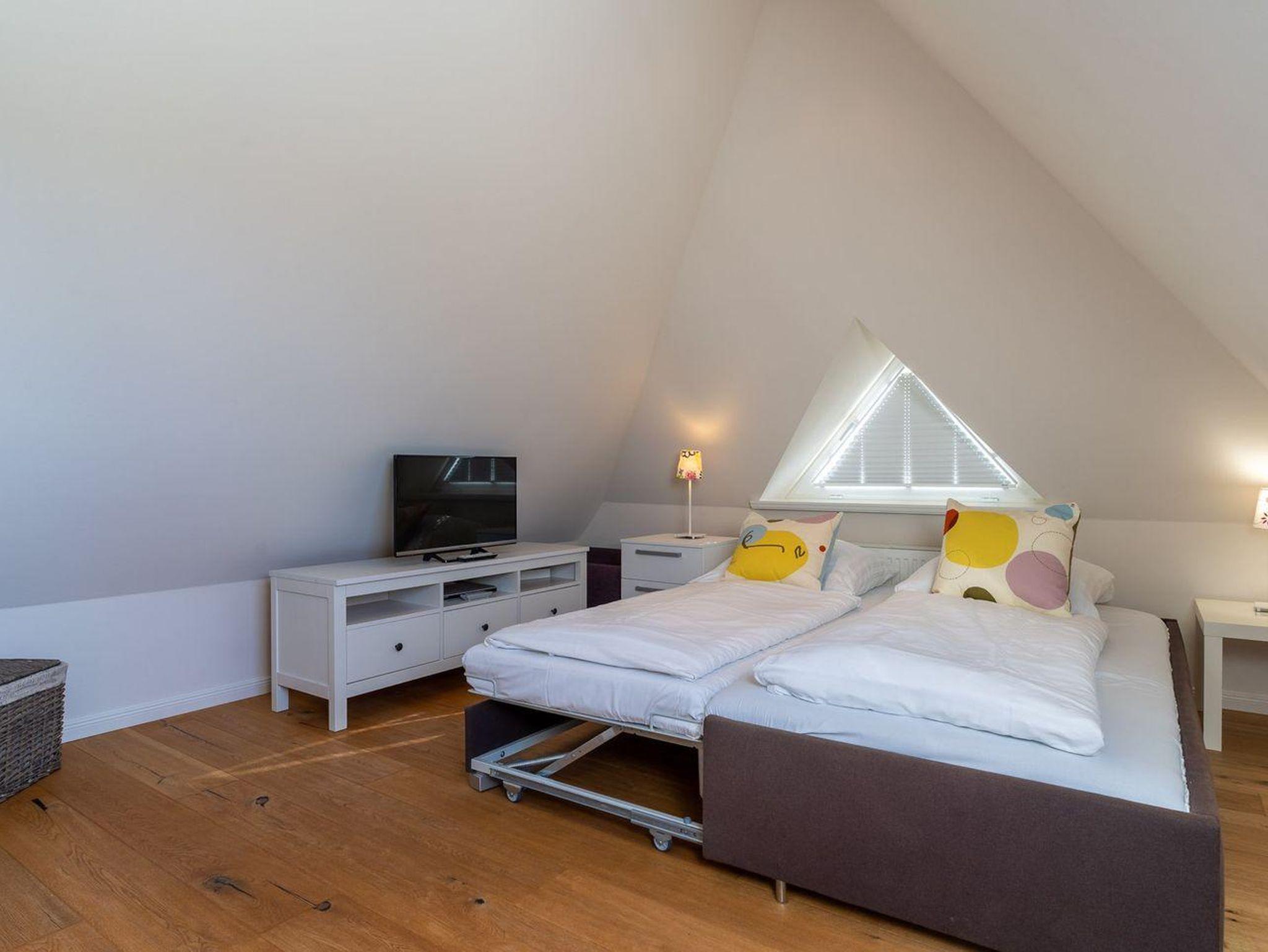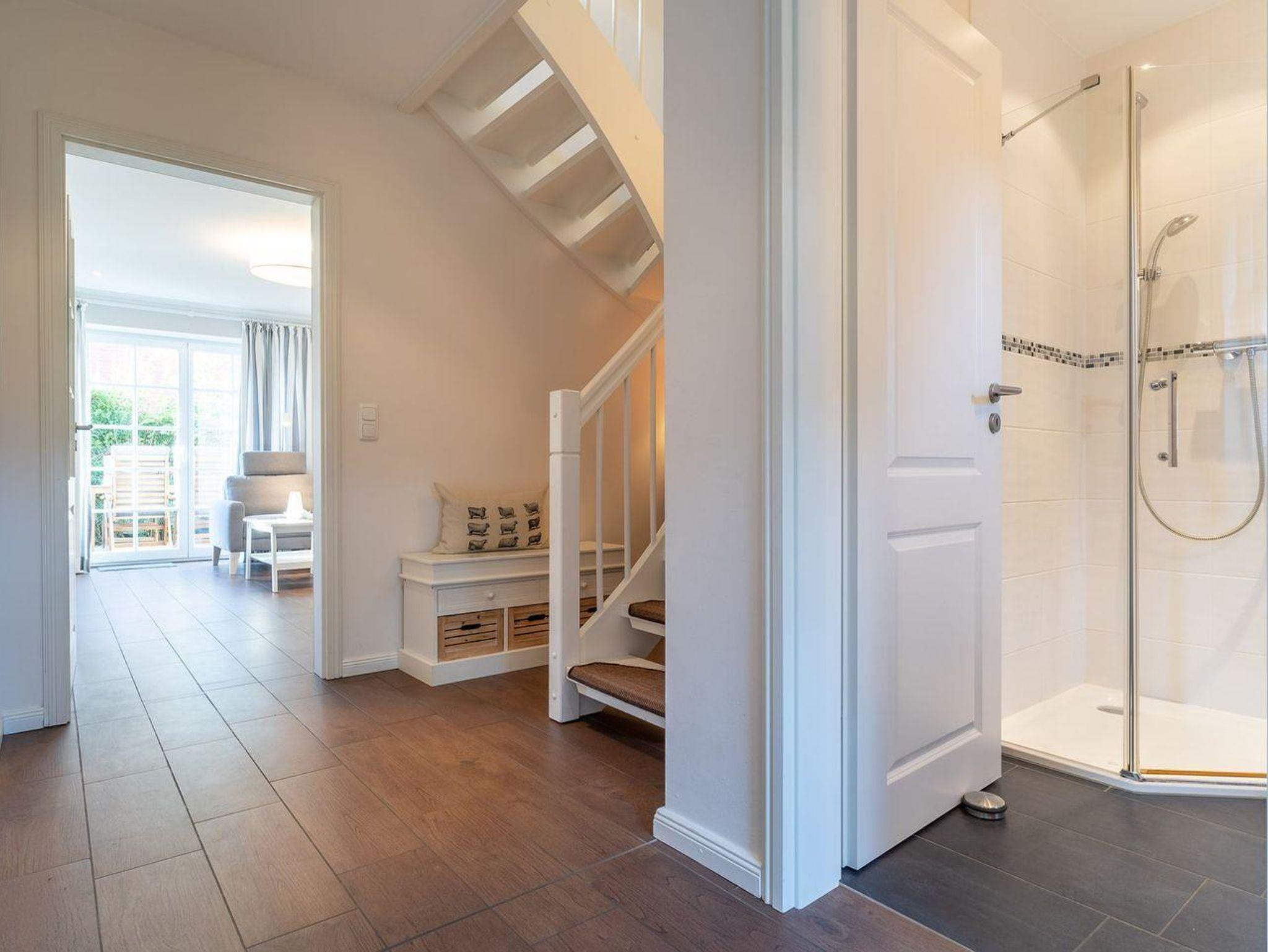 Im Erdgeschoss befindet sich der lichtdurchflutete Wohnraum mit TV, Kamin, einer offenen Küche sowie einem stilvollen Essbereich. Die Küche verfügt über hochwertige Elektrogeräte. An den Wohnbereich schließen sich ein Flur, ein Duschbad und ein Abstellraum. Über eine Holztreppe gelangen Sie in das Obergeschoss mit zwei großzügigen Schlafzimmern, ein Doppelschlafzimmer und ein Schlafzimmer mit zwei Einzelbetten. Die Schlafzimmer sind mit geräumigen Schränken ausgestattet, in einem finden Sie zudem einen Schreibtisch an dem es sich prima von Zuhause aus arbeiten lässt. Darüber hinaus befindet sich im Obergeschoss ein weiteres, geräumiges Bad mit Dusche und einer Eckbadewanne. Über eine weitere Holztreppe geht es vom Flur ins Dachgeschoss mit einem gemütlichem Doppelbett. Im Erd- und Obergeschoss sorgt eine Fußbodenheizung für ein angenehmes Raumklima.
