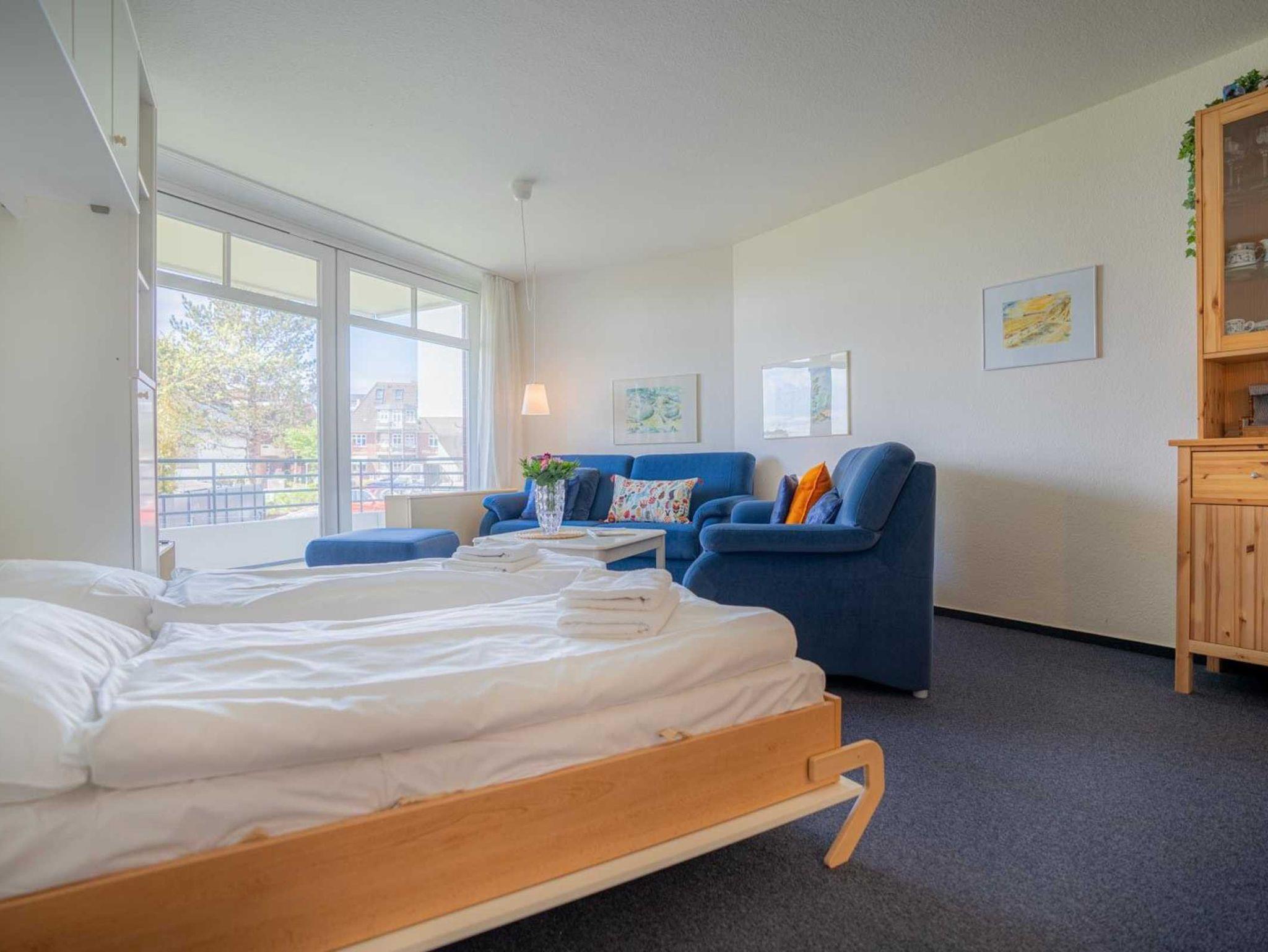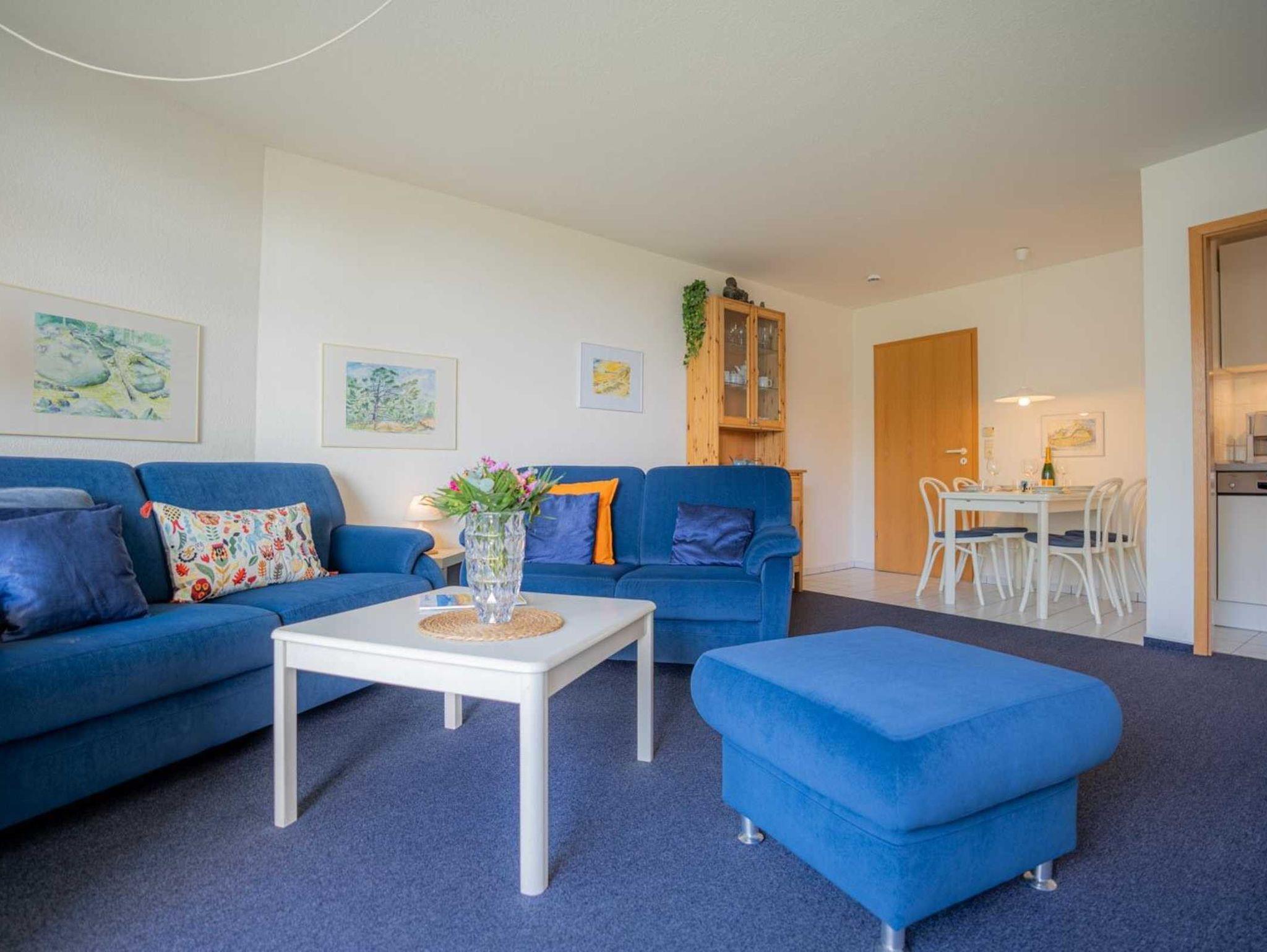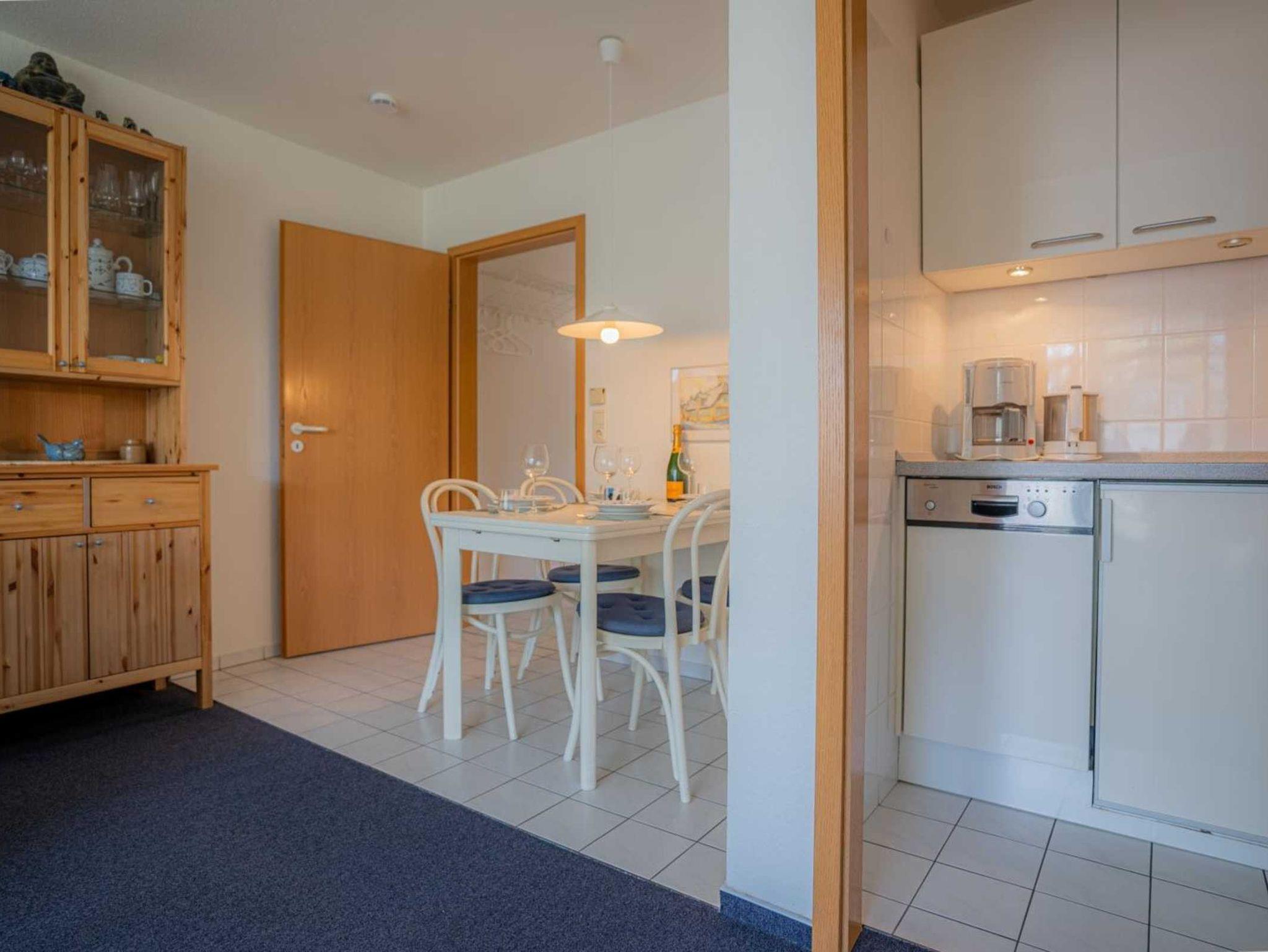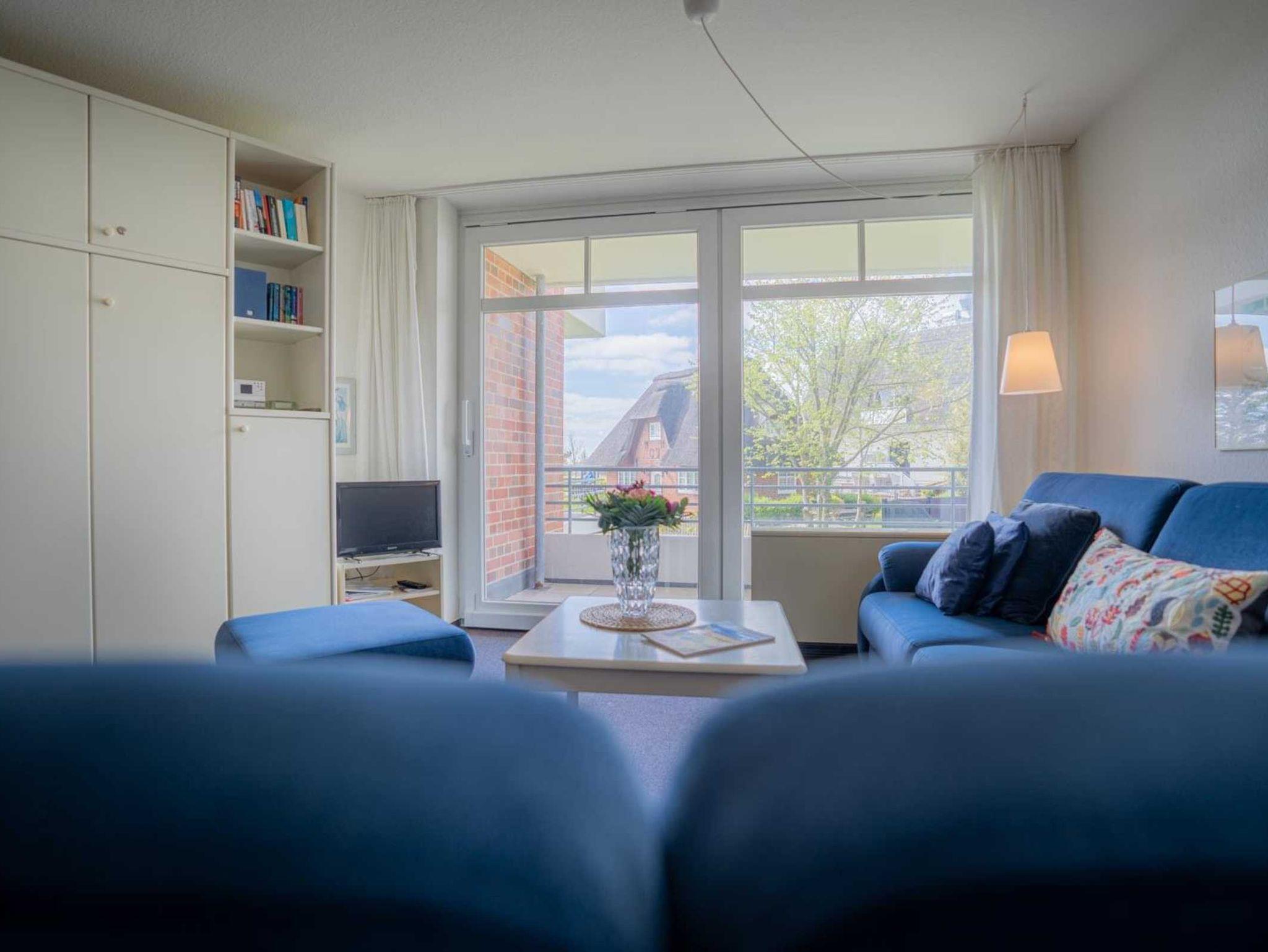 Wohnzimmer mit 2 Sofas (2er), ausklappbarem Schrank-Doppelbett (2x 80x200cm), TV (Kabel), Hifi-Anlage und Esstisch mit 4 Stühlen. Direkter Zugang zum möblierten Balkon nach Westen mit herrlichem Ausblick an einem schönen Reetdachhaus vorbei und über die Deichpromenade bis an den Strand und das Meer. Halboffene Küche mit Herd mit 2 Ceran-Kochstellen, Kühlschrank mit Gefrierfach und Geschirrspüler.