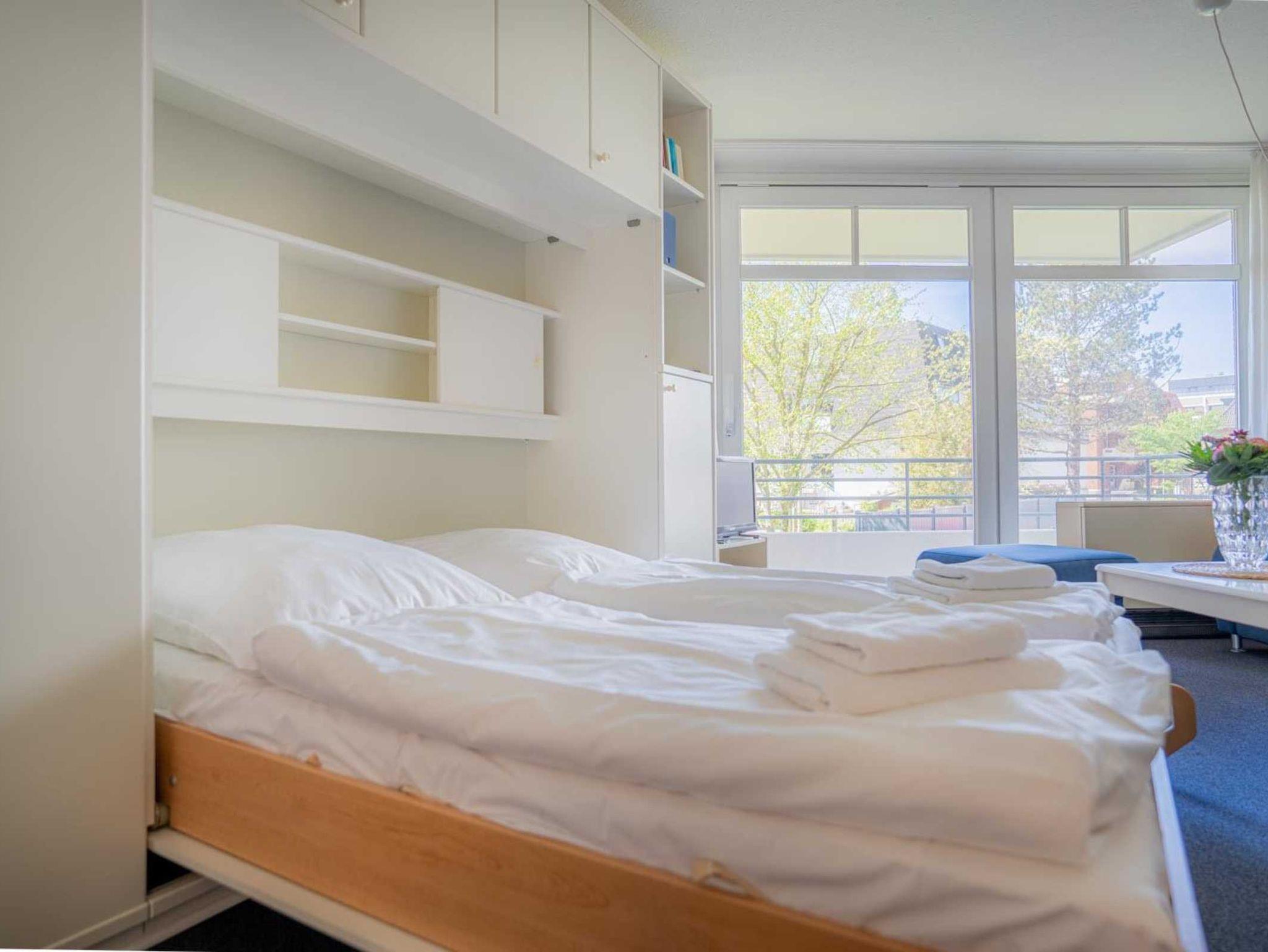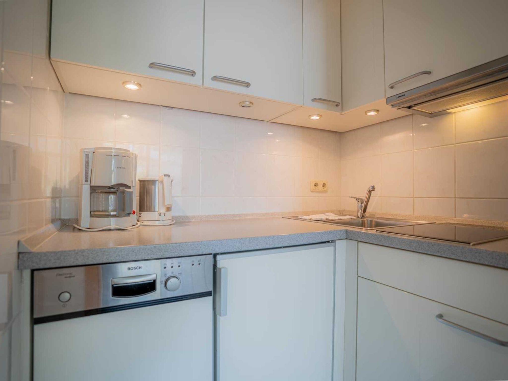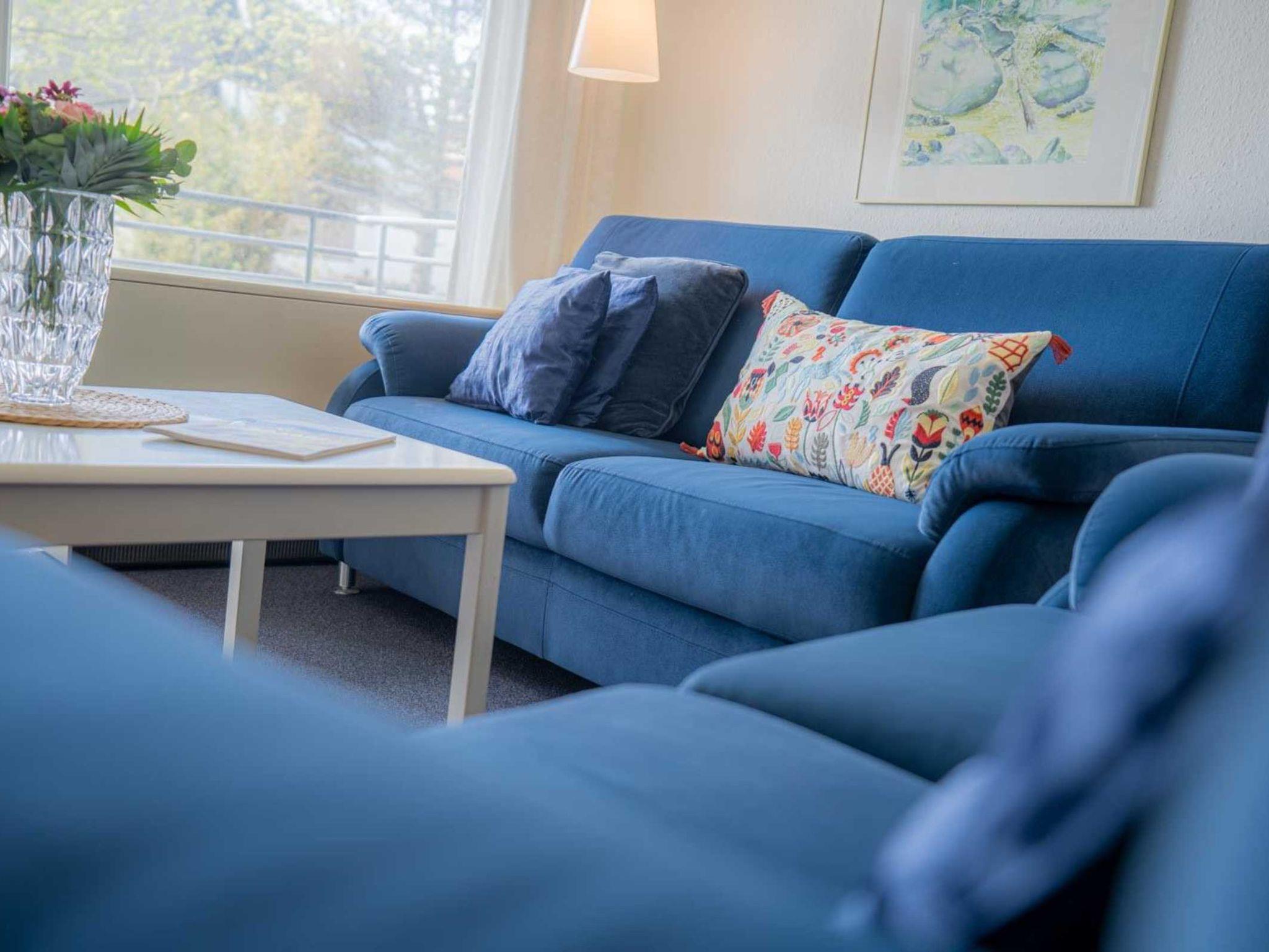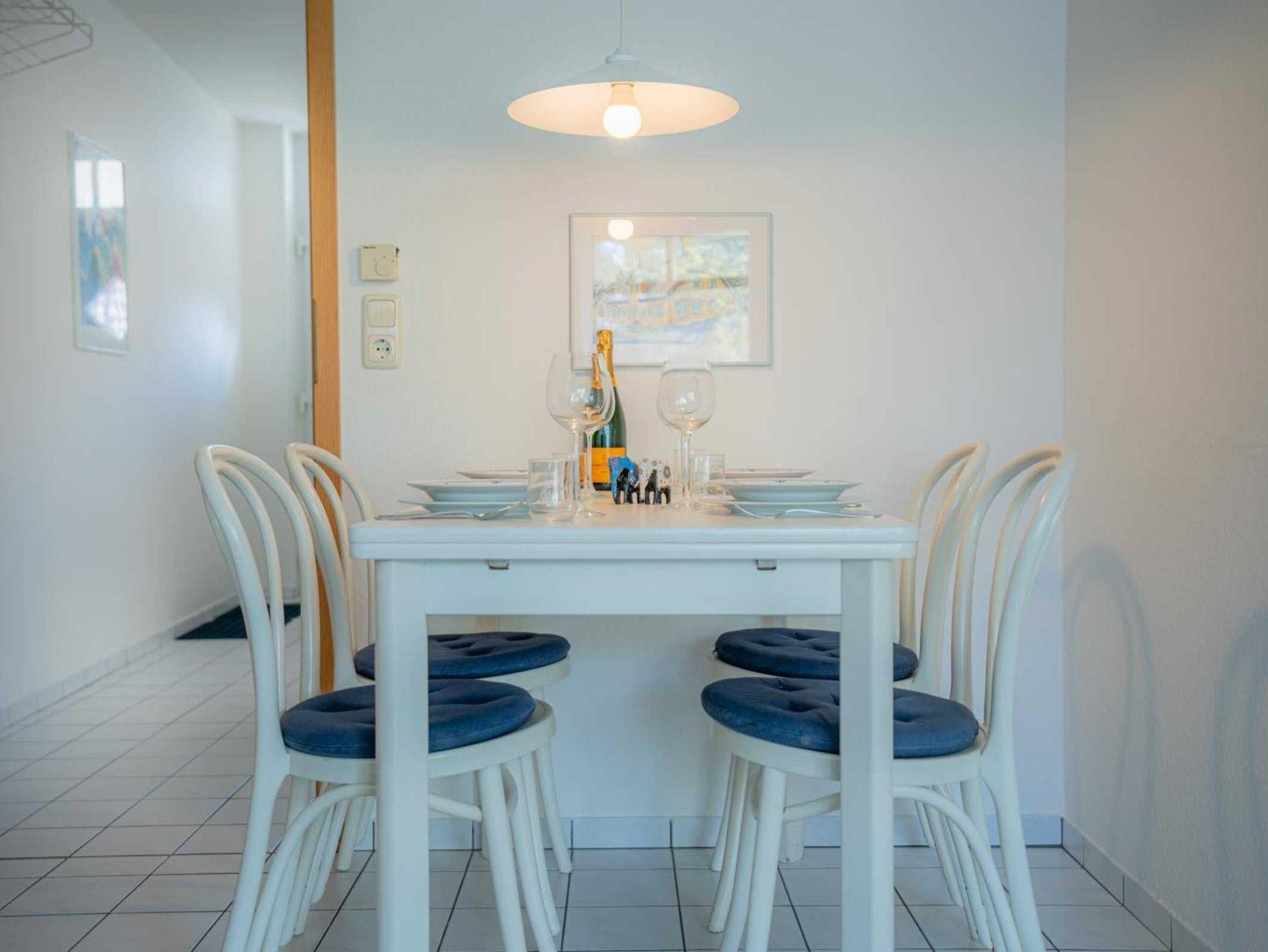 Wohnzimmer mit 2 Sofas (2er), ausklappbarem Schrank-Doppelbett (2x 80x200cm), TV (Kabel), Hifi-Anlage und Esstisch mit 4 Stühlen. Direkter Zugang zum möblierten Balkon nach Westen mit herrlichem Ausblick an einem schönen Reetdachhaus vorbei und über die Deichpromenade bis an den Strand und das Meer. Halboffene Küche mit Herd mit 2 Ceran-Kochstellen, Kühlschrank mit Gefrierfach und Geschirrspüler.