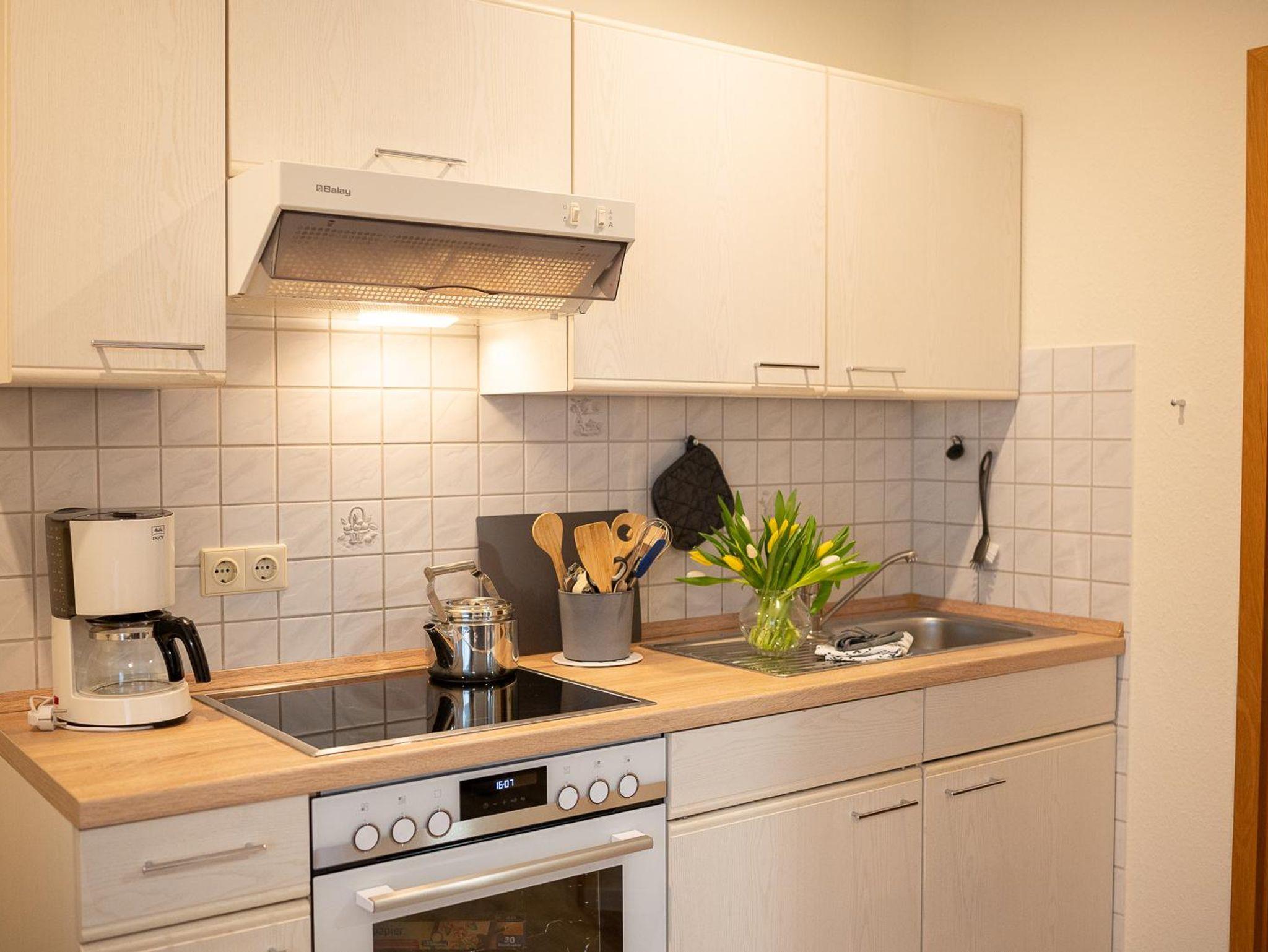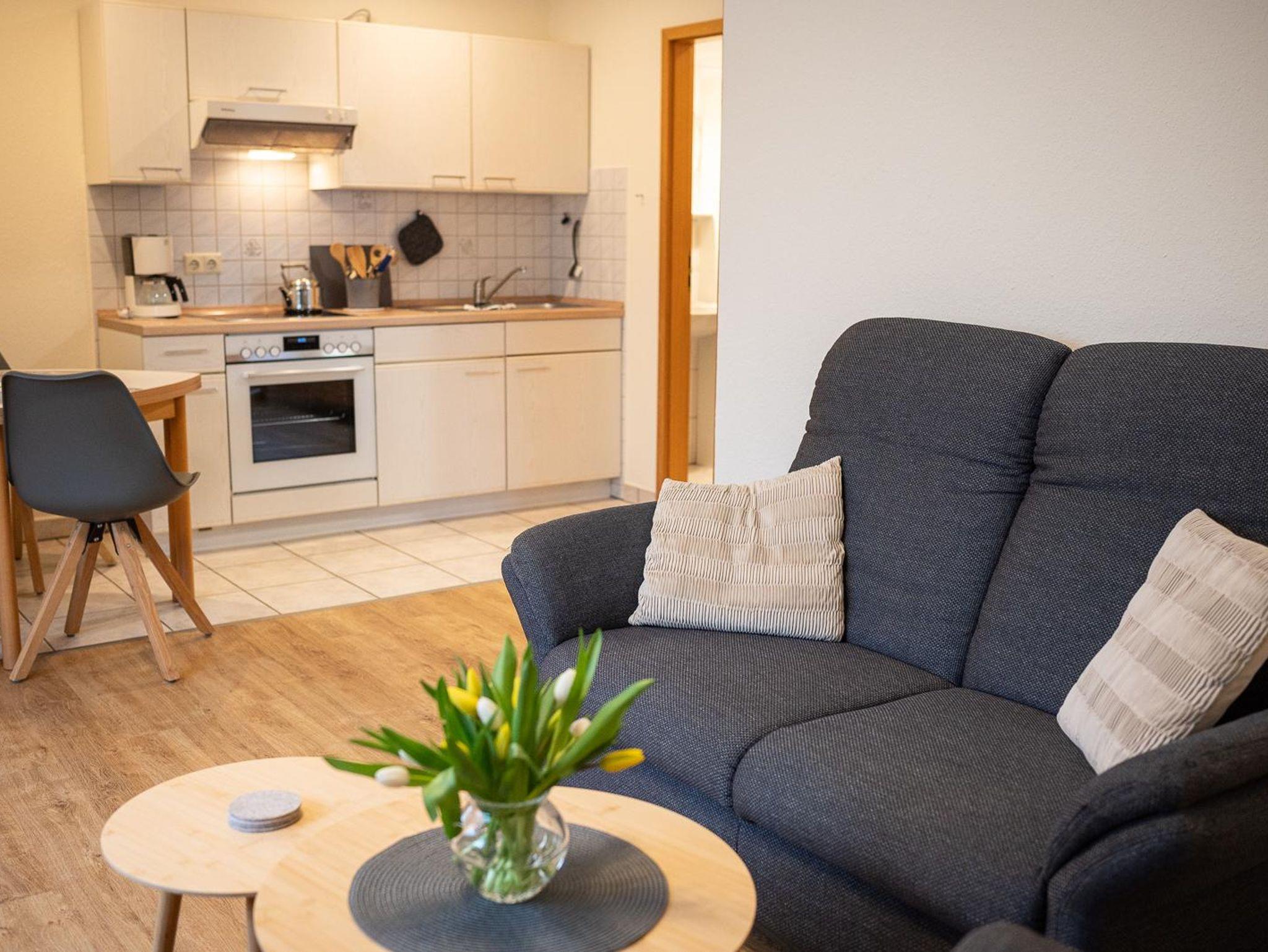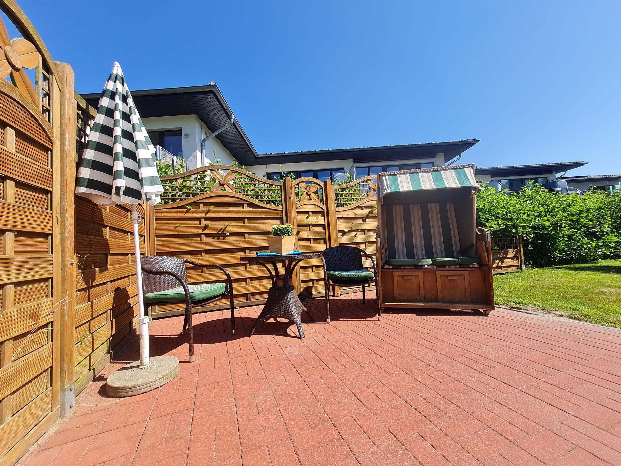 Die Ferienwohnung ist ca. 40qm groß, hat einen separaten Eingang mit Terrasse. Der gemütliche Wohnraum ist mit einer komplett eingerichteten Küche, einer Essecke, einer Sitzgarnitur und einem Fernseher ausgestattet. Im Schlafzimmer befinden sich ein Doppelbett, Nachttische und ein Kleiderschrank. Ferner sind ein Flur mit Garderobe, sowie eine Dusche mit WC vorhanden. Im Garten stehen Ihnen Gartenmöbel und ein Strandkorb mit zur Verfügung.