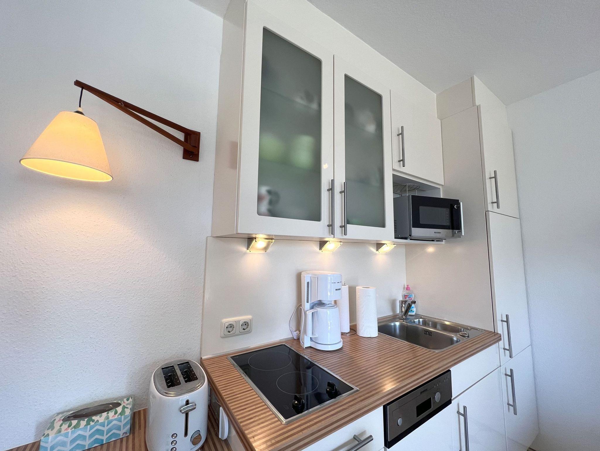 Mit Weitblick! Die geschmackvolle, gemütliche 2-Zimmer-Ferienwohnung Atlantis Nr. 08 in St. Peter-Bad liegt im 2. Obergeschoss und besitzt eine gut ausgestattete, Küchenzeile mit Cerankochfeld. Schlaf finden Sie mit bis zu 2 Personen in einem kleinen Doppelbett im Schlafzimmer, oder auf der gemütlichen Schlafcouch im Wohnbereich. Der Balkon in Süd- Westlage bietet durch die Bäume einen kleinen Meeresblick. Ein Pkw-Stellplatz auf dem Grundstück, Nr. 8