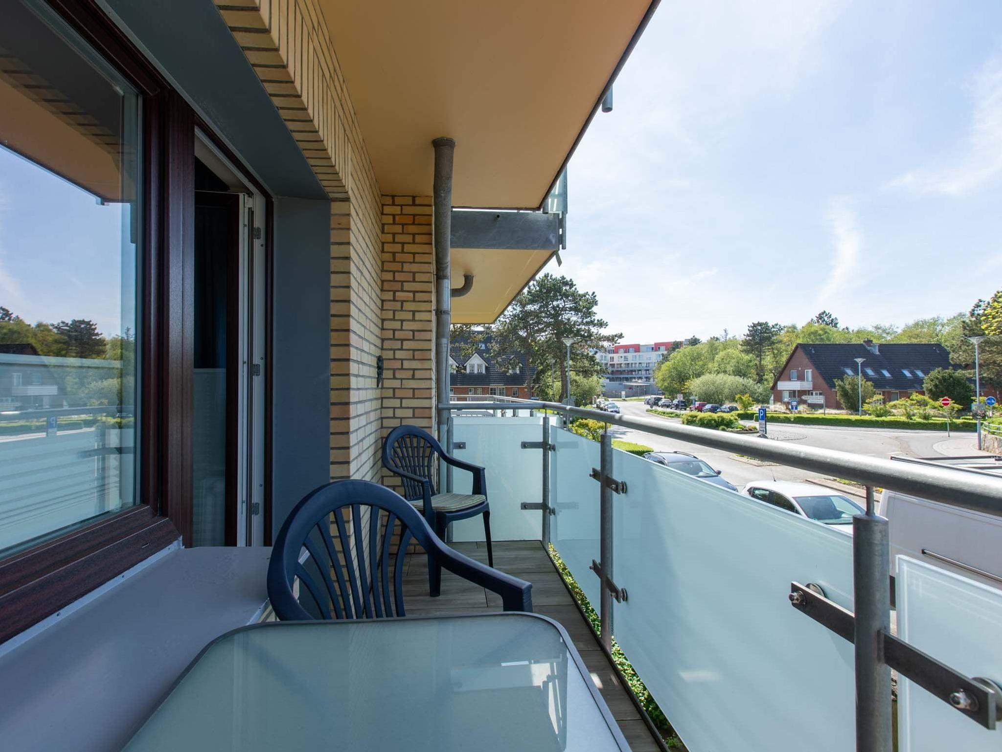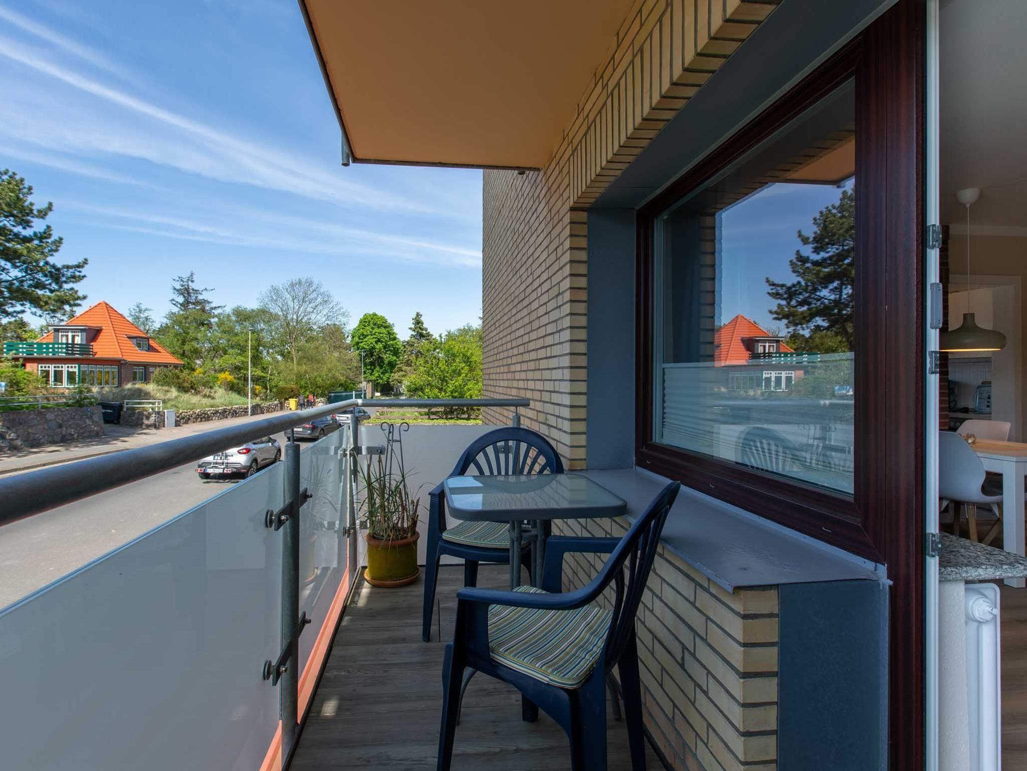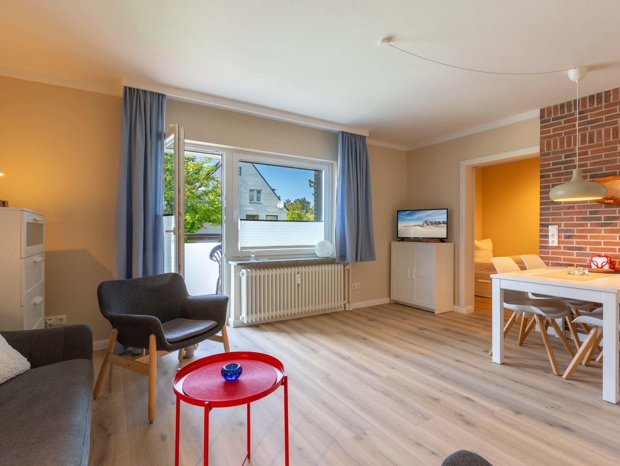 Wohnzimmer mit Sofa, zwei Sesseln, TV (Sat) und Esstisch mit vier Stühlen. Direkter Zugang zum möblierten Balkon nach Westen.