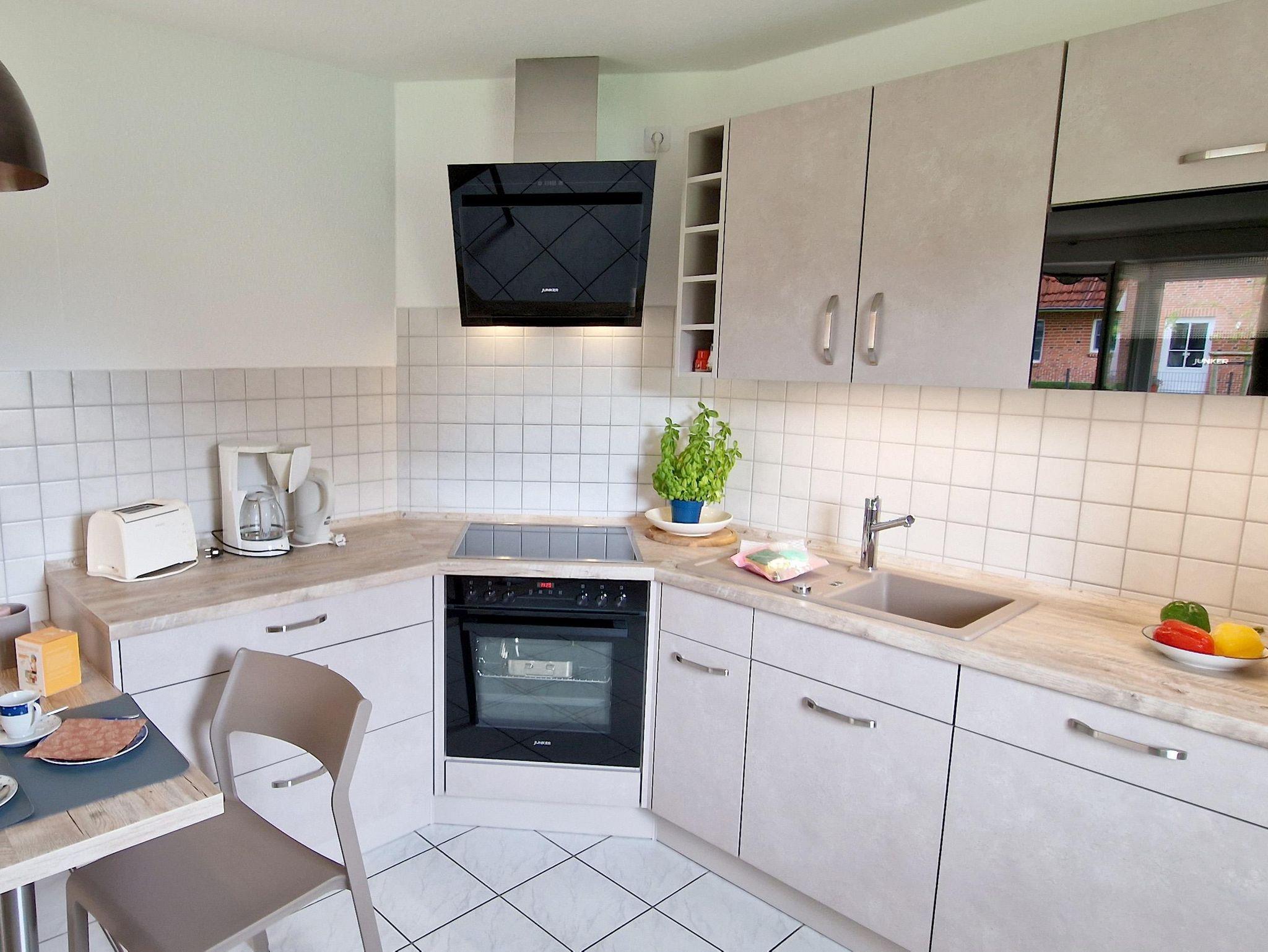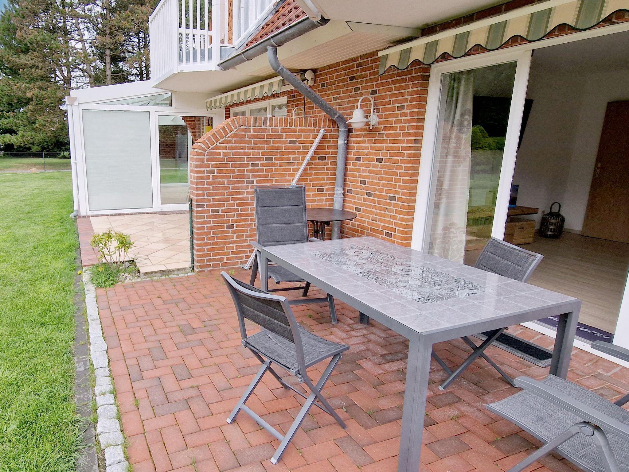 Die gut ausgestattete 2-Zimmer-Ferienwohnung Zum Leuchtturm 12 Nr. 02 für 4 Personen liegt im Erdgeschoss des Hauses. Neben dem Schrankdoppelbett im Wohnzimmer gibt es ein separates Schlafzimmer mit 2 Einzelbetten. Die schön große Küchenzeile ist u.a. mit einem 4-Plattenherd und einem Backofen bestückt. Auf der sonnigen Terrasse in Süd- Westlage können Sie geschützt unter der Markise sitzen.